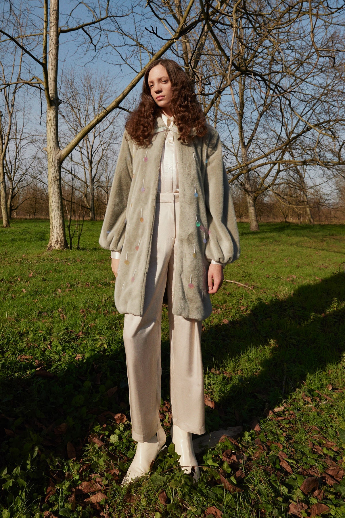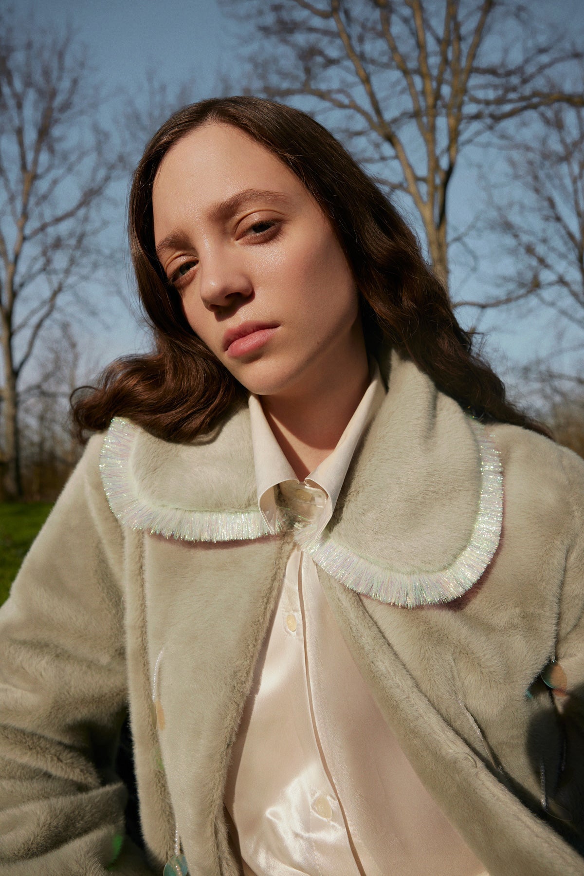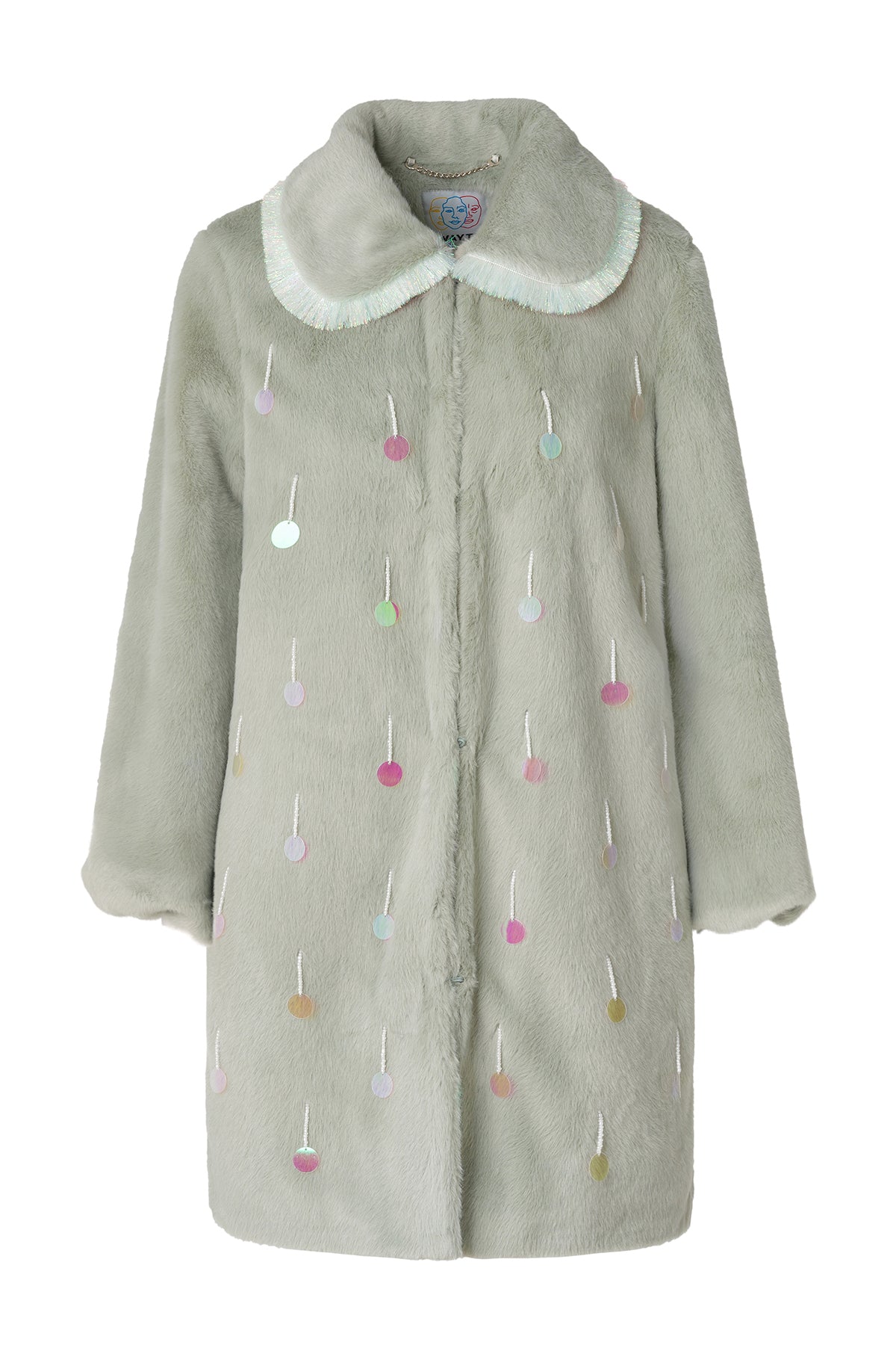 Aurora coat refers to the fascinating Aurora Lights and it is designed to impress with its meticulously tailored sequins that shine as you move. With its Peter Pan collar and the iridescent decoration surrounding it, it offers a cute look. Pretty sure you will magnetize everyone with the pastel tones of the Nordics.