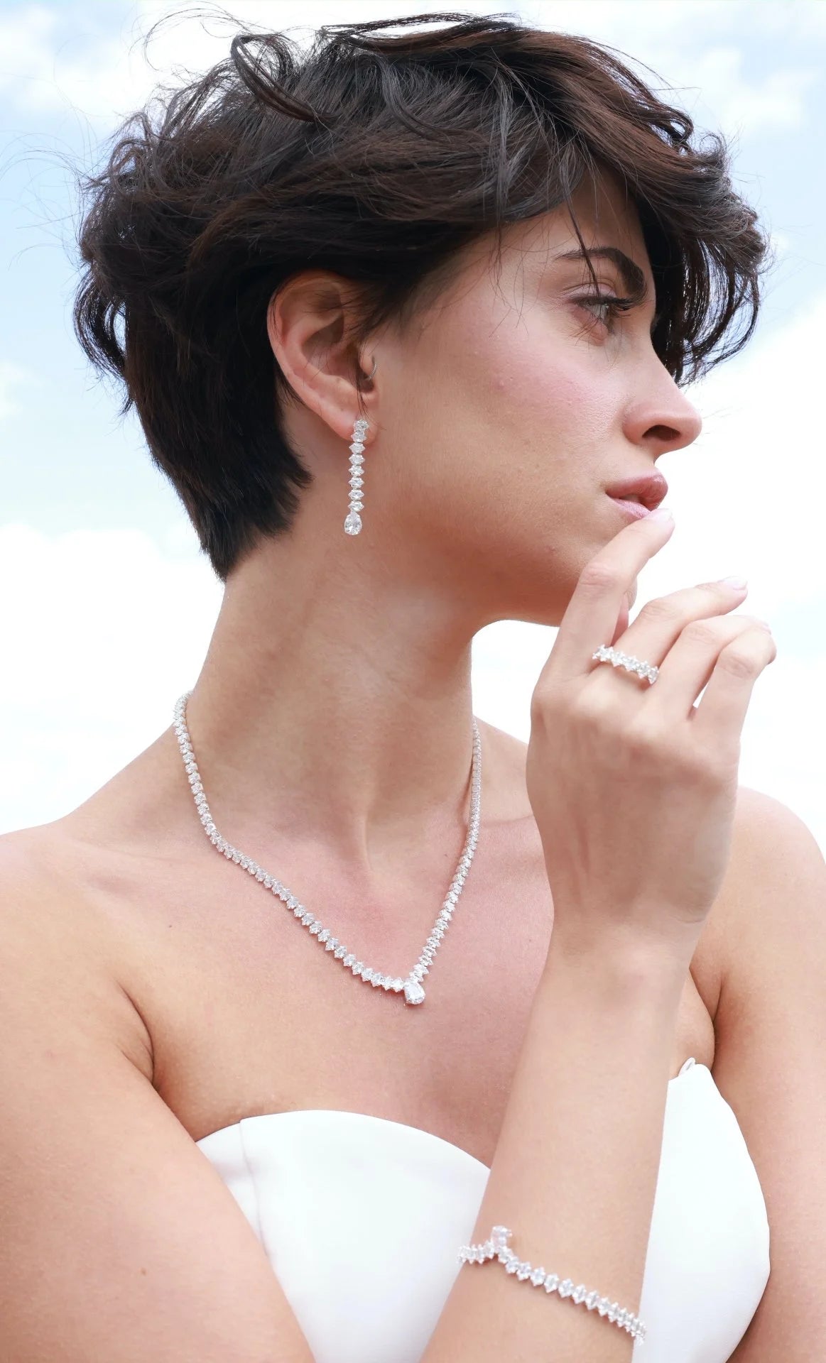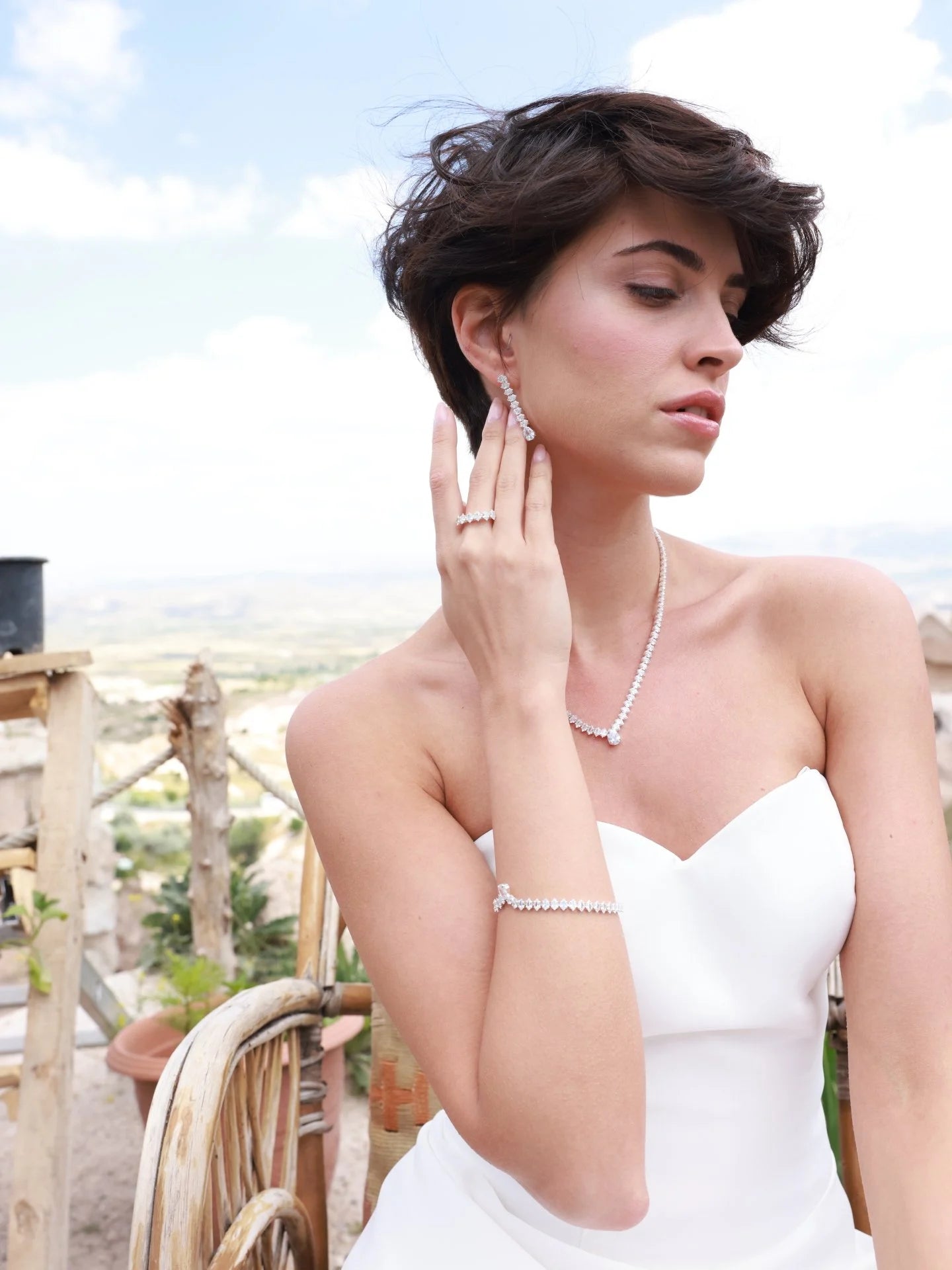 The material is rhodium plated on high quality brass.All of the stones on it are zircon.The ring is adjustable.It does not rotate on the neck.It is recommended not to come into contact with chemicals such as perfume and detergent for long-term use and not to lose its shine