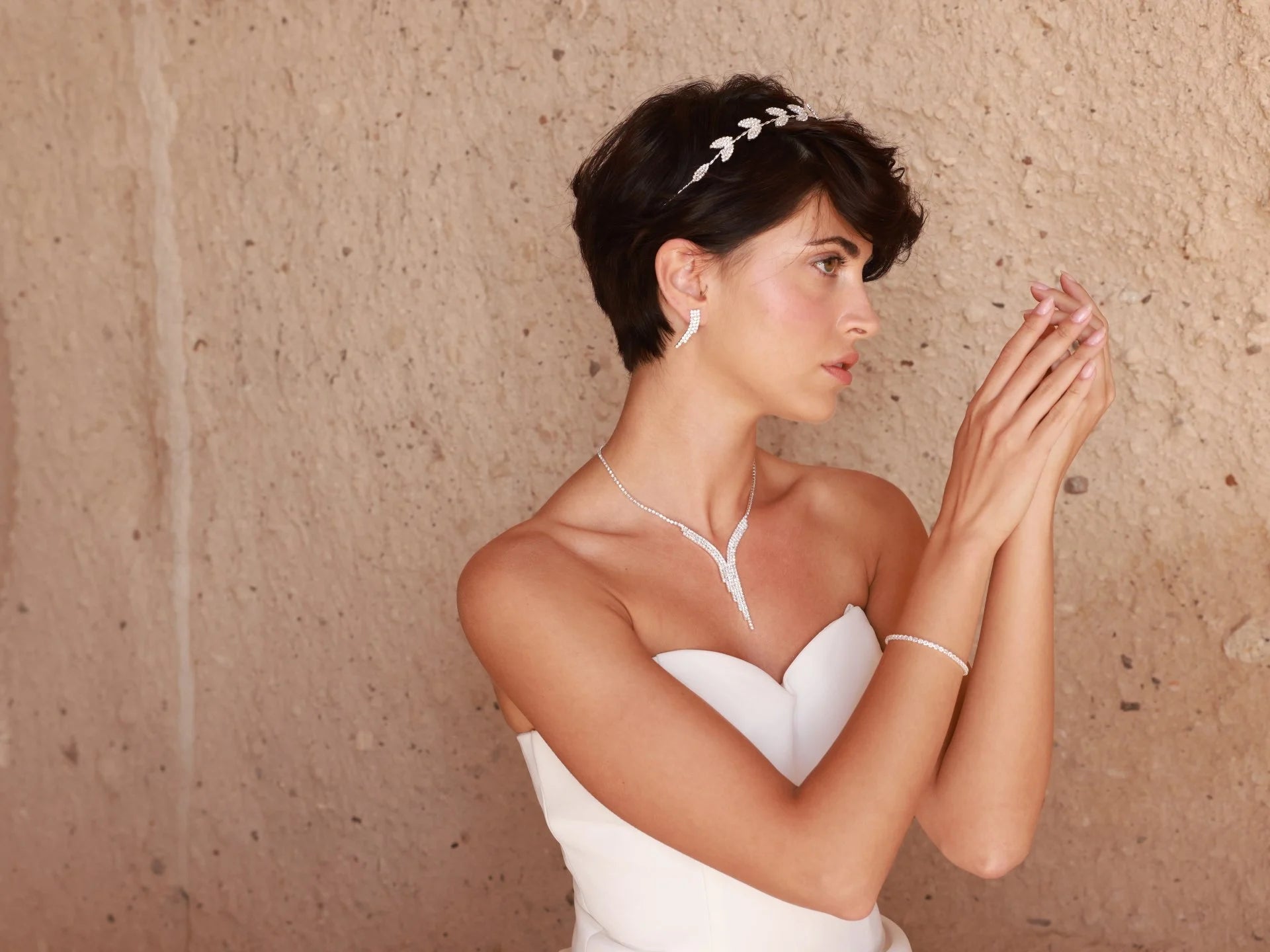 The material is rhodium plated on high quality brass.All of the stones on it are zircon.The ring is adjustable.It does not rotate on the neck.It is recommended that it should not come into contact with chemicals such as perfume and detergent for long-term use and not to lose its shine