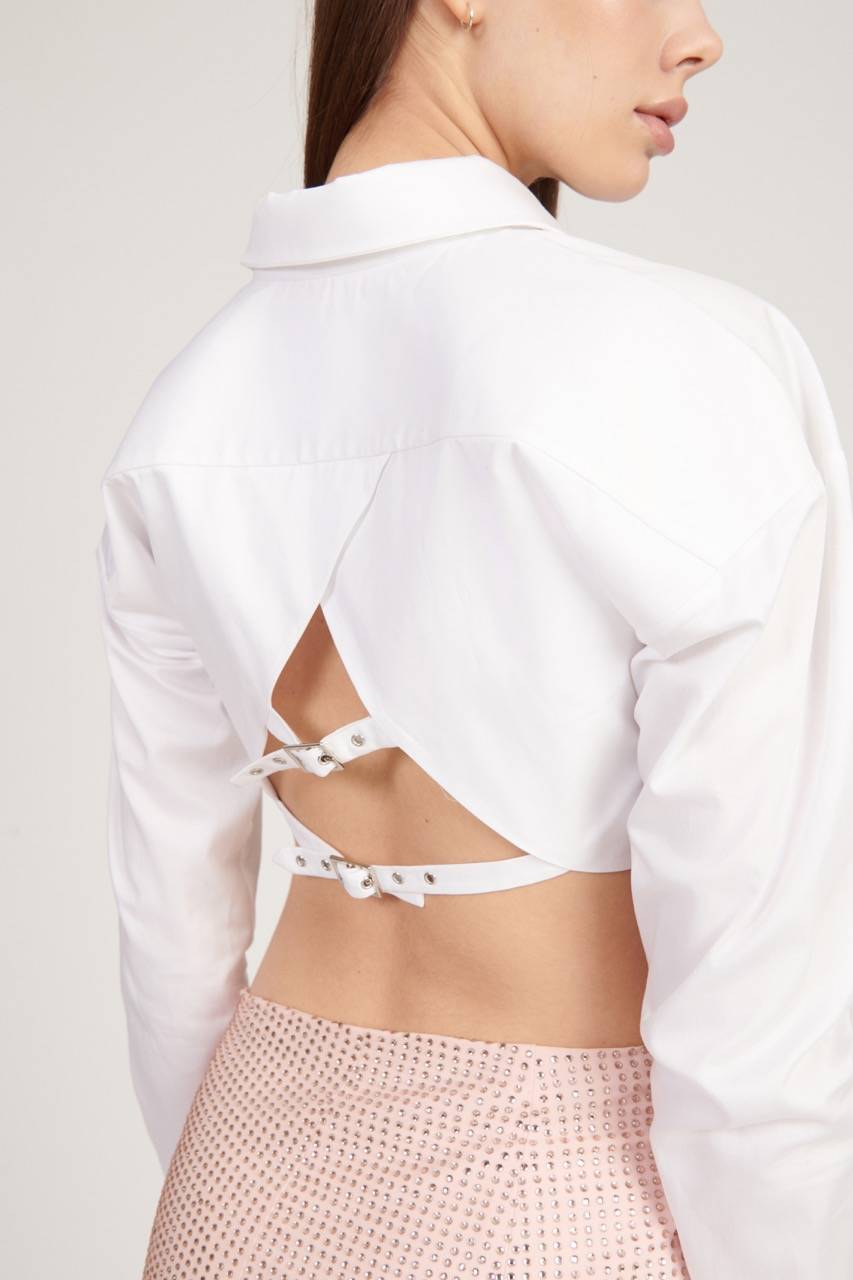Clear Shirt With Back Details Oversize Crop Shirts 95% cotton sateen 3% lycra Dry cleaning only Since this product is made to order, it can be exchanged; but returns are not accepted. Our product in the model is size 36. Oversize low shoulders long sleeves Double belt detail on the back Crop shirt