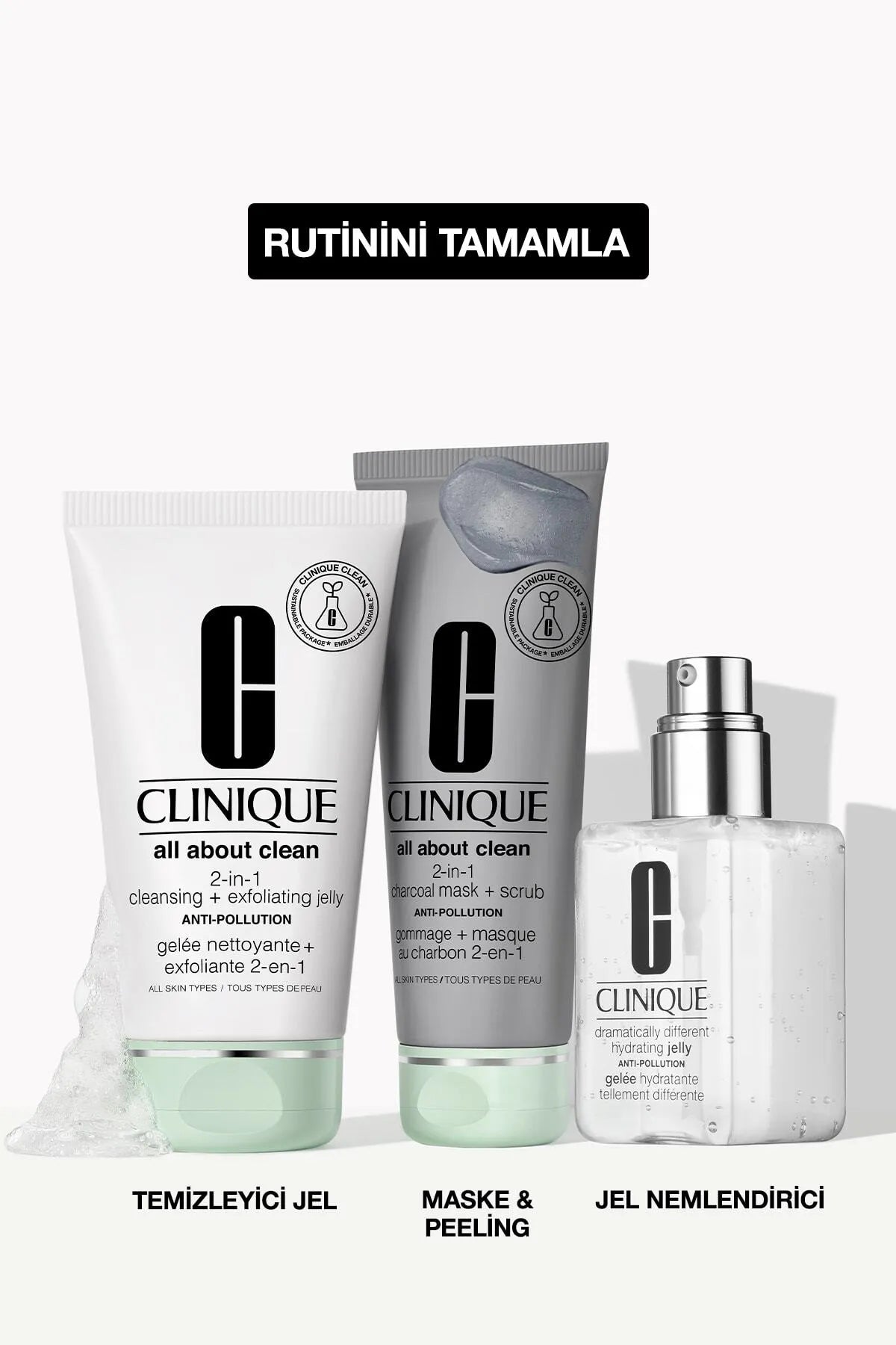Clinique All About Clean™ 2'si 1 Arada Kömür Maskesi + Scrub, kirliliği, kirleri ve fazla yağı gidermeye yardımcı olan ve ayrıca cildin dokusunu arındıran 5 dakikalık çift etkili, detoksifiye edici bir yüz maskesi ve peeling yapan bir yüz peelingidir.