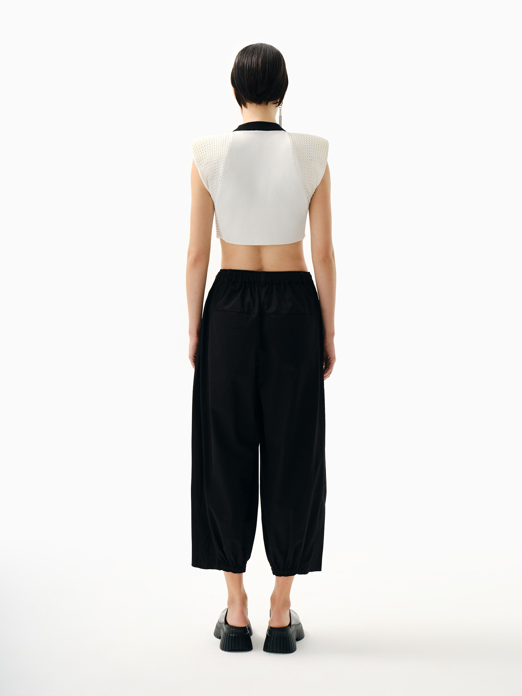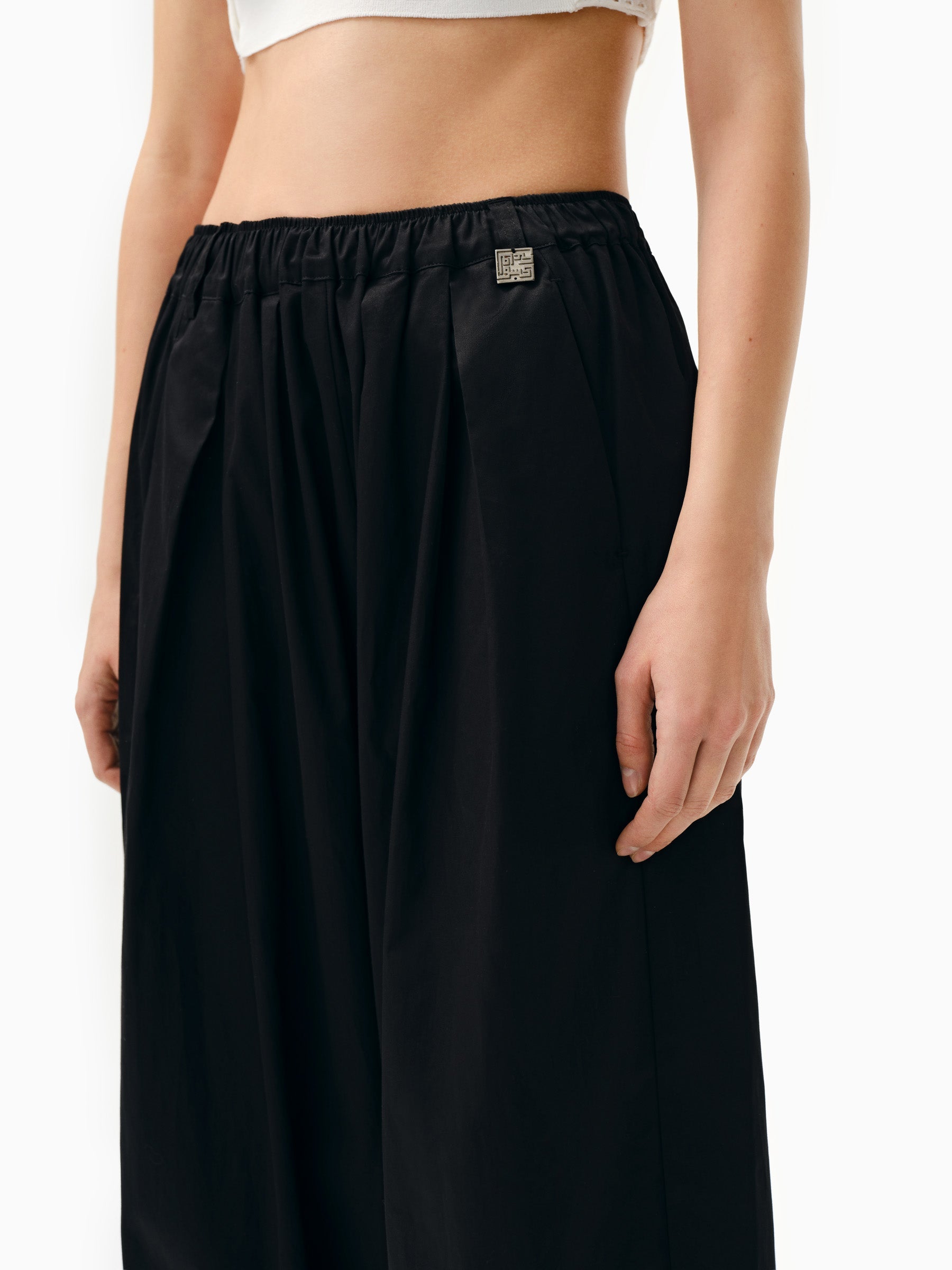 A trouser cut pants made from black poplin fabric. It features a KNTLGY Metal logo accessory on the left side. The pants have two front pockets and elastic at the ankles.