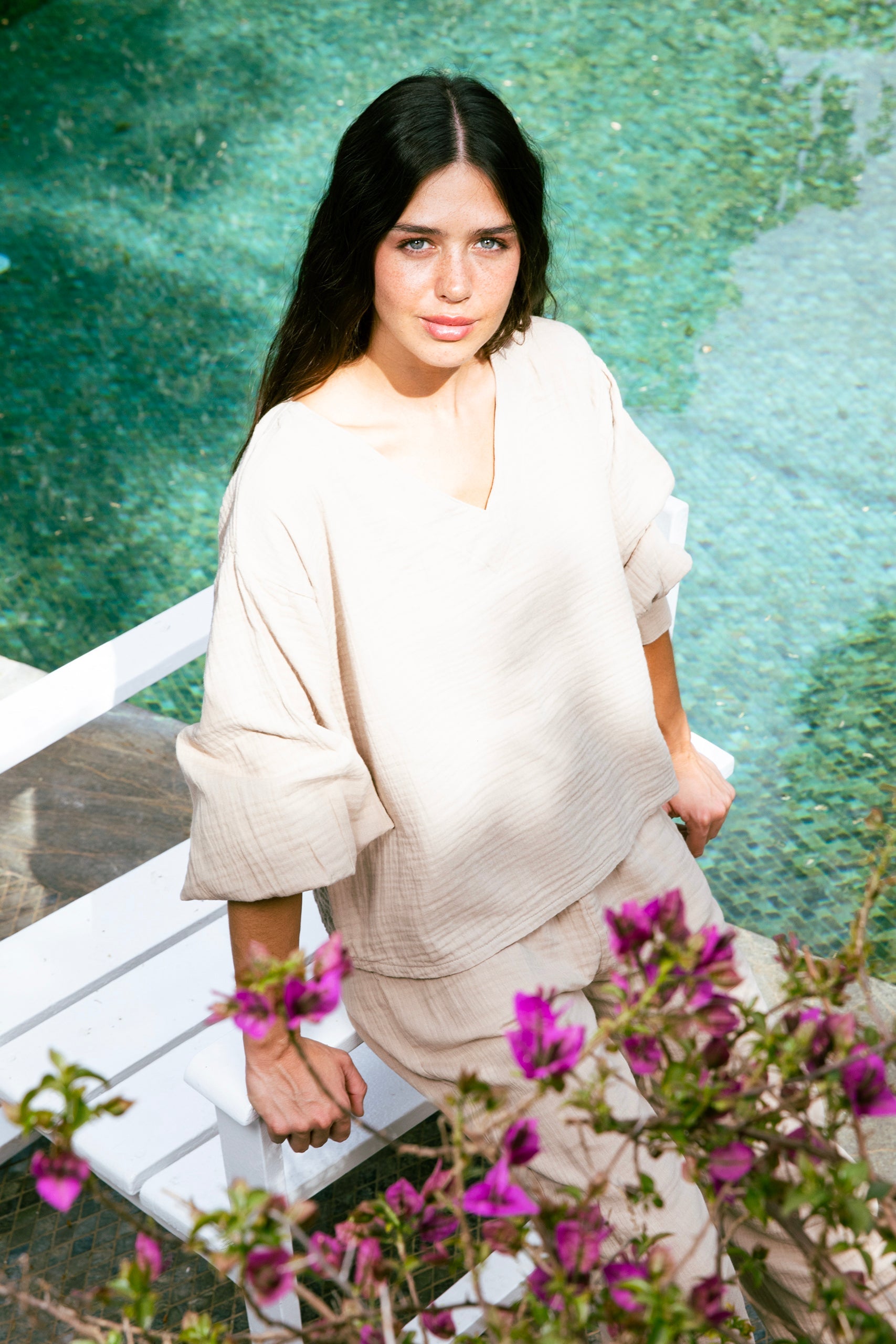 Handarte Los Angeles Bej V Yaka Lodos Top