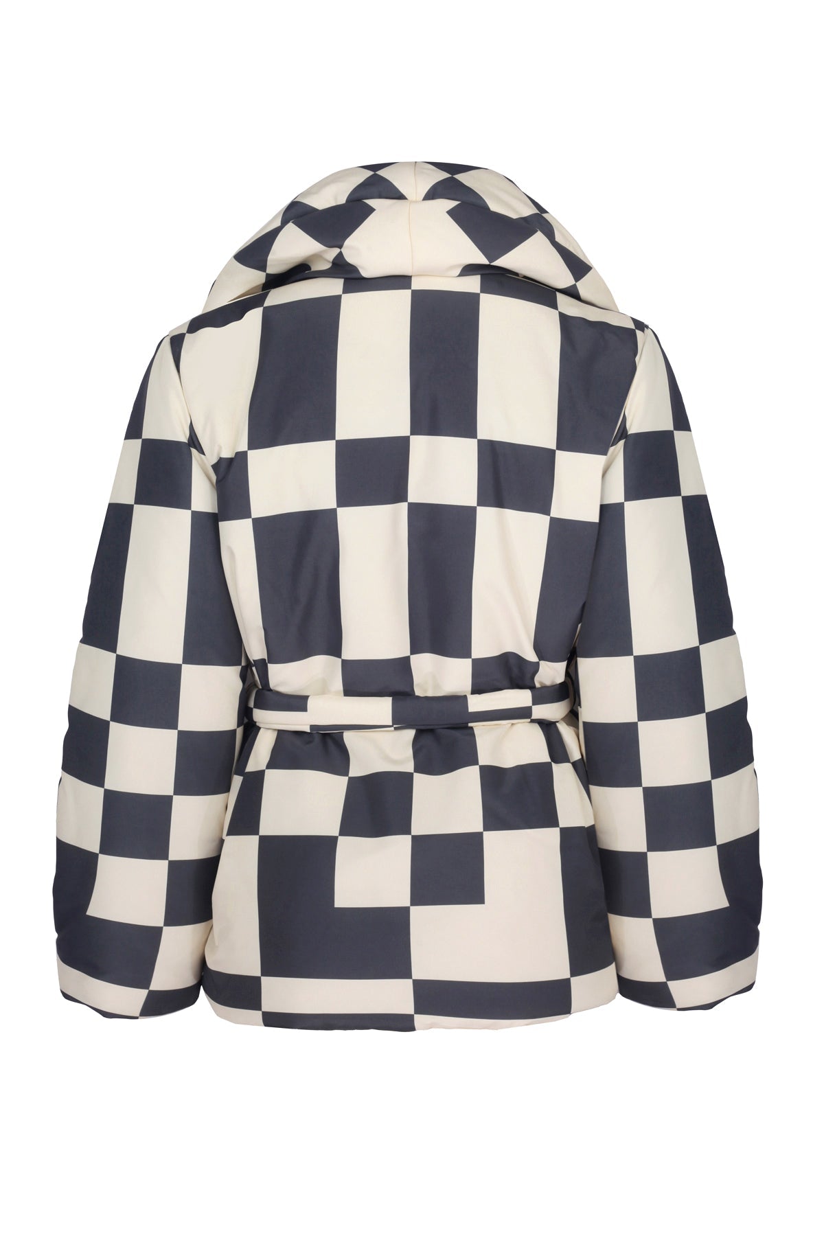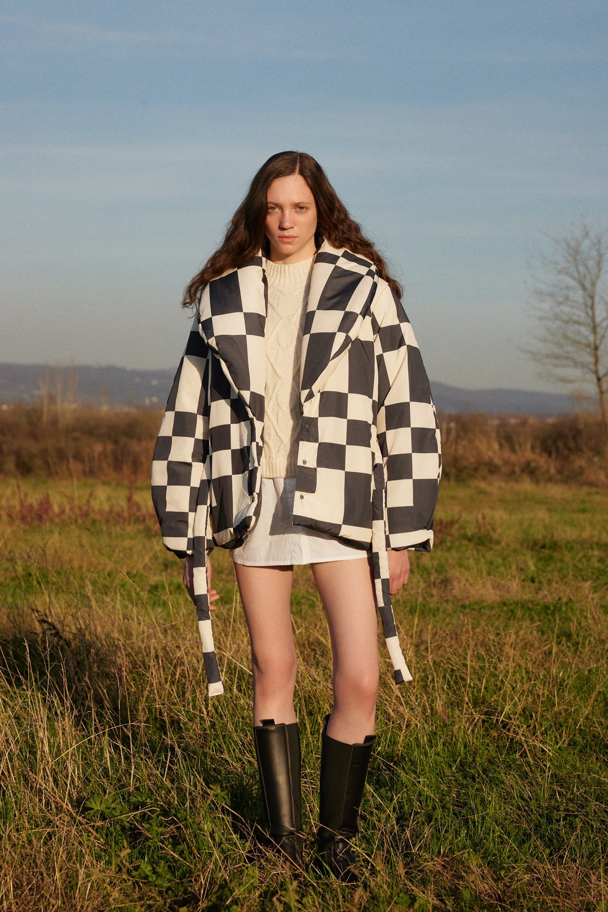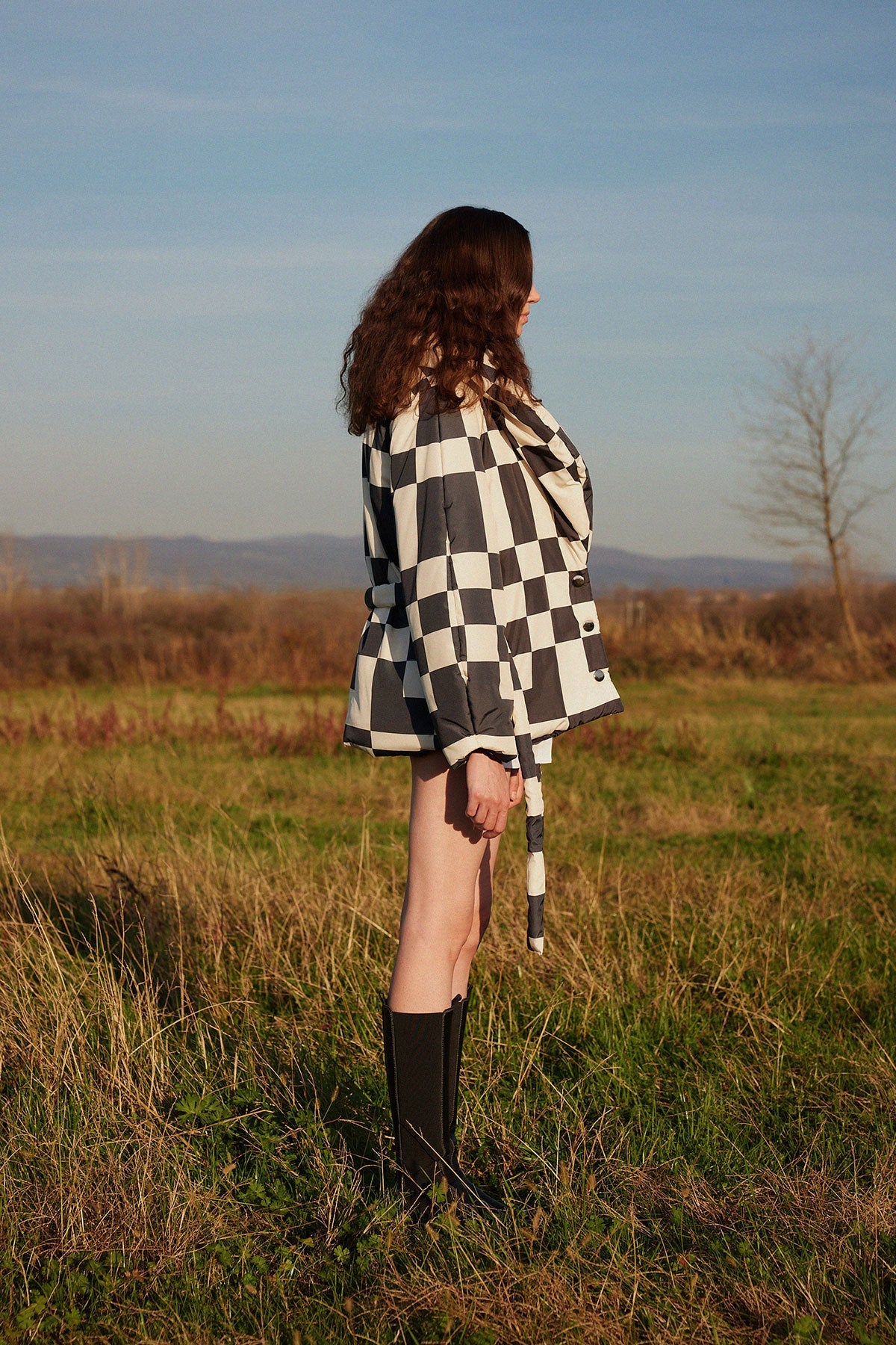 In cosmic distortion print, we are inspired by a cosmic phenomenon which creates an effect that makes galaxies seem squashed and distorted. Thanks to this visual richness that pushes the limits of the mind, we transformed the checkerboard pattern by adding geometric interpretations to make you stand out in a crowd.