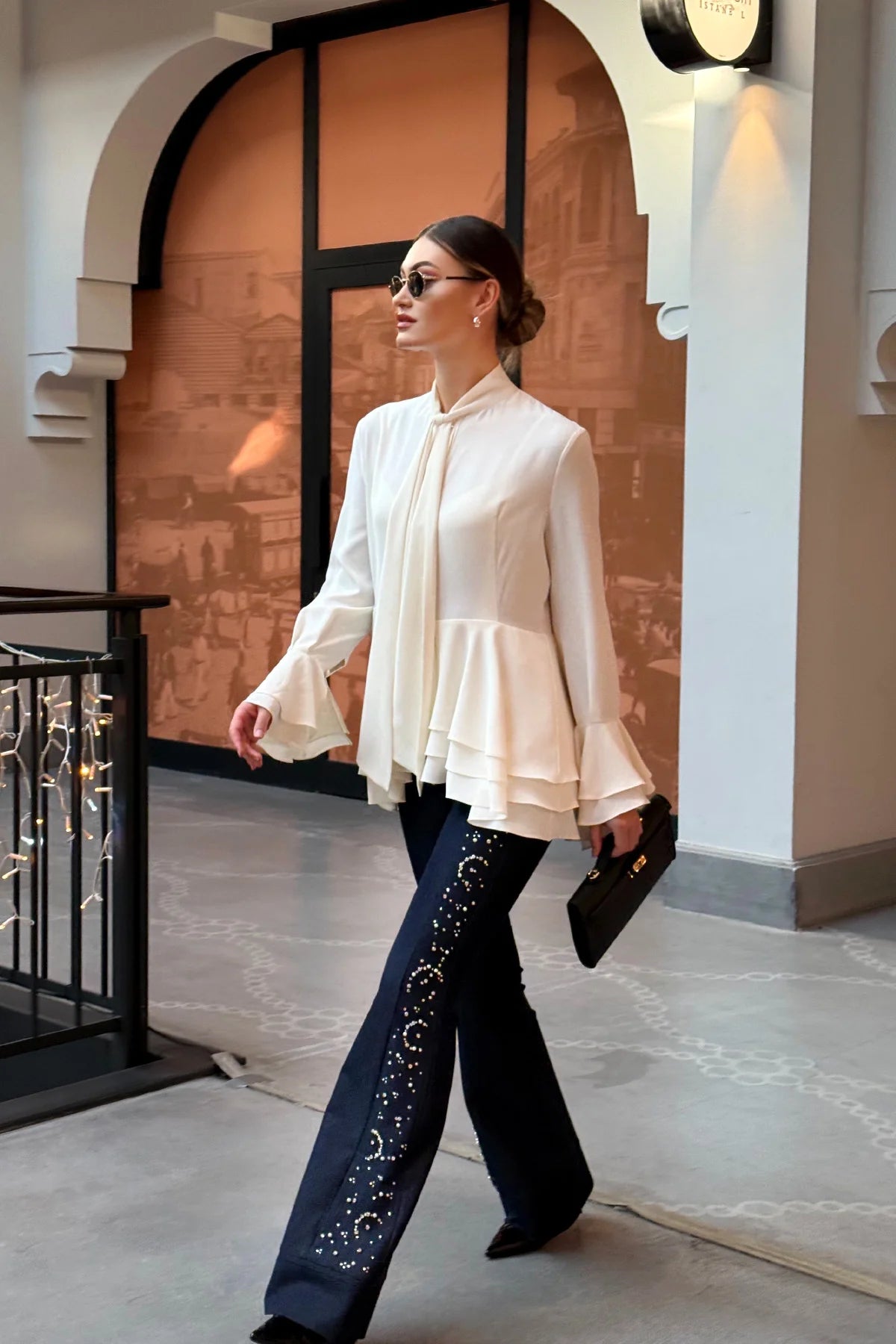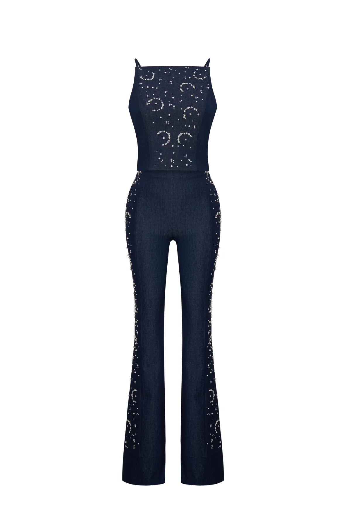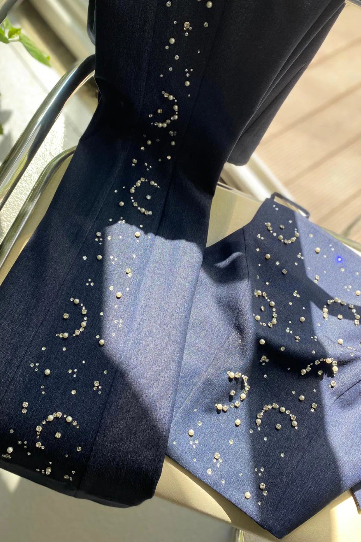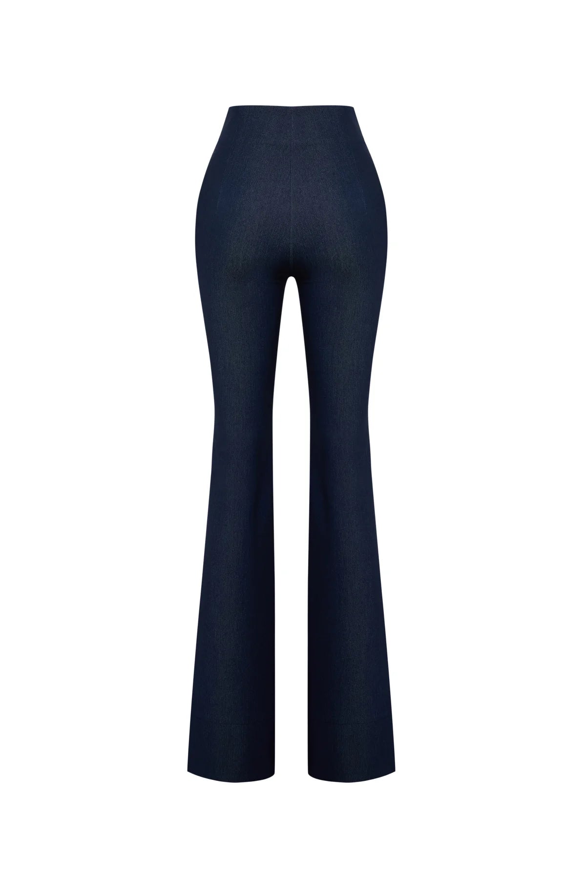 The Northstar Trousers in Navy are where modern elegance meets statement detailing. Crafted from denim-effect fabric, these trousers feature a chic flared-leg silhouette and a smooth waistband with a hidden zipper closure for a clean, tailored look. Decorative stone embellishments elevate the design, while the sleek, pocket-free structure ensures a streamlined fit. Pair them with the Northstar Shirt Blouse for a striking coordinated outfit.