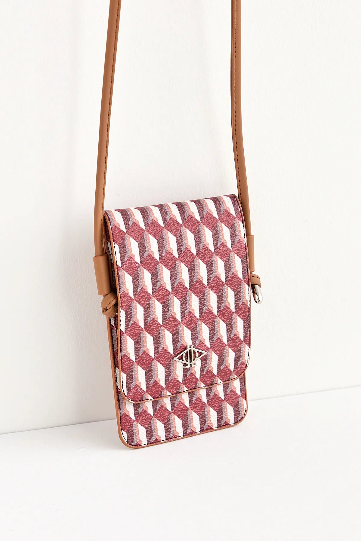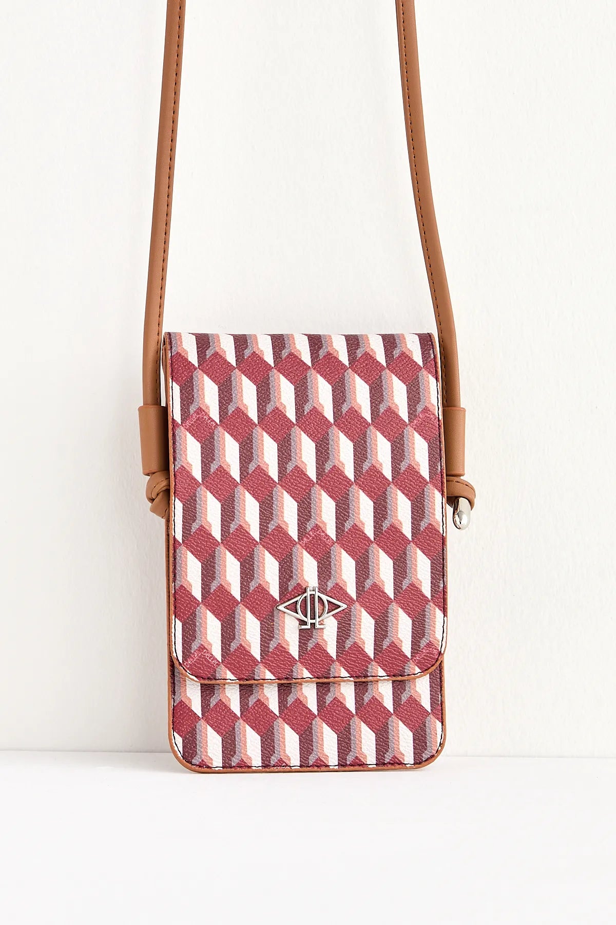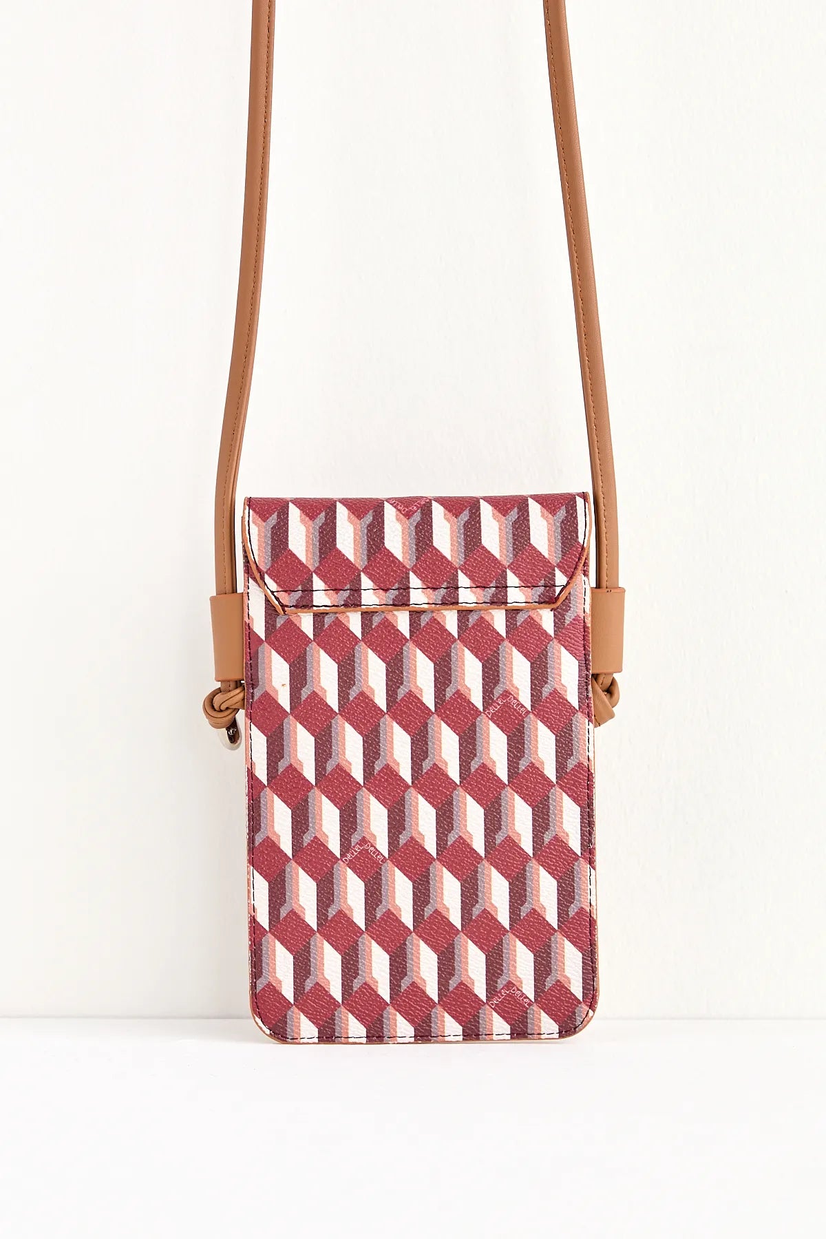 It features an adjustable shoulder strap and a metal snap closure. The bag has a single compartment. The front includes a three-slot cardholder and a zippered pocket.