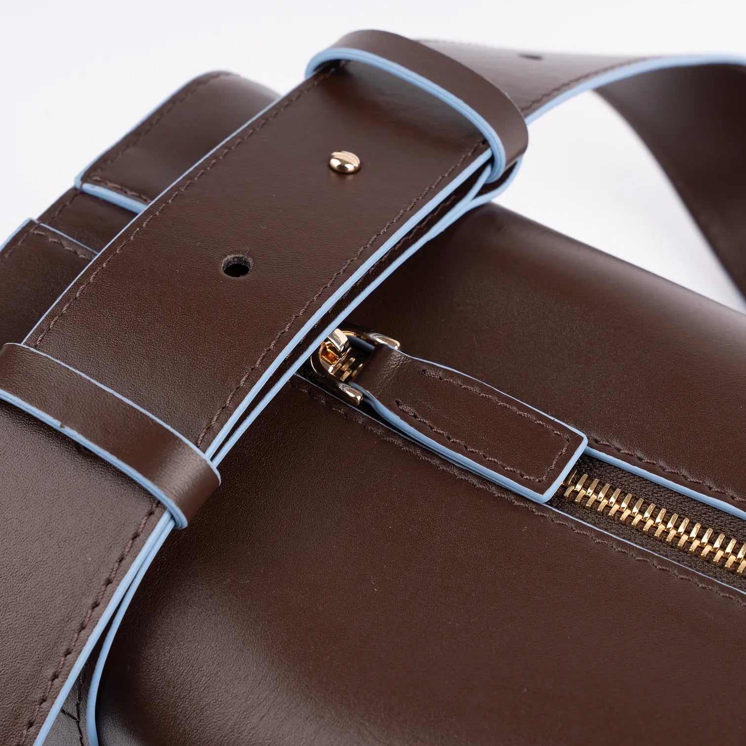 Square prism bag in dark brown calf leather with zipper closure and adjustable shoulder strap. One side pocket with magnetic closure and internal pocket with zip. Blue contrast stitching and silver logo at front. Internal dark brown velvet lining.