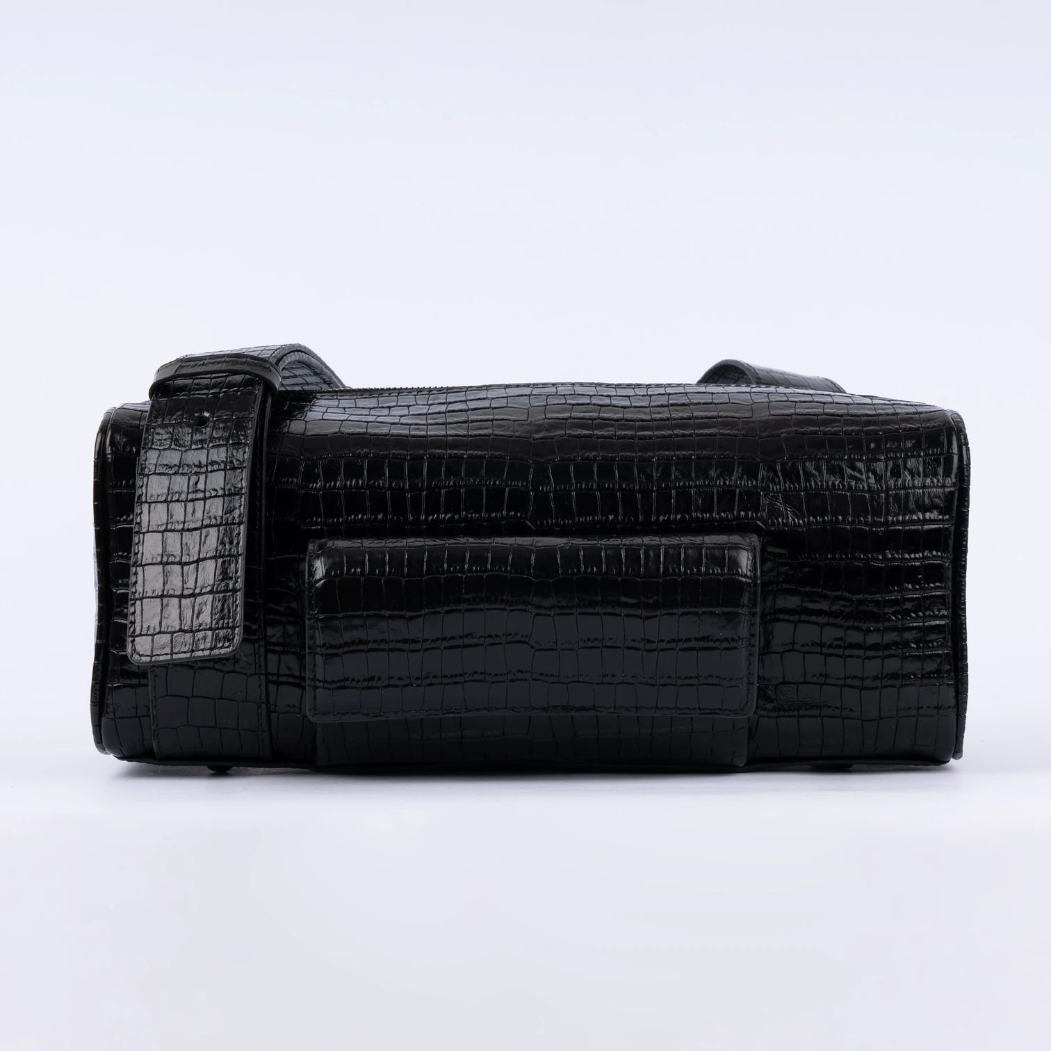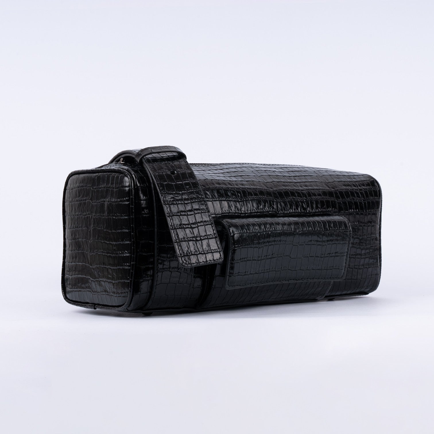 Square prism bag in crocodile black calf leather with zipper closure and adjustable shoulder strap. One side pocket with magnetic closure and internal pocket with zip. Black stitching and internal black velvet lining.