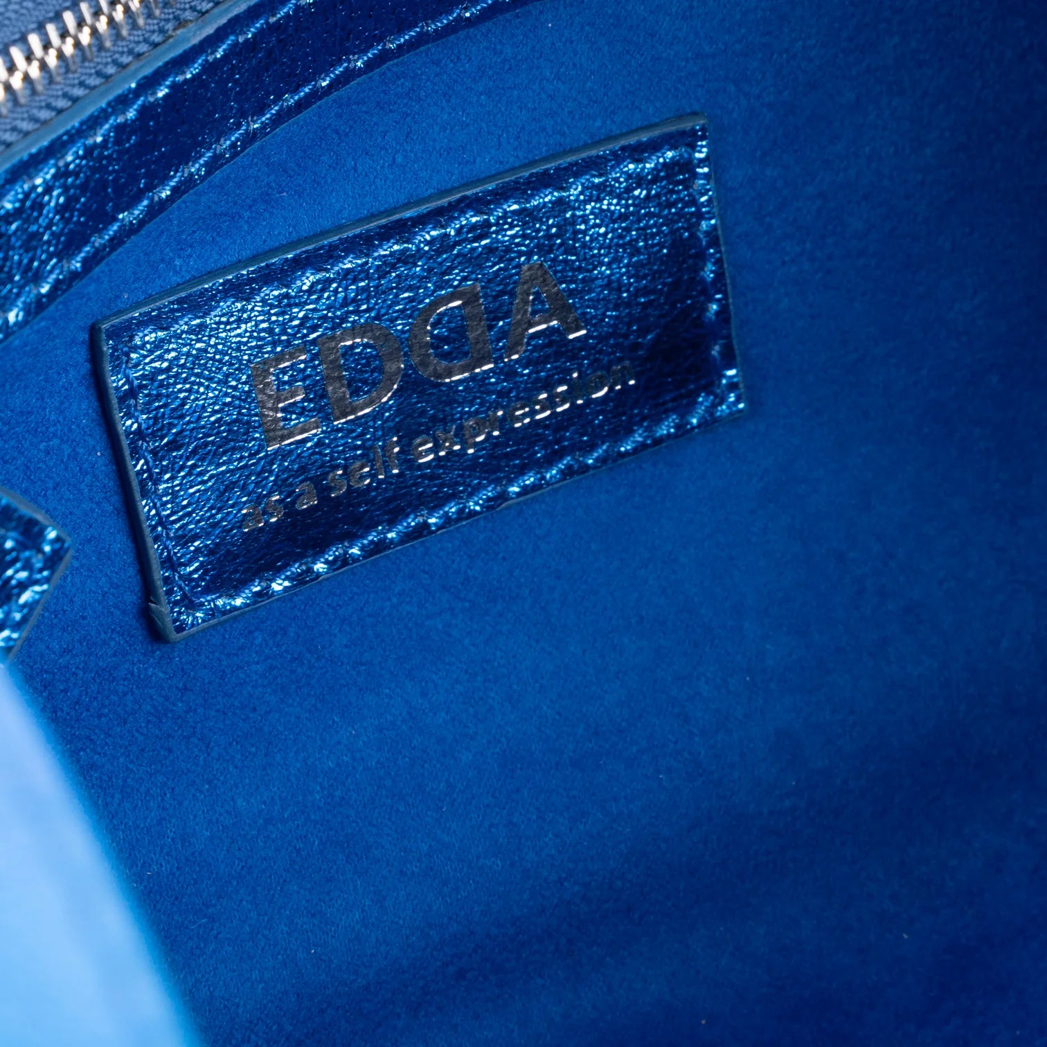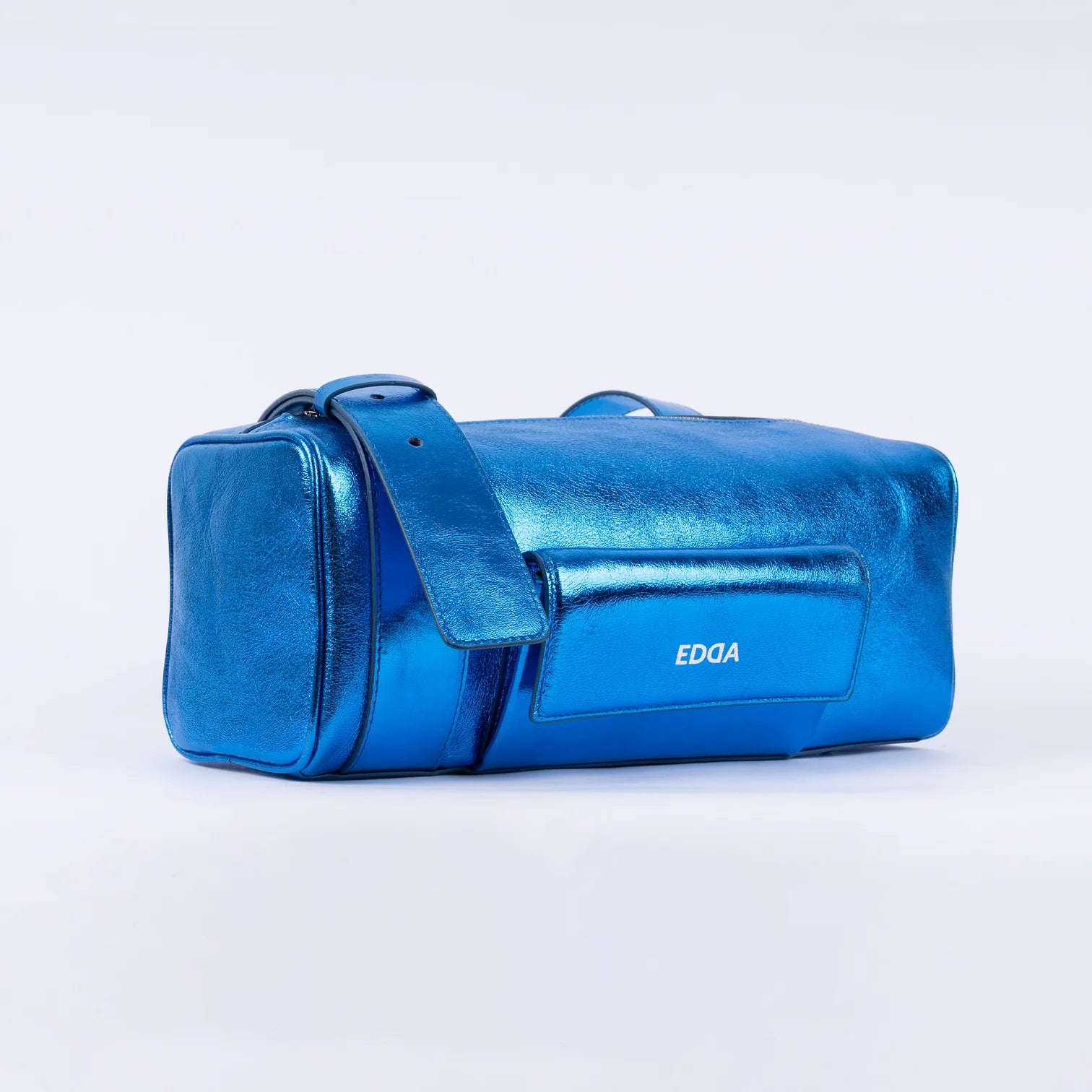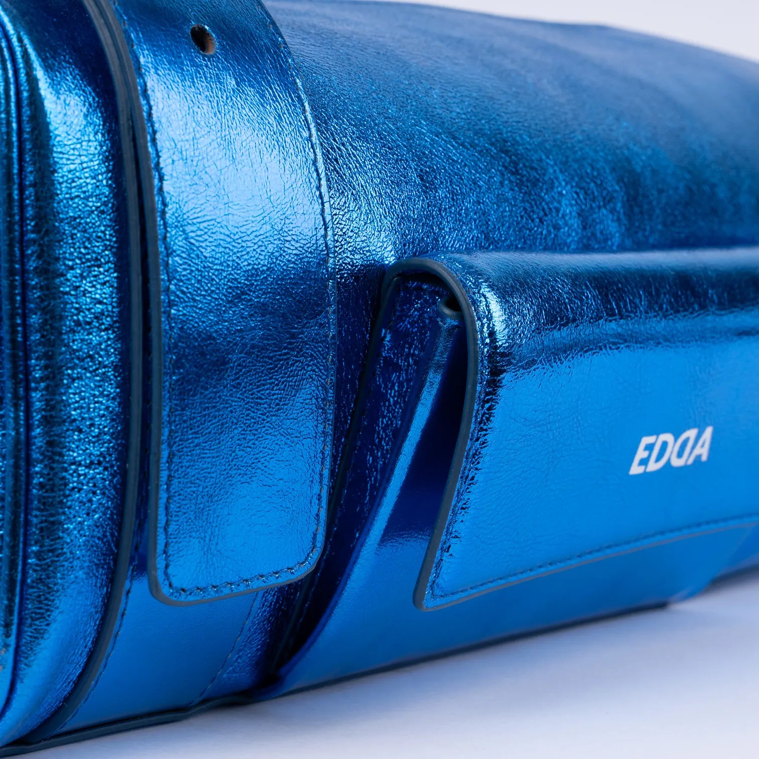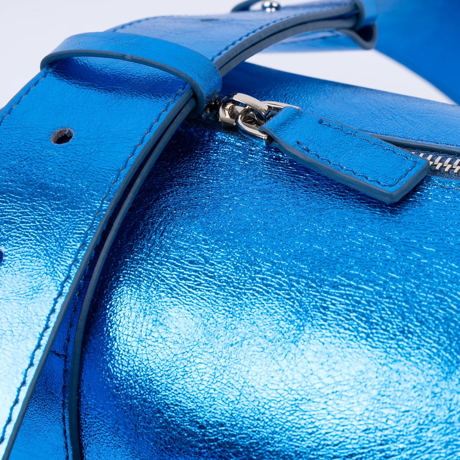 Square prism bag in metallic blue calf leather with zipper closure and adjustable shoulder strap. One side pocket with magnetic closure and internal pocket with zip. Blue stitching and silver logo at front. Internal blue velvet lining.