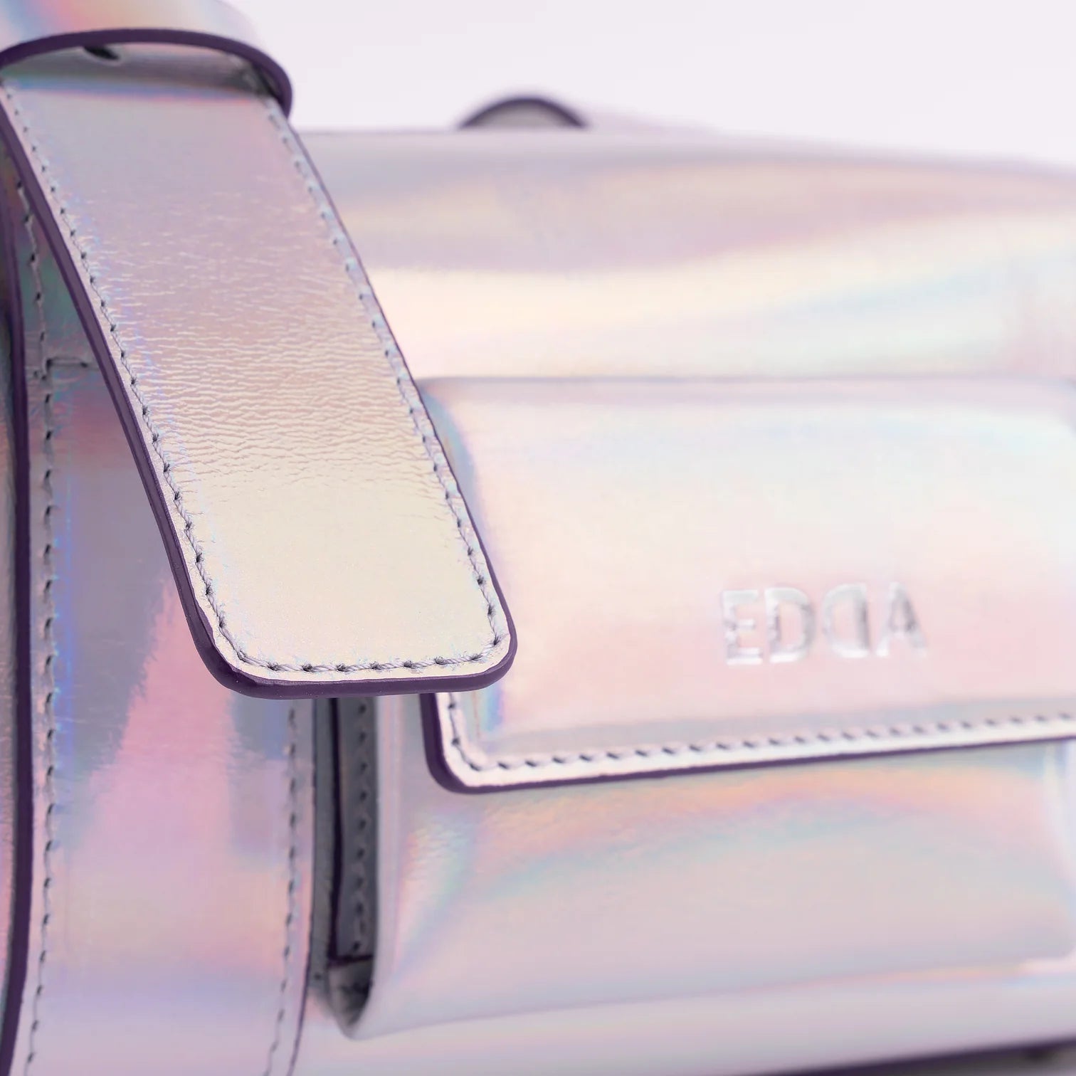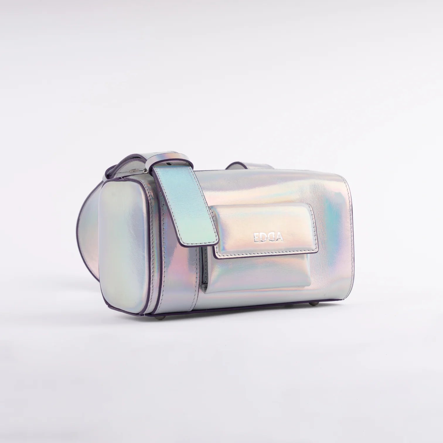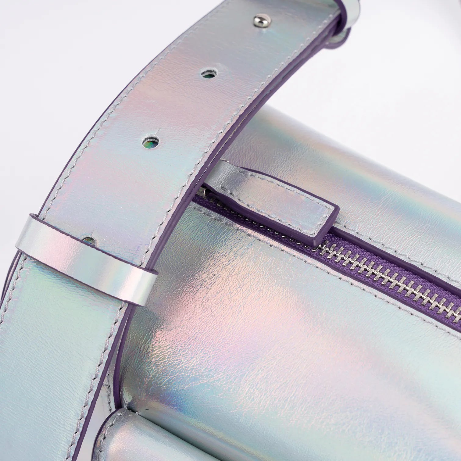 Beyond its undeniable style, the Cosmic Journey Collection prioritizes functionality. You'll find it easy to organize your essentials, such as your wallet, phone, keys, and sunglasses. With its sleek and understated cool, this collection effortlessly elevates your day-to-night look, and it discreetly tucks under your arm for added convenience.Square prism bag in hologram calf leather with zipper closure and adjustable shoulder strap. One side pocket with magnetic closure and internal pocket with zip. Purple stitching and silver logo at front. Internal purple velvet lining.