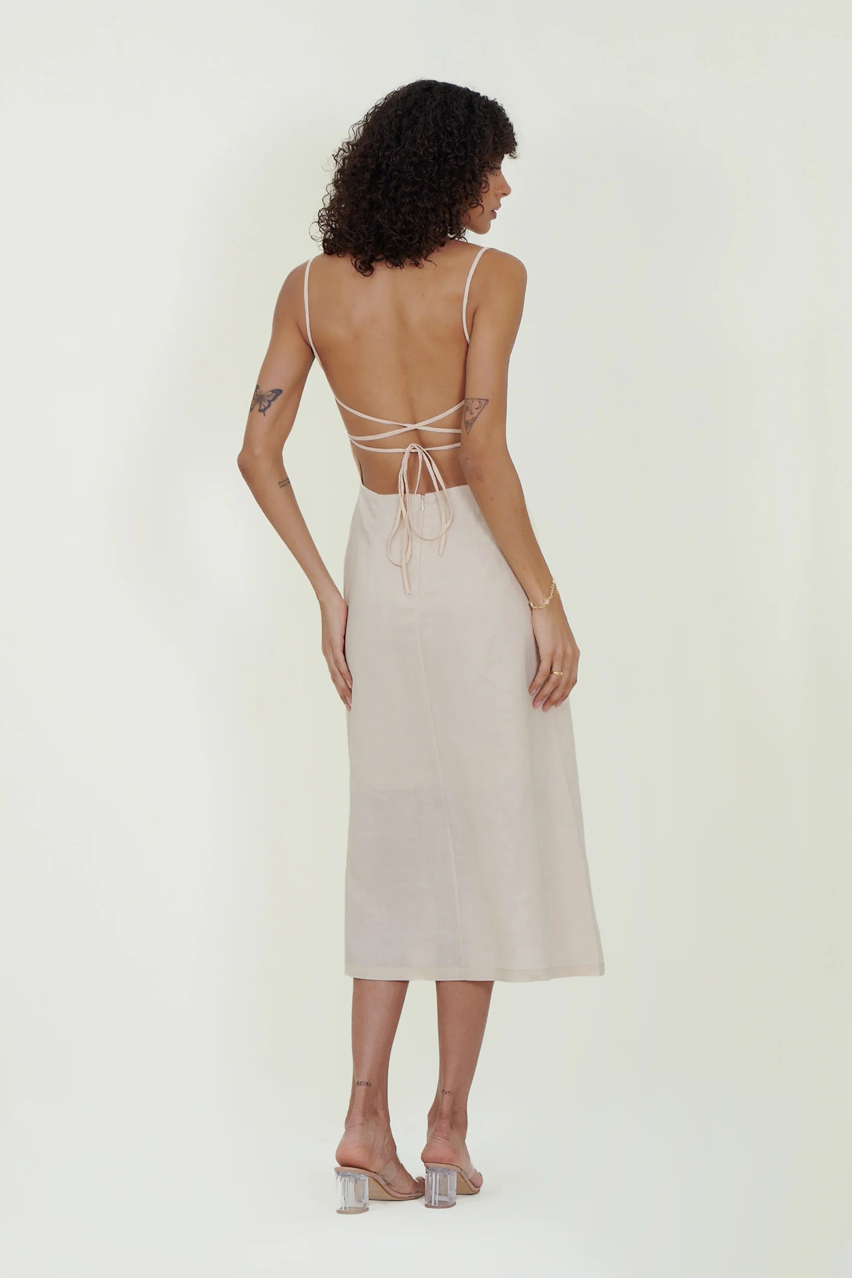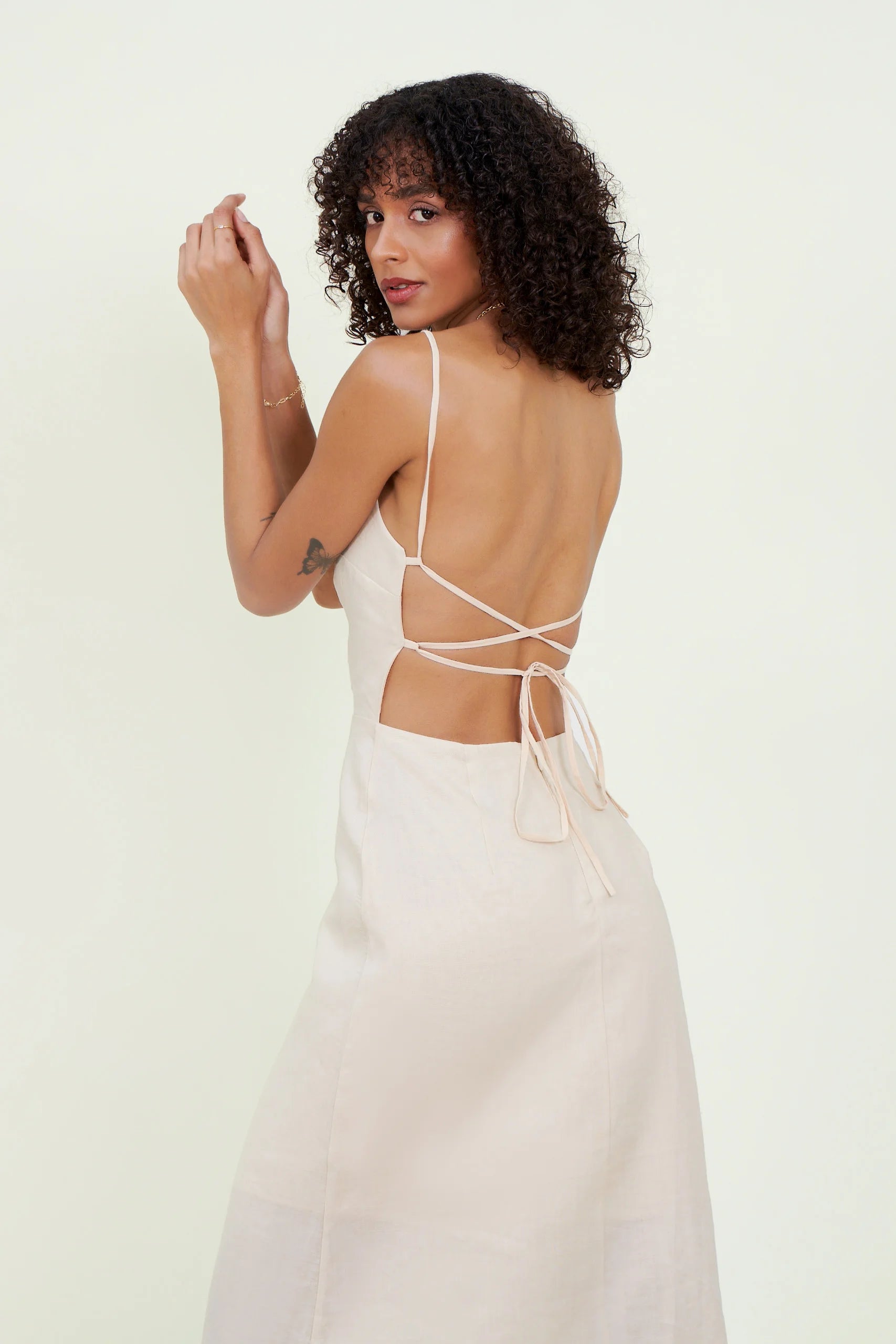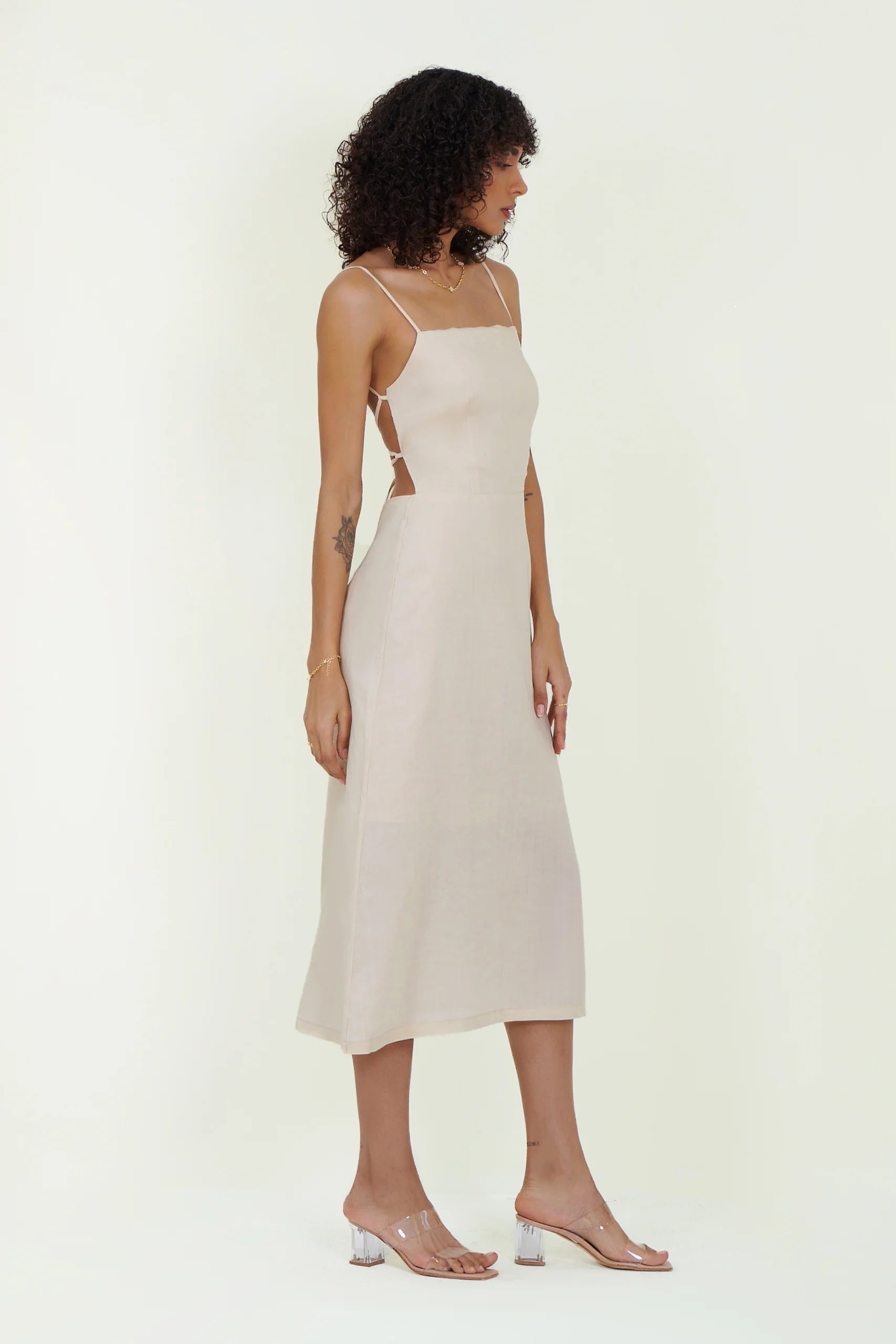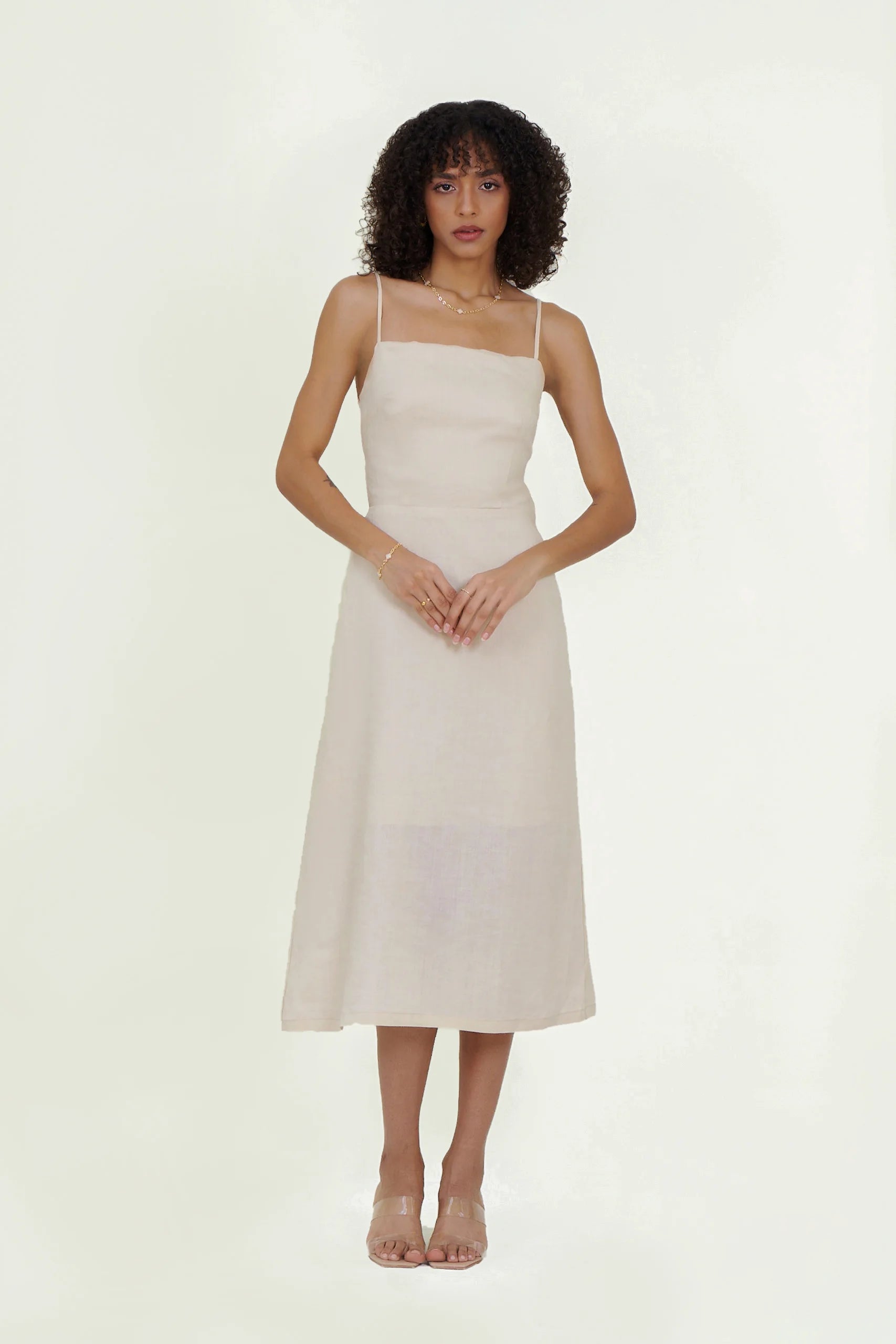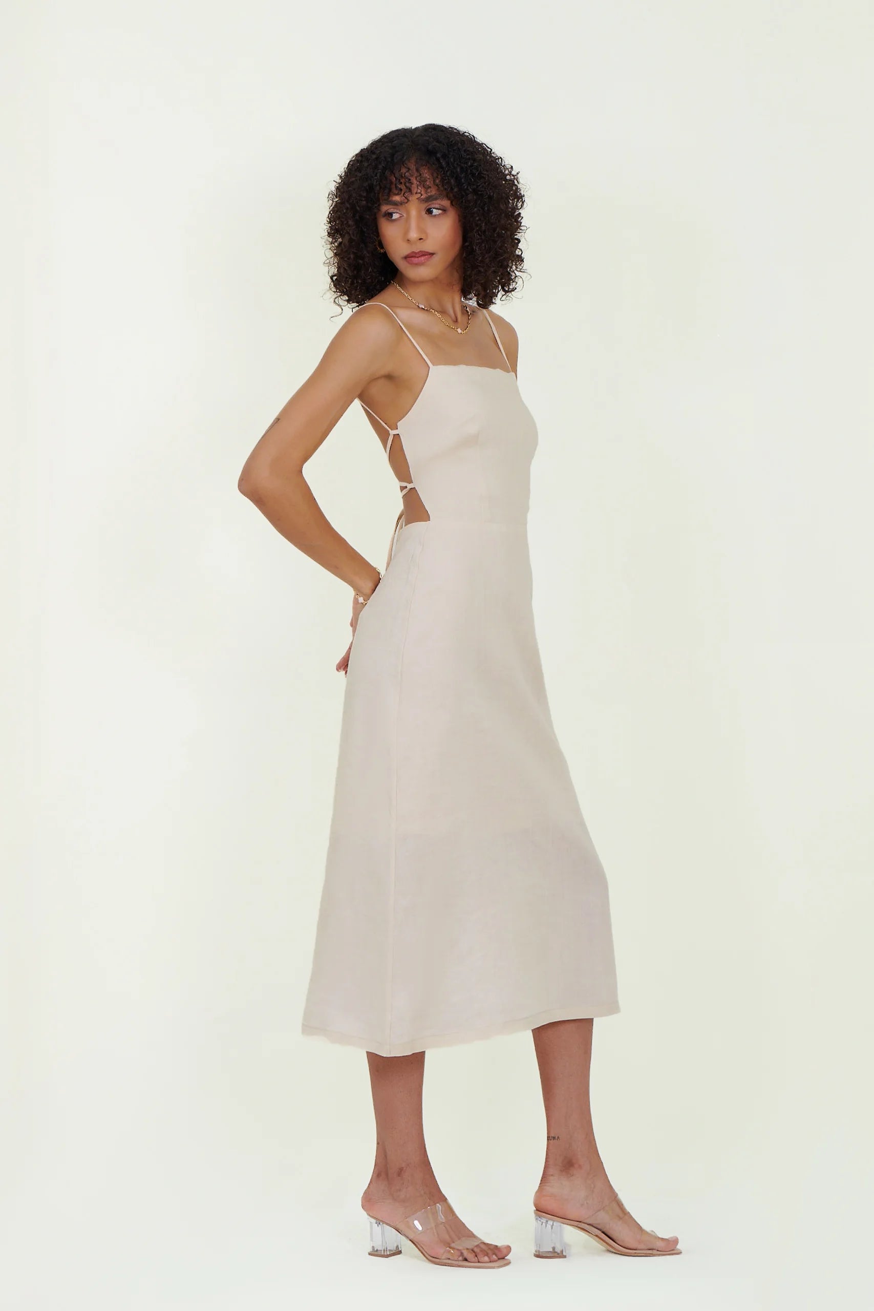 Eloshé Sırt Dekolteli Krem Midi Keten Elbise JEDSSM107