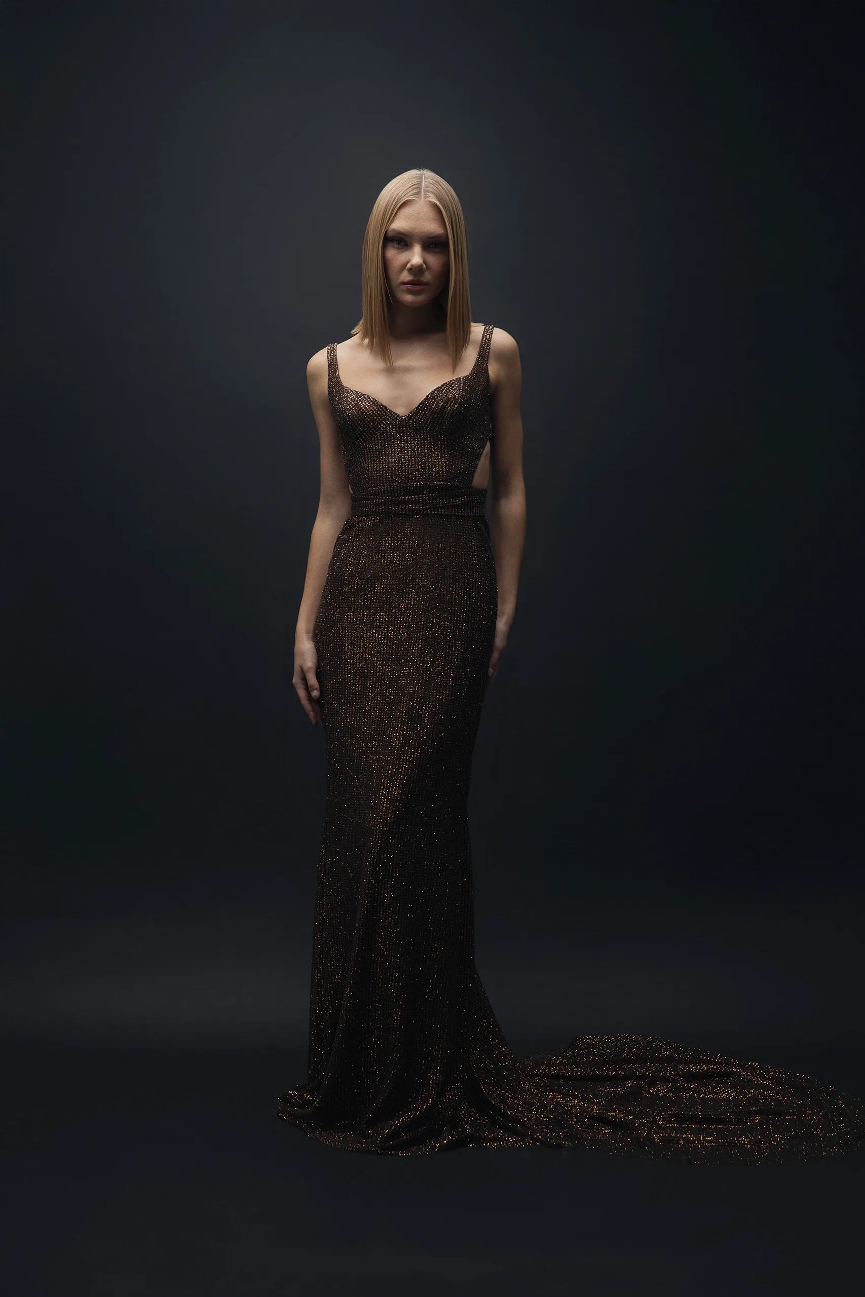 Delivers a captivating look with fine bright flake details and impressive back decollete. Elegant cross-back design, long tail enhances grandeur.