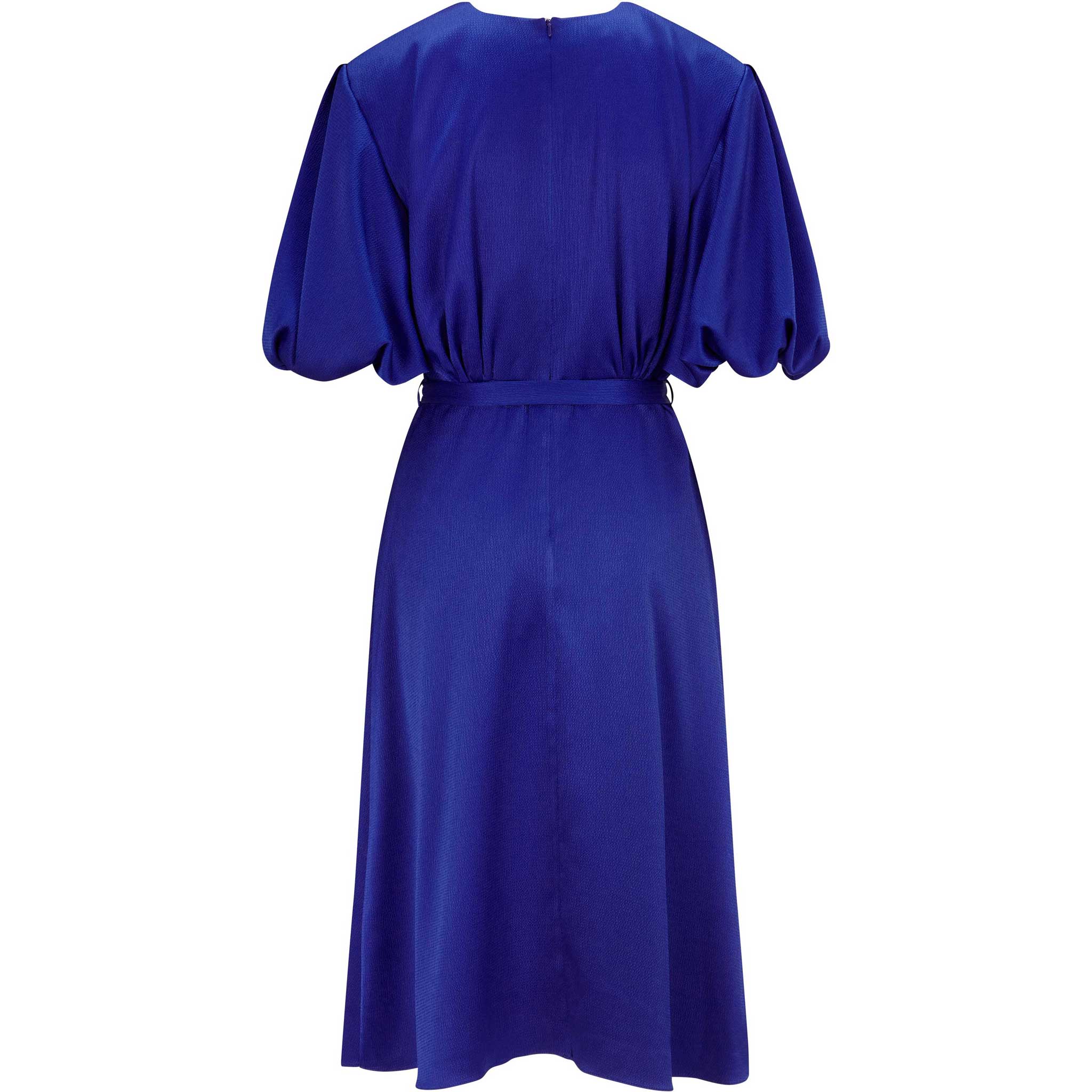 Show off your feminine side with this midi satin dress in royal blue. Complete with statement draped sleeves and elegant waist tie detail. This dress is perfect for making a bold and playful impression for any occasion. Featuring a round neck, dropped shoulders, a rear zip, relaxed fit and a straight hem.