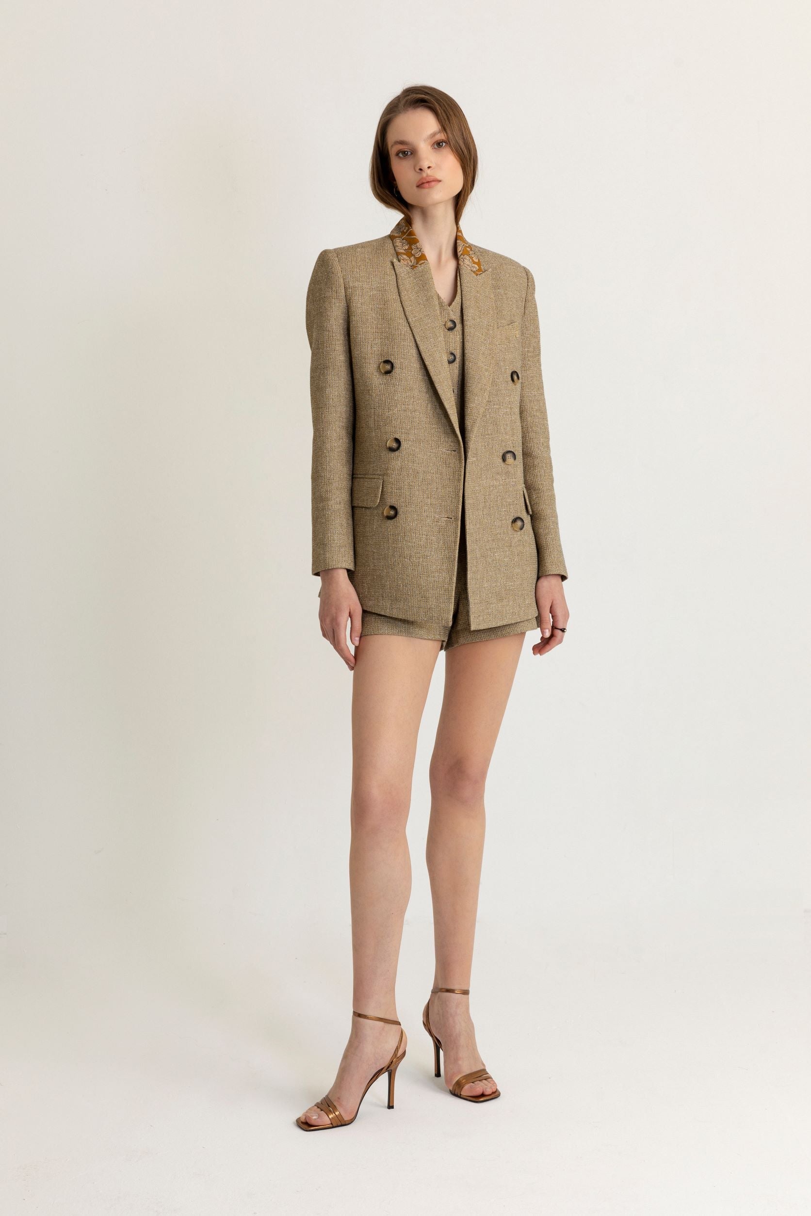 | Are you ready to lighten up your closet and holiday suitcase this summer? Meet with one of the favorite part of Giulia Set, which is a candidate to be the favorite part of the season. Produced with the highest quality and environmentally friendly materials, the Giulia Blazer will be an indispensable piece for those who spend the season between city and beach parties. It will be your companion when you come back from the beach party where you dance until the morning while supporting your determined stance you created in the office. You can style Giulia Blazer with Giulia Vest and Giulia Shorts for a total look, and you can easily get different looks by styling it with other items in your closet. |
