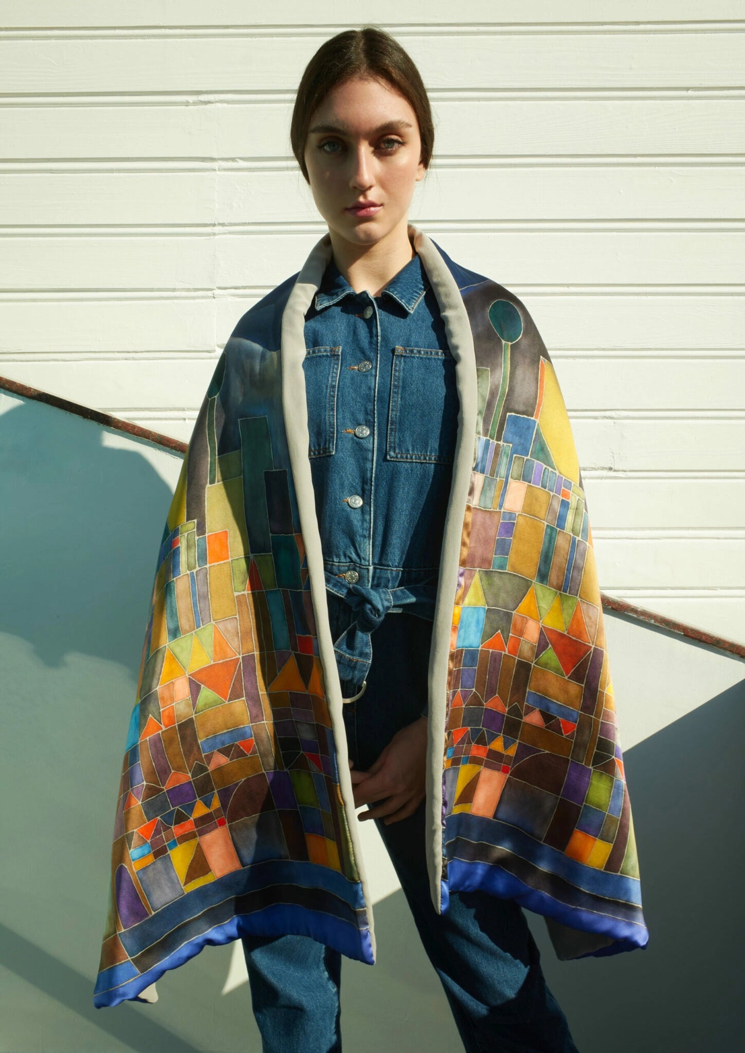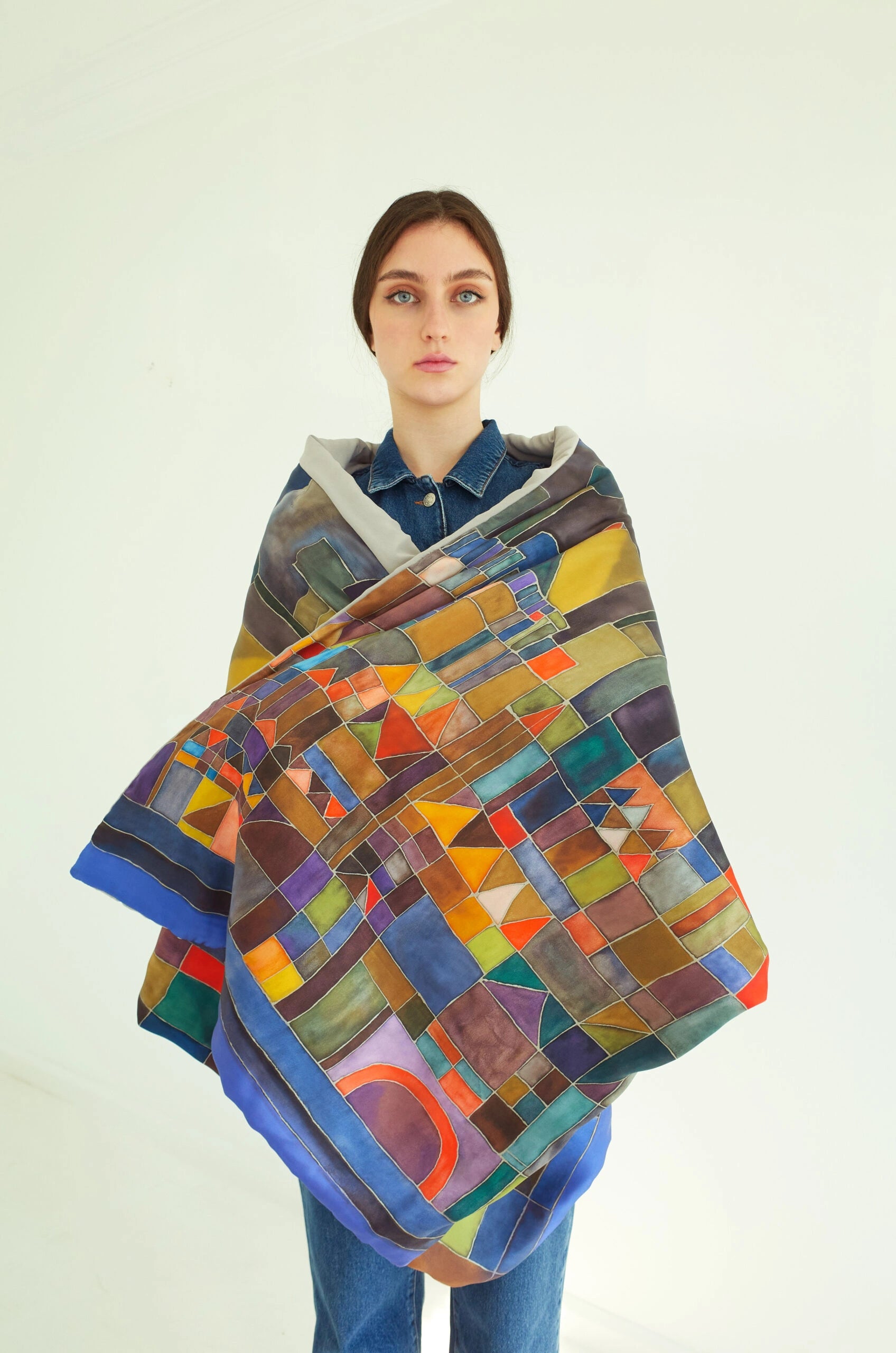 İki ipek katmanın arasına mikro elyaf yerleştirerek sizi sıcak tutacak pançoyu andıran büyük bir şal hazırladık.