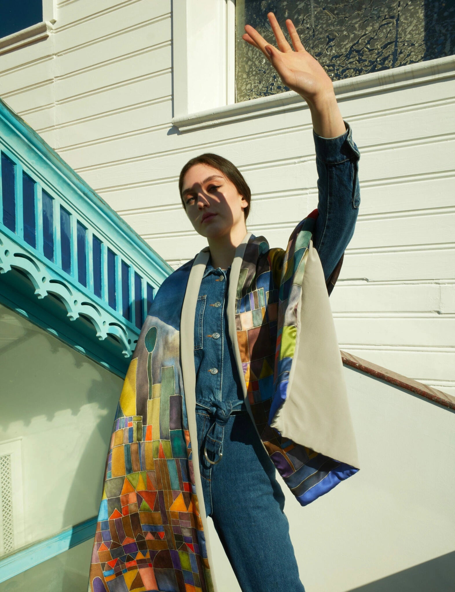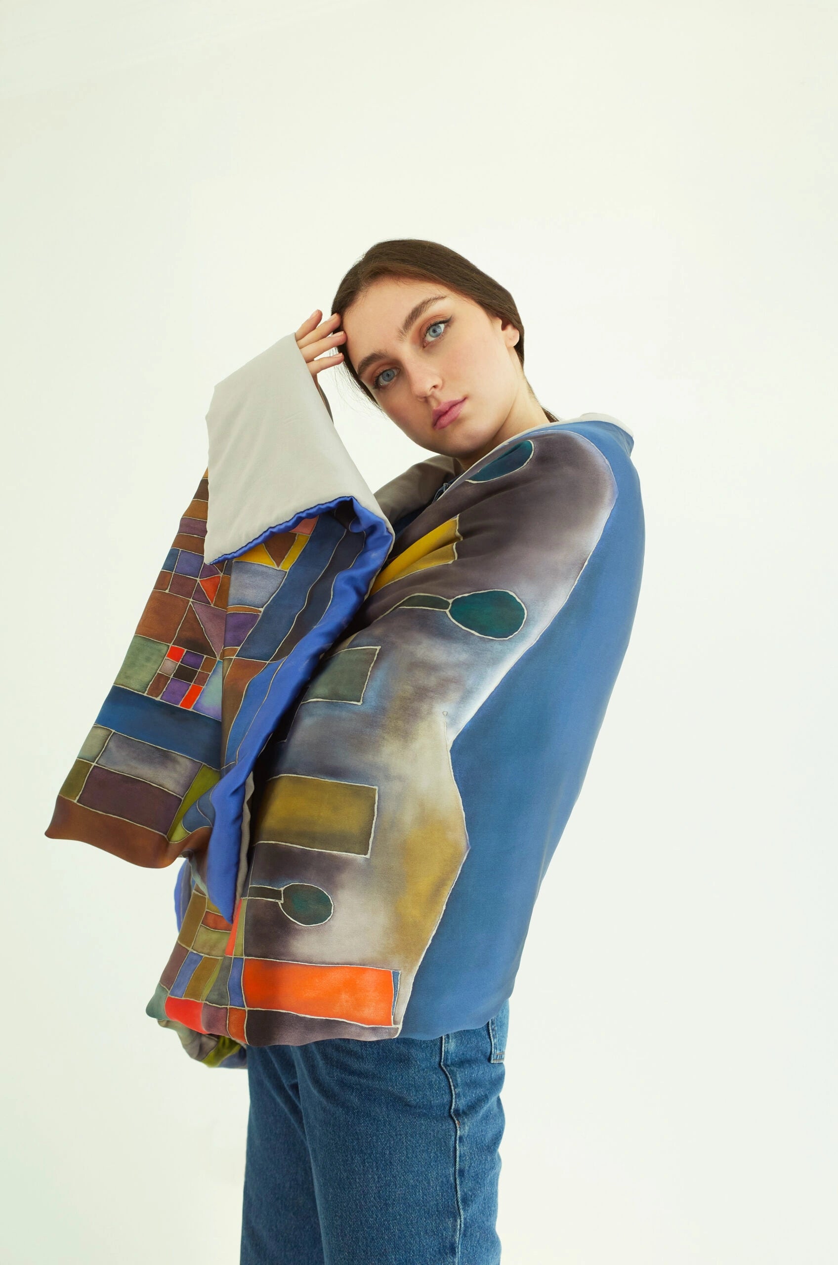 Dış yüzey: %100 ipek saten ve el boyaması. “Homes” desenimizin dijital olarak basılmış bir kopyasıdır. İç kısım: Düz gri, taş badanalı %100 ipek.