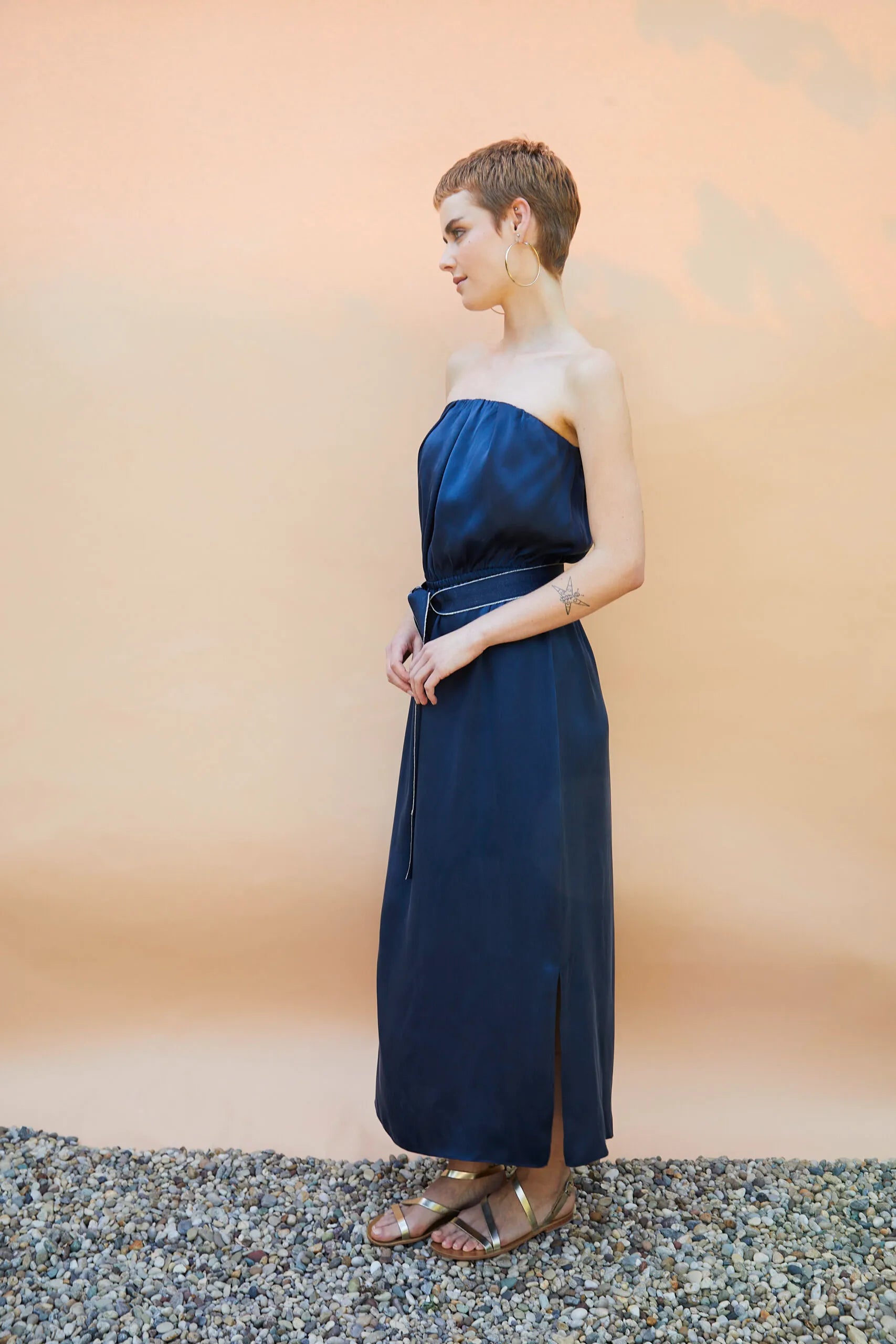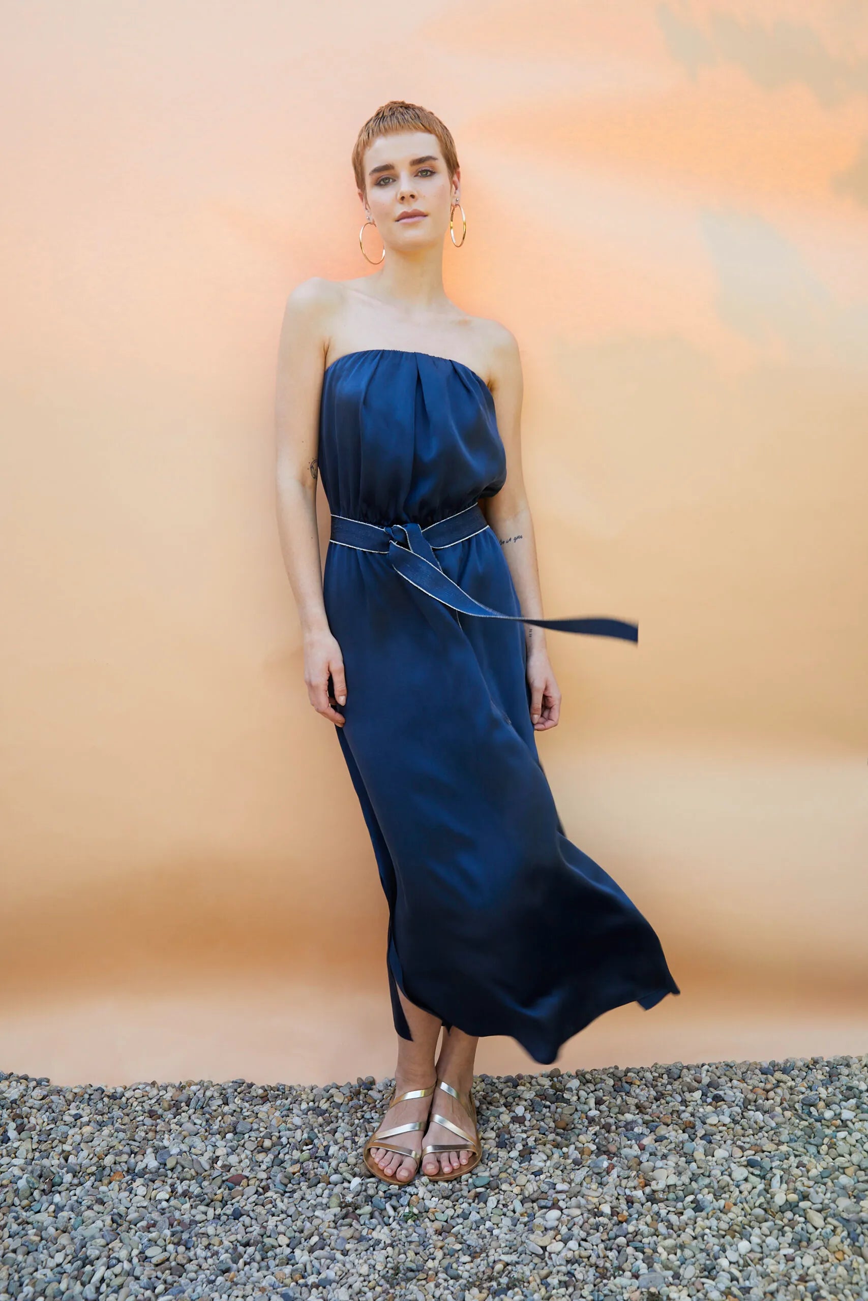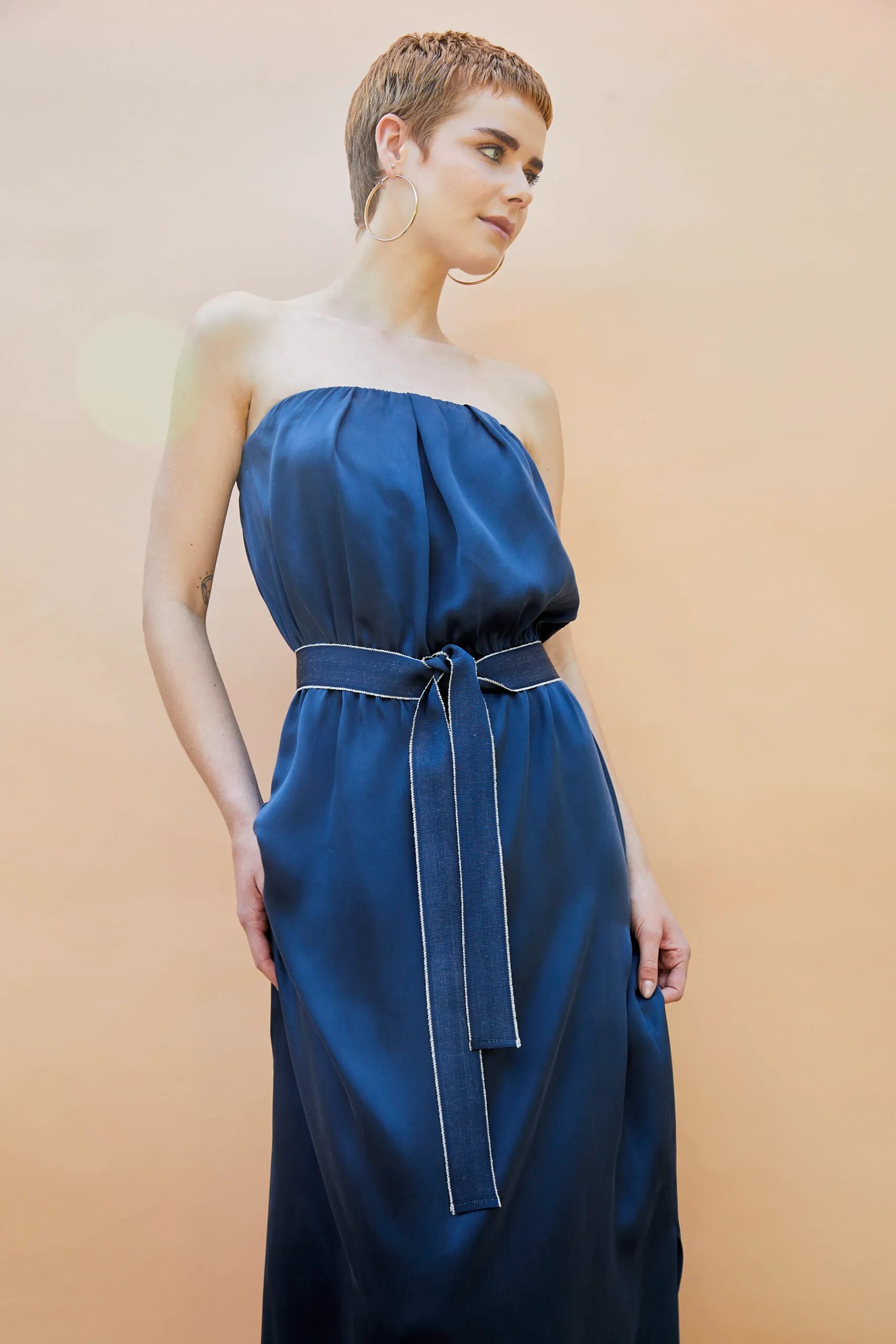 Zarif straplez elbise, %100 doğal ipek satenden üretilmesinin yanı sıra taş yıkamalı olması nedeniyle de oldukça yumuşak bir dokunuşa sahiptir.Kumaş...