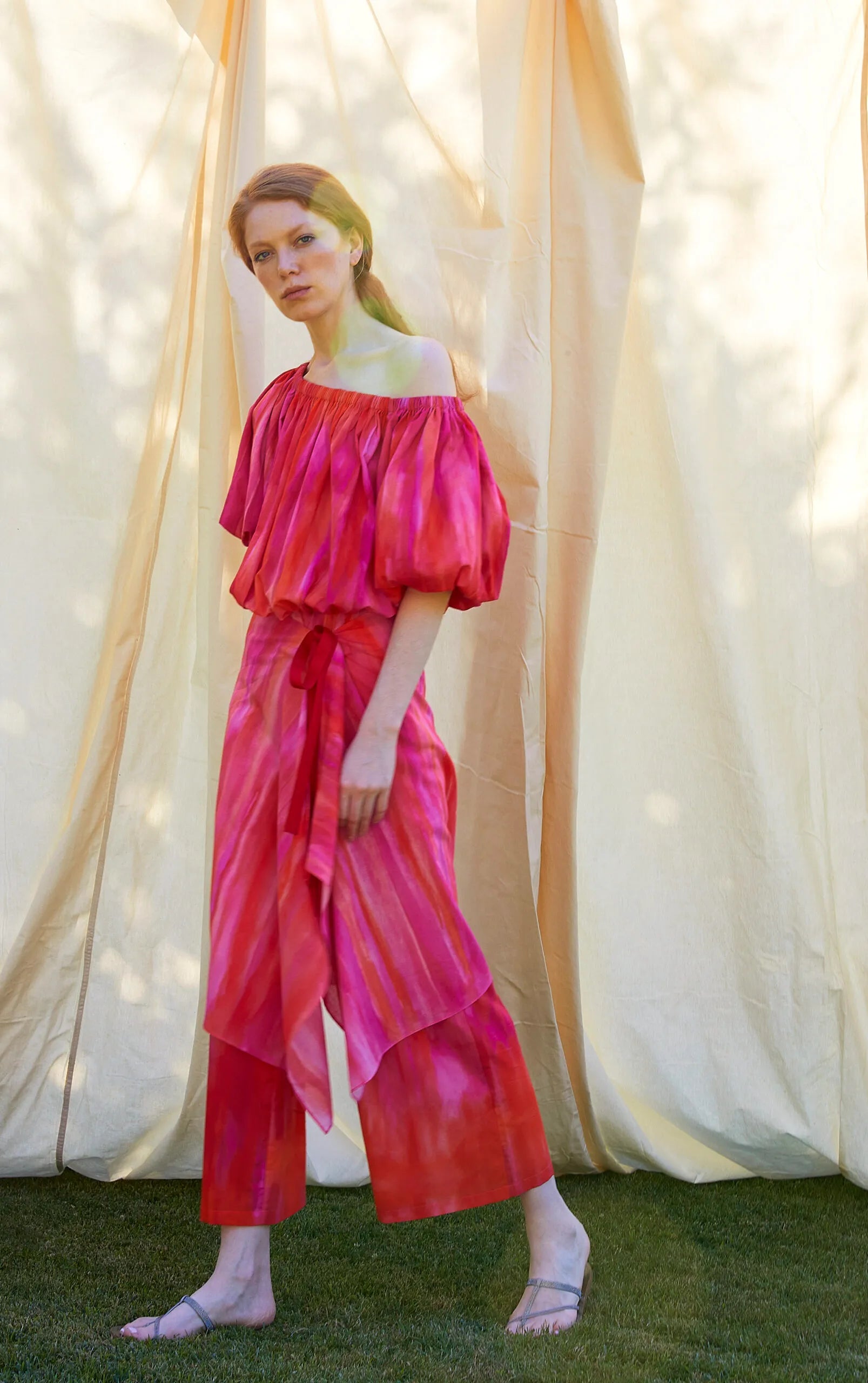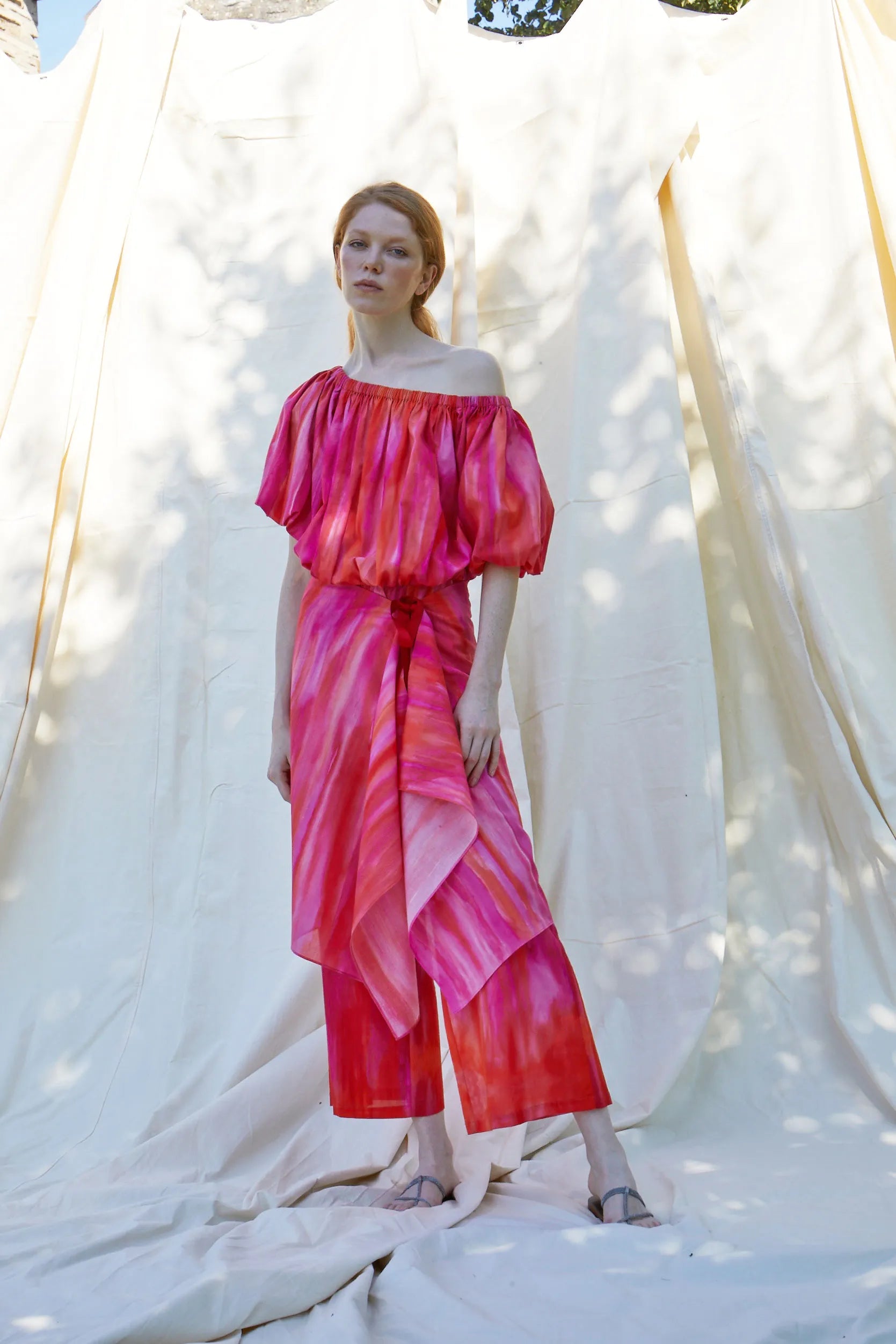 100 pamuklu, yakası lastikli tulum.Desen:Gün batımından ilham alınarak tasarlanan “Rouge” deseni, beyaz %100 ipek kumaş üzerine çeşitli batik teknikleri ve...