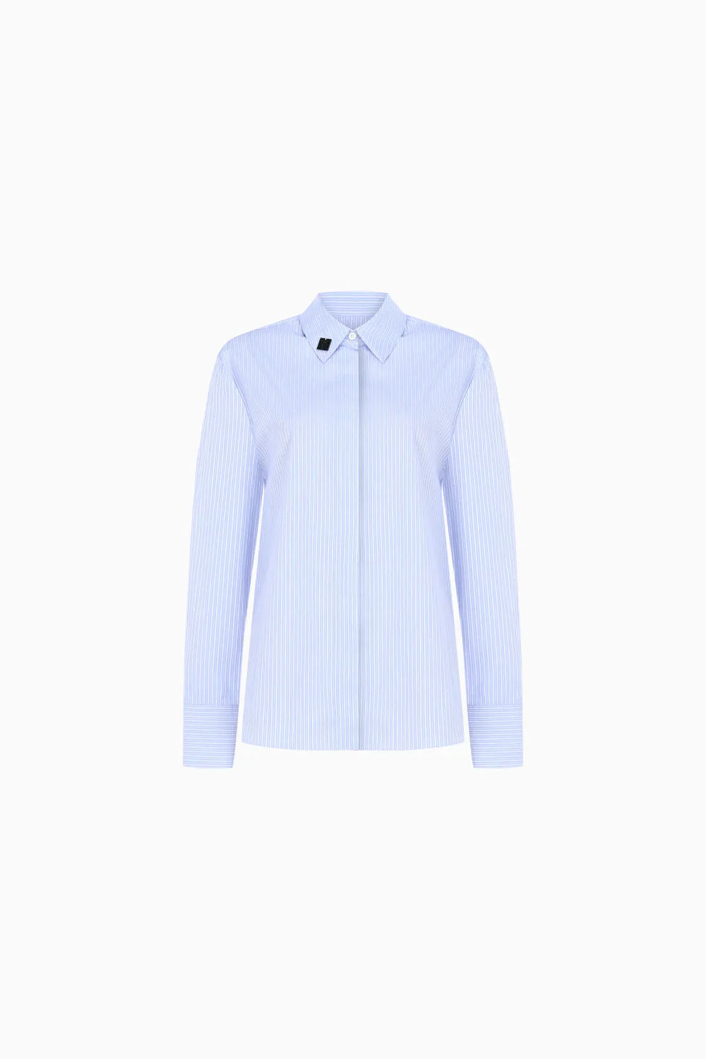 Long sleeve, wide cut, stand-up collar shirt with striped fabric.