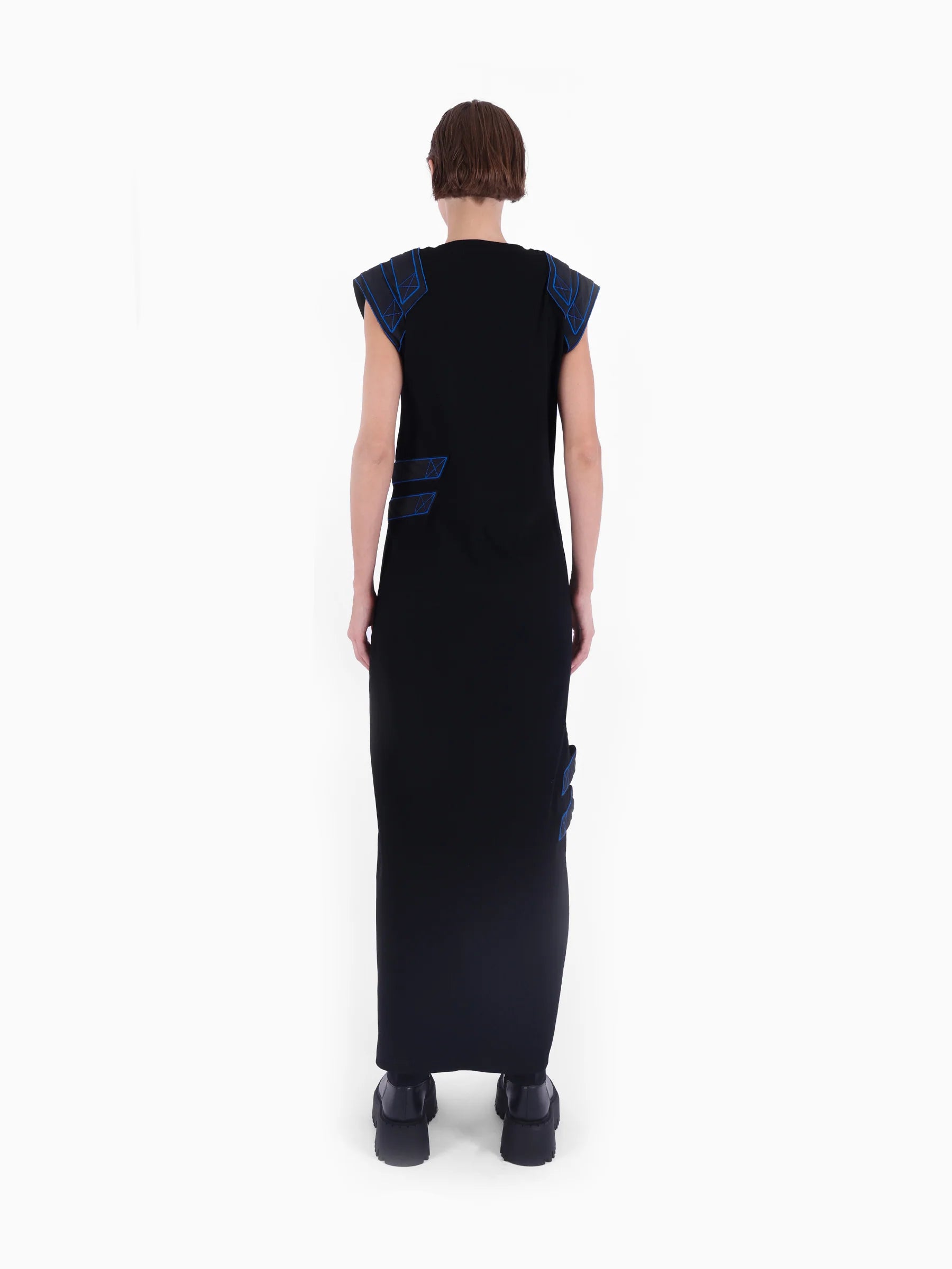 Strappy, Halter Neck, Open Back, Slits on Both Sides, Blue Knitted Dress with KNTLGY Logo Patch on the Back