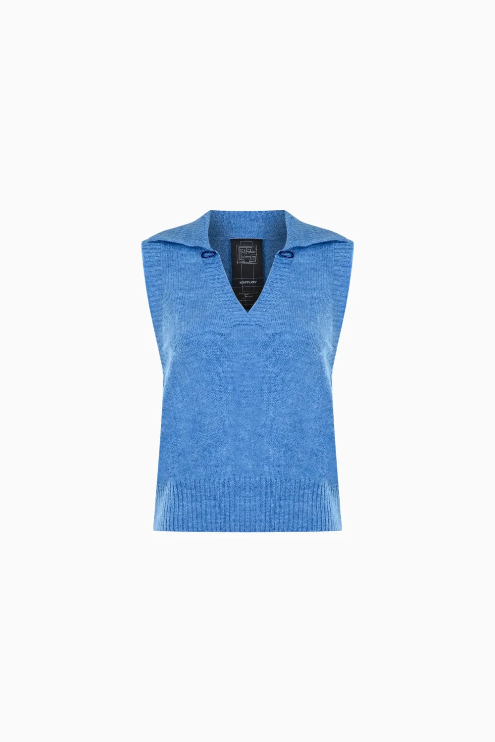 Polo collar, sleeveless short sweater with blue metal accessory detail on the collar and KNTLGY logo patch detail on the back body.