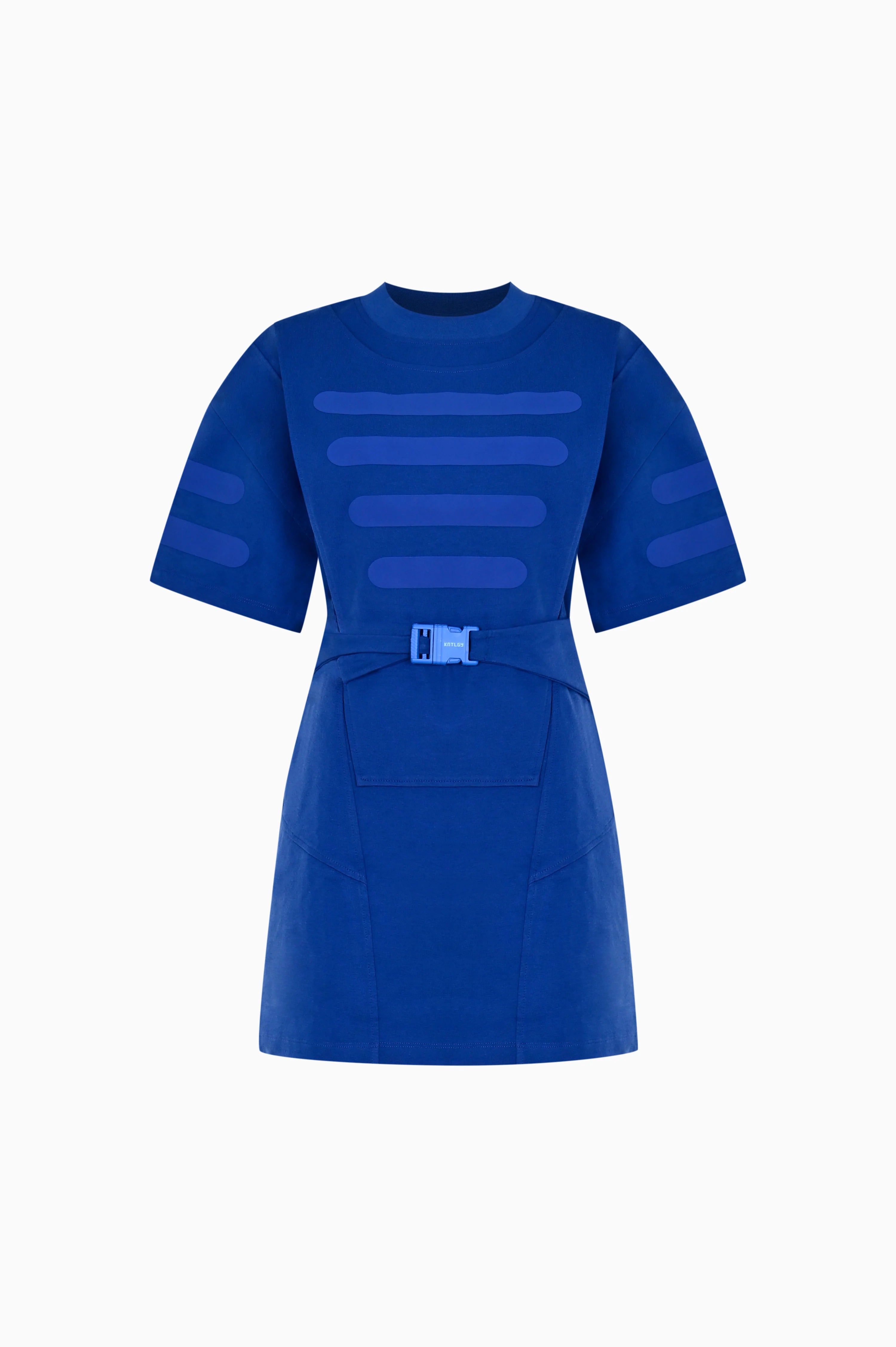 Blue Mini Cotton Dress with Hidden Cargo Pockets, Short Sleeves, Colorful Printed, Own Fabric, Additional Belt, Clip Buckle