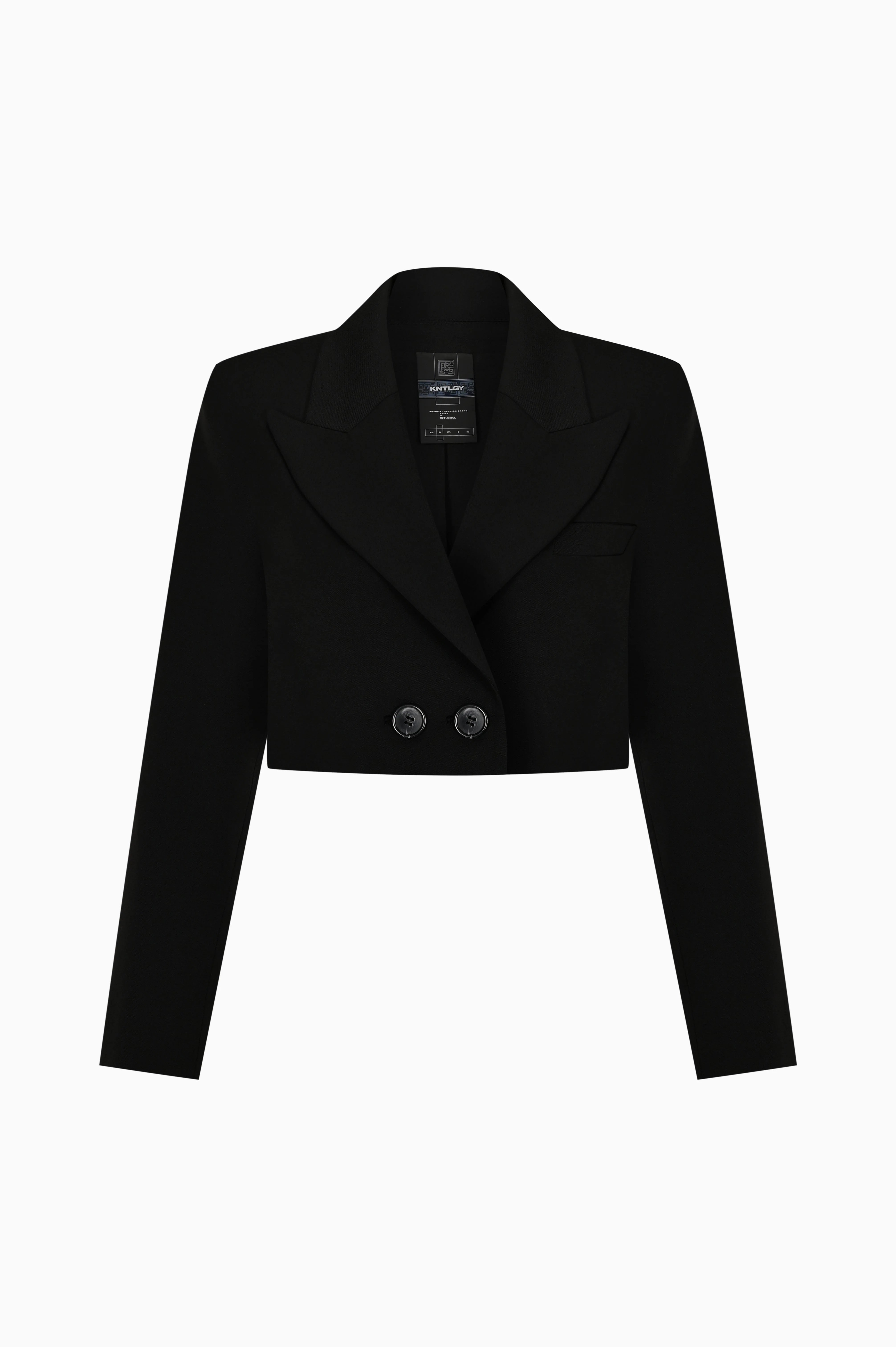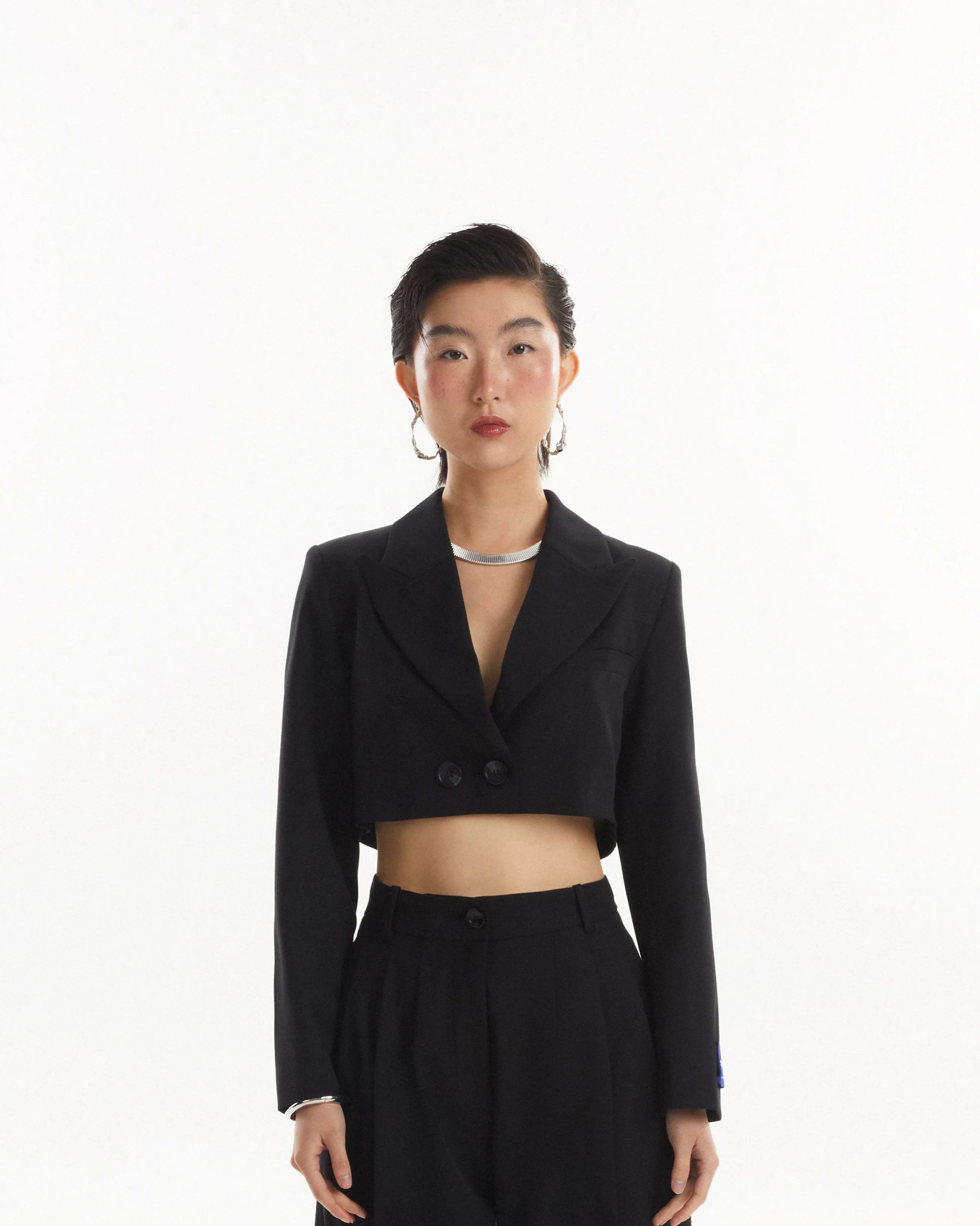Long sleeve crop blazer in black wool blend fabric with double button closure detail.
