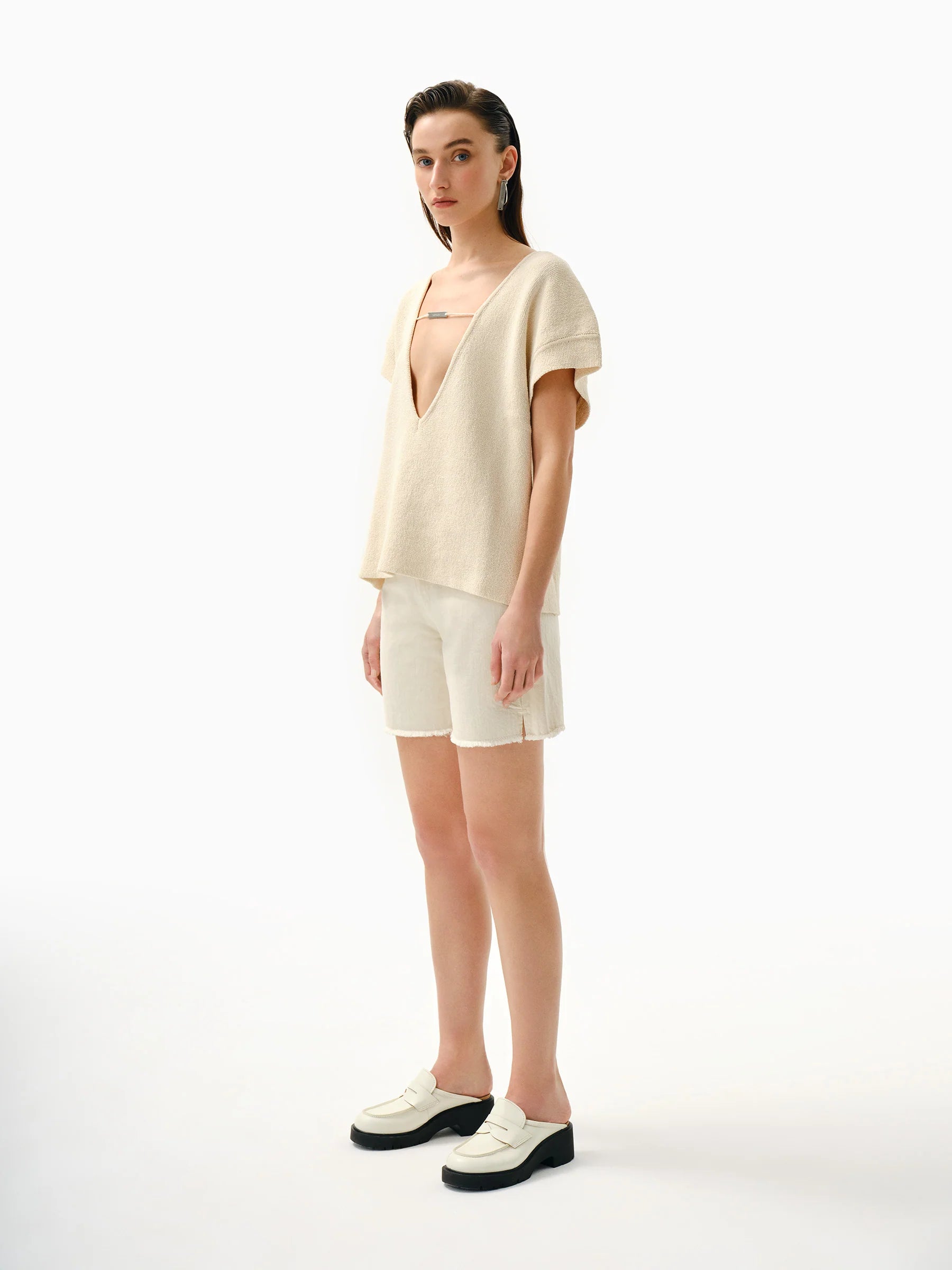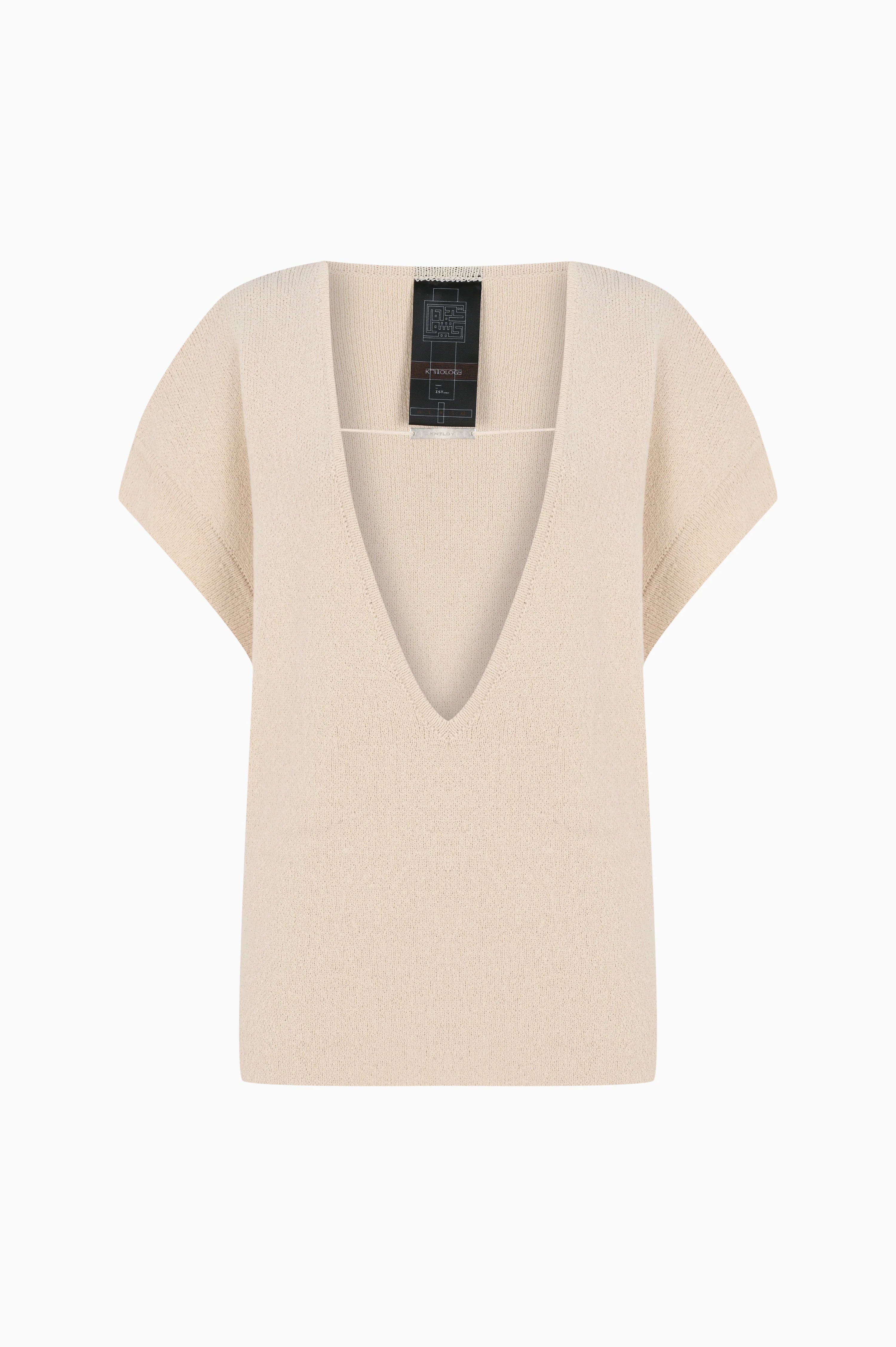 Beige knitted top with deep V-neckline, center stripe and metal hardware detail.