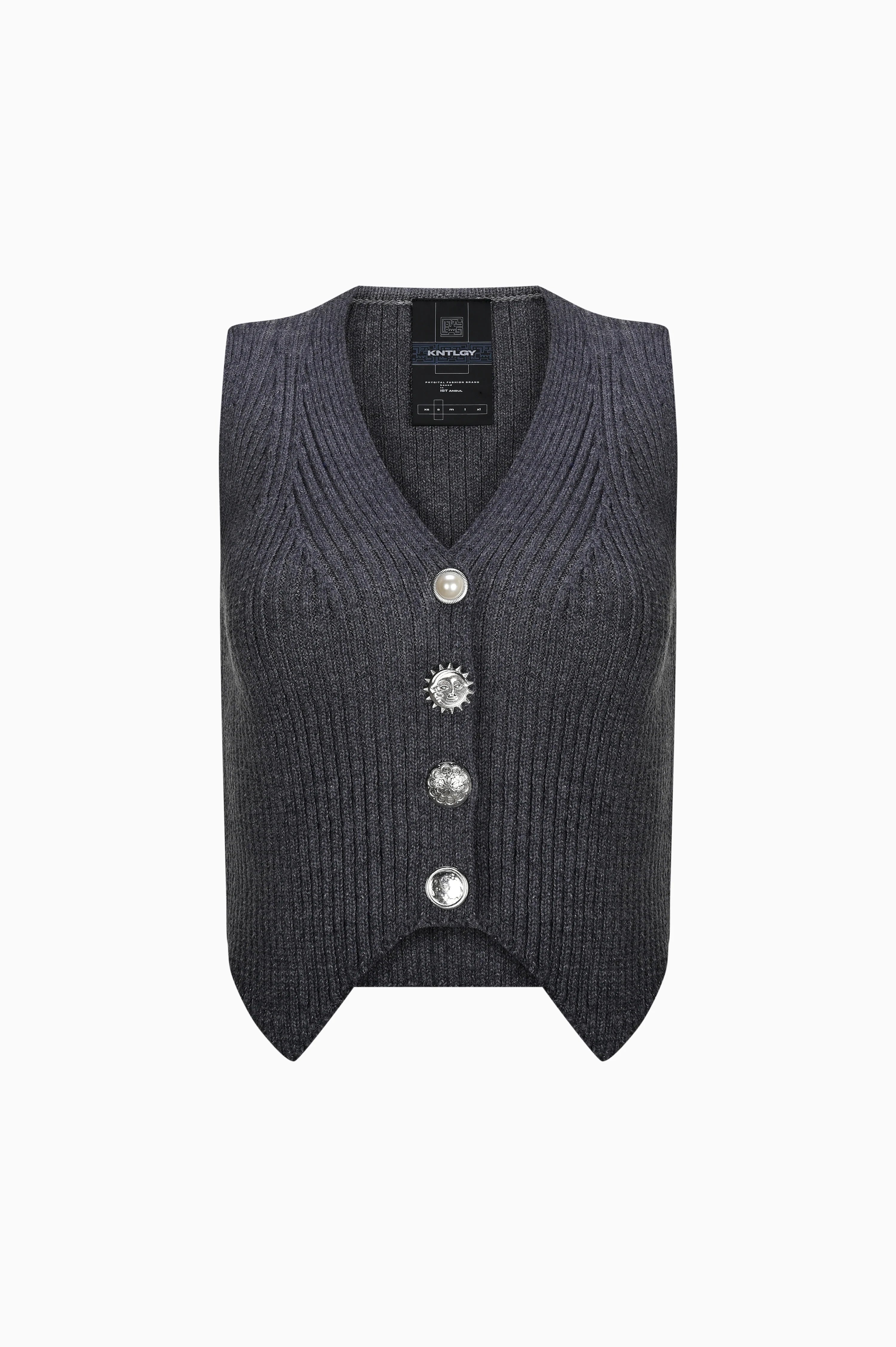 Design button closure, Zero sleeves, Asymmetric finish, Gray knit vest.