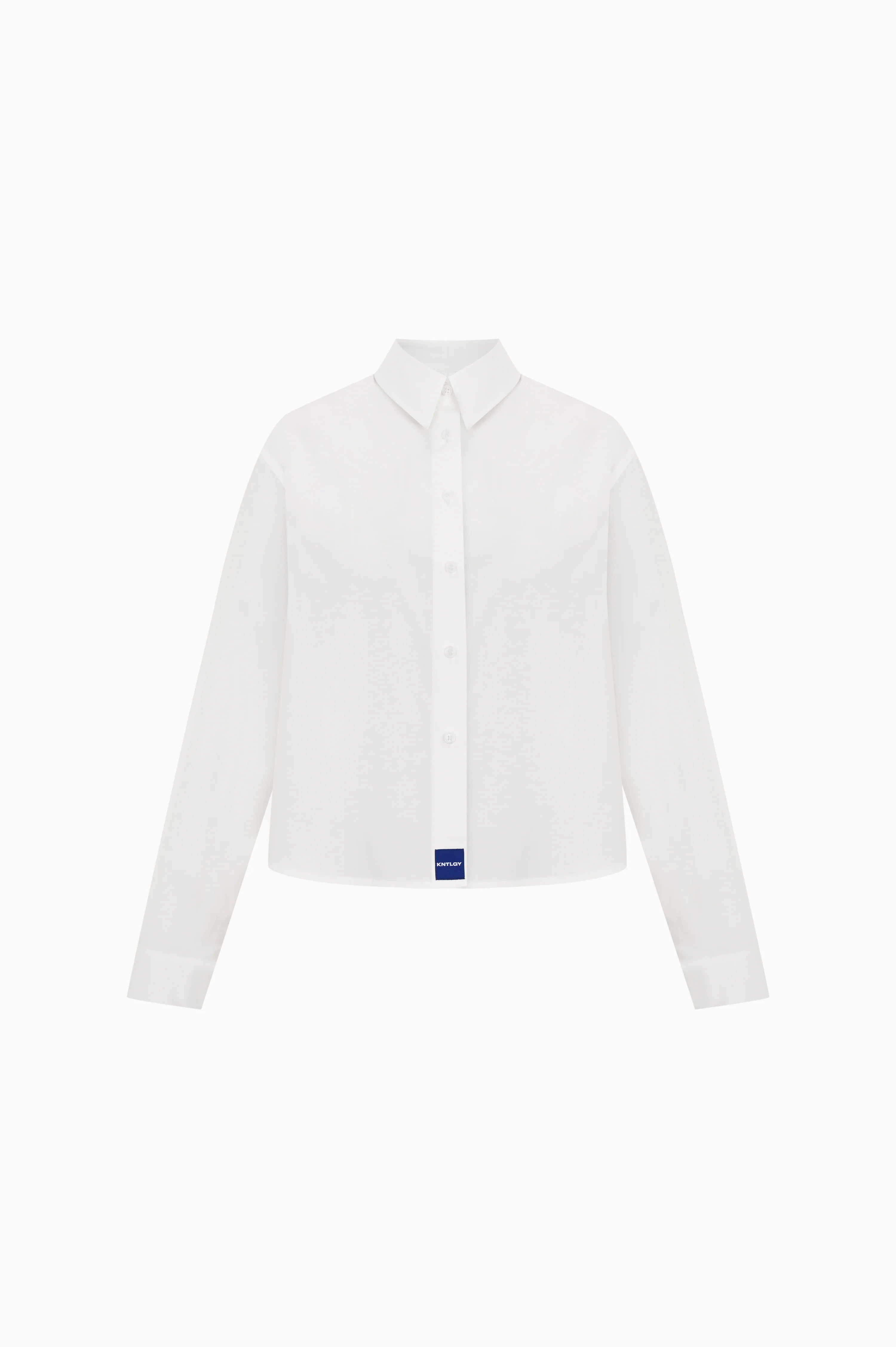 White cotton fabric, KNTLGY blue patch detail on the front lower body, Button closure, Long sleeve shirt.