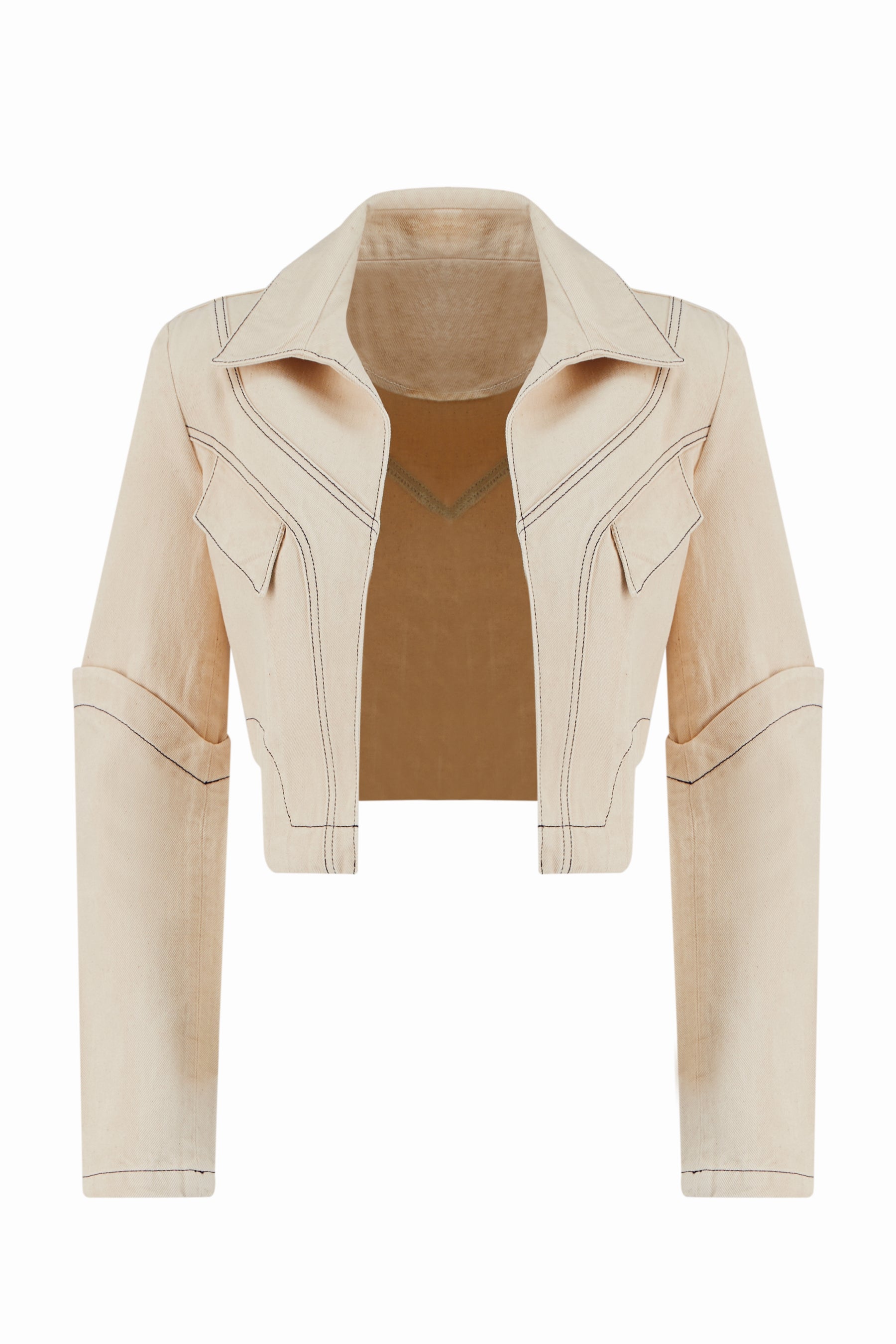 Beige Cotton Crop Blazer, Asymmetric Hem.