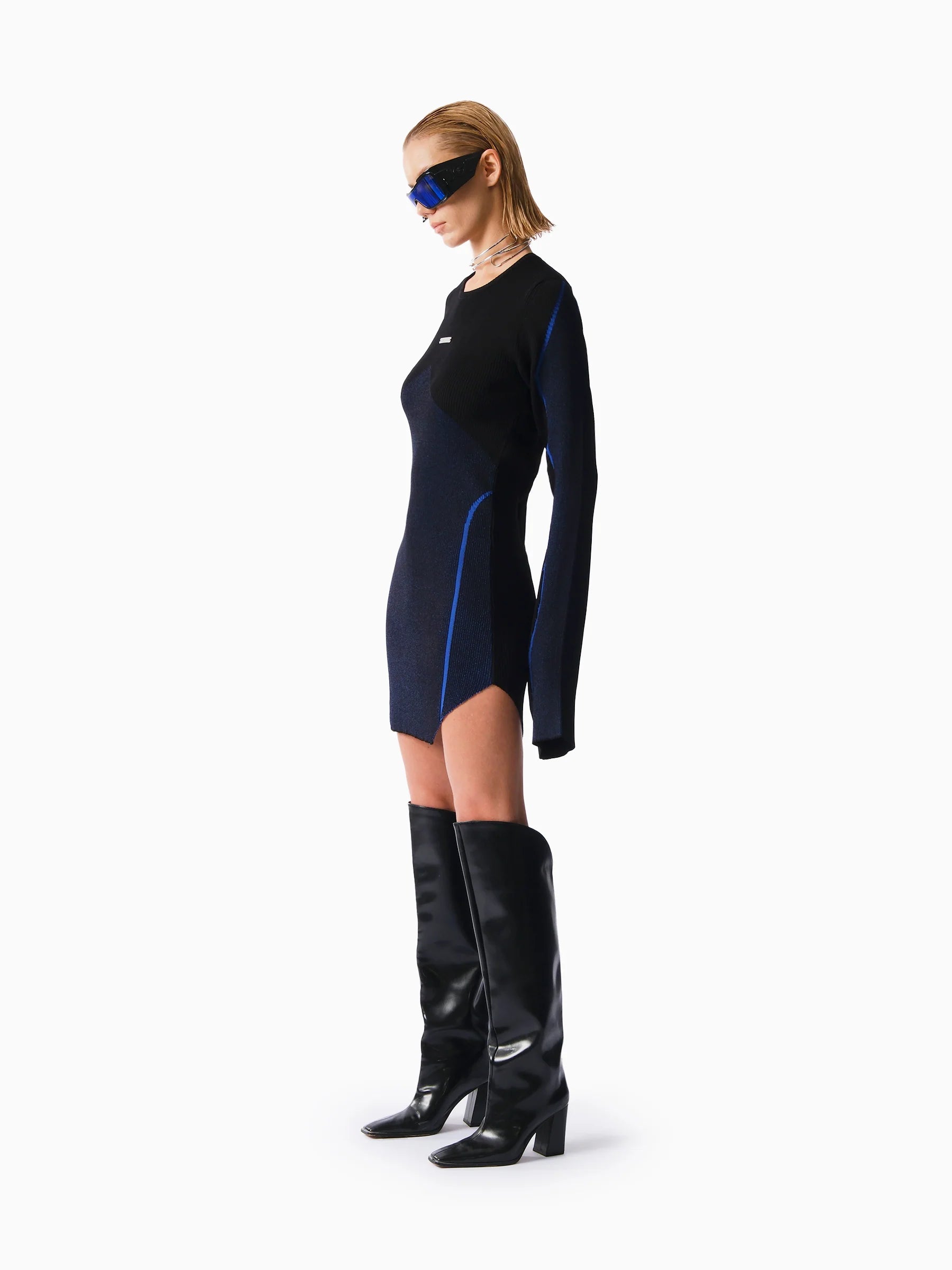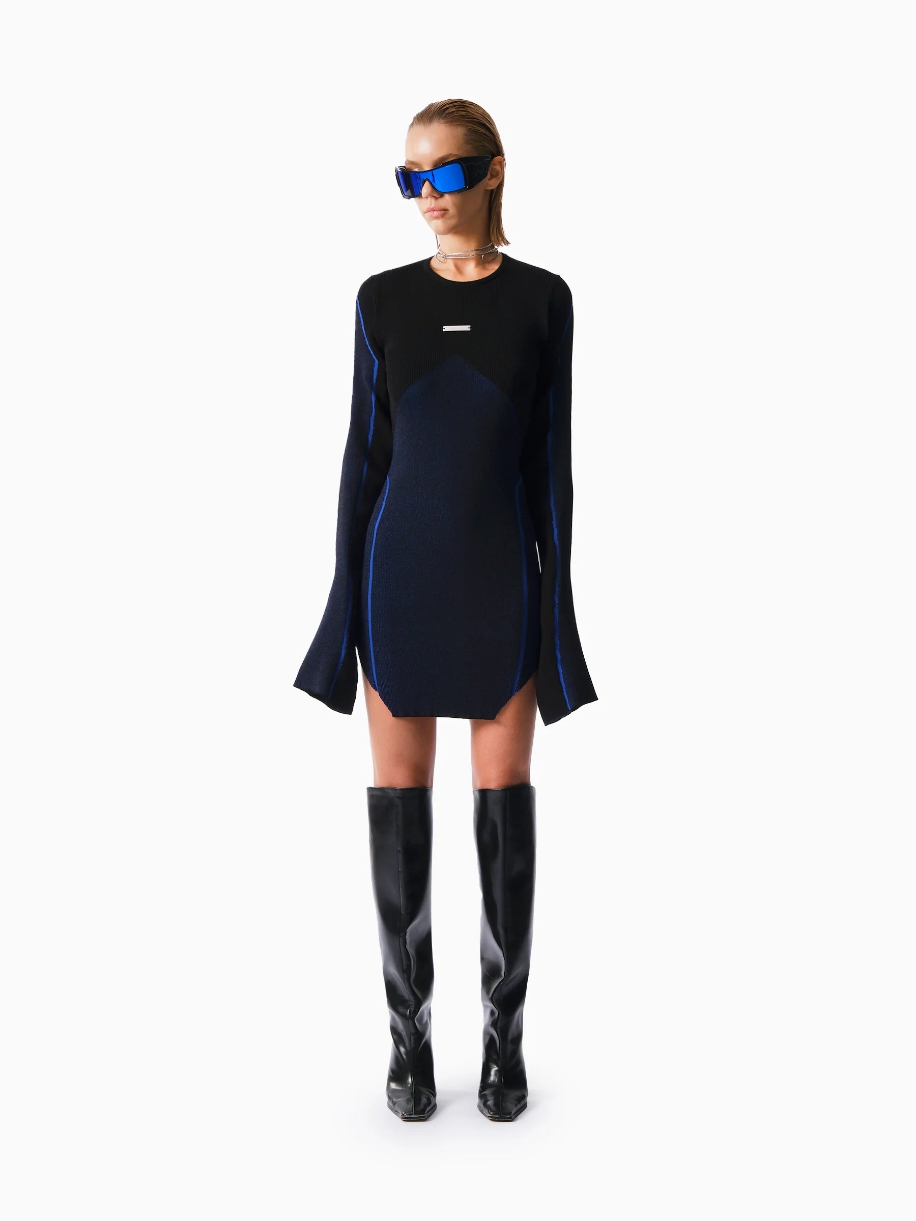 Trompet kollu ve nervürlü detaylara sahip elbise, önü tırtıklı metal logolu aksesuar. ön tarafta oval şekilli vurgular.