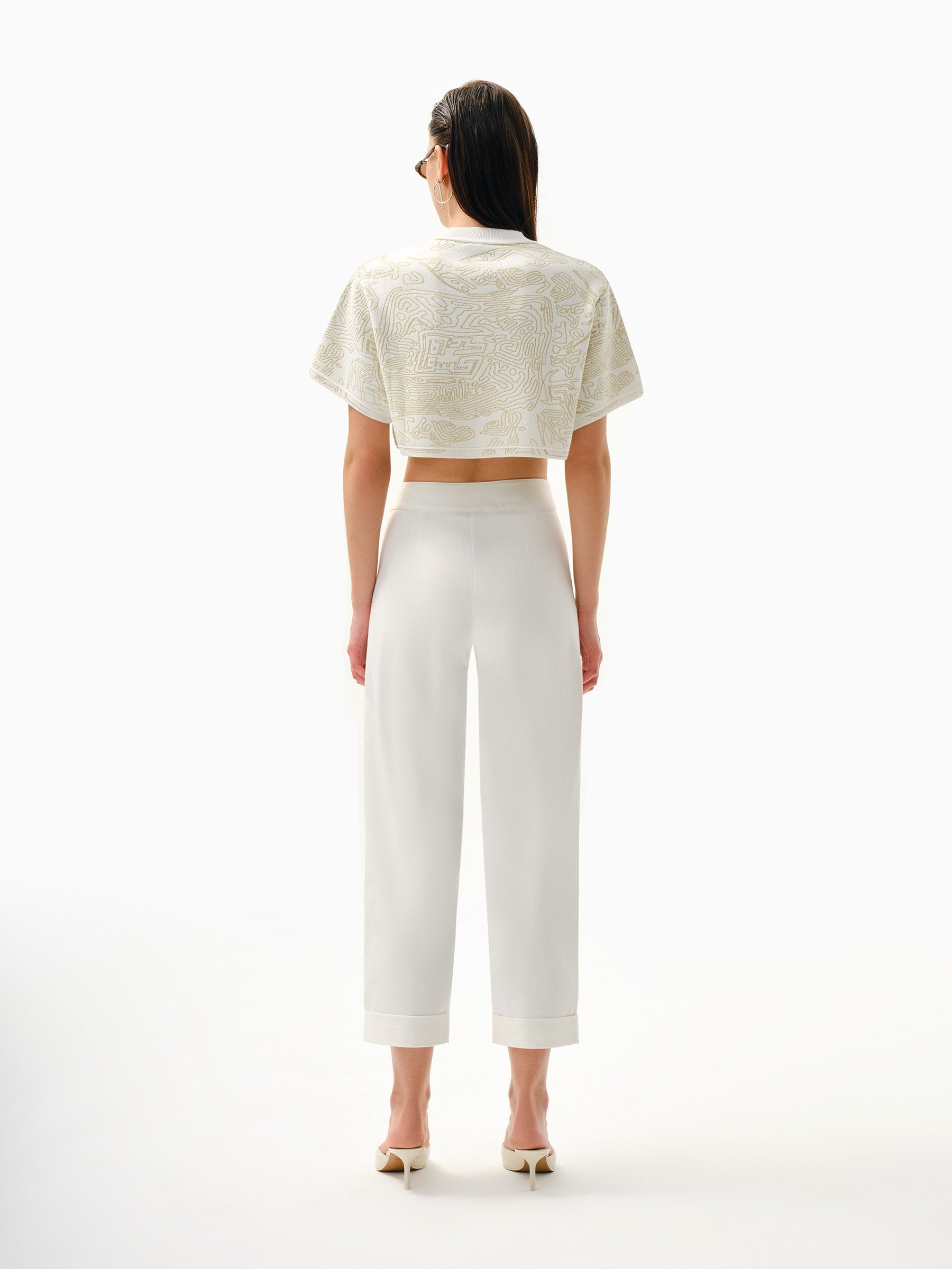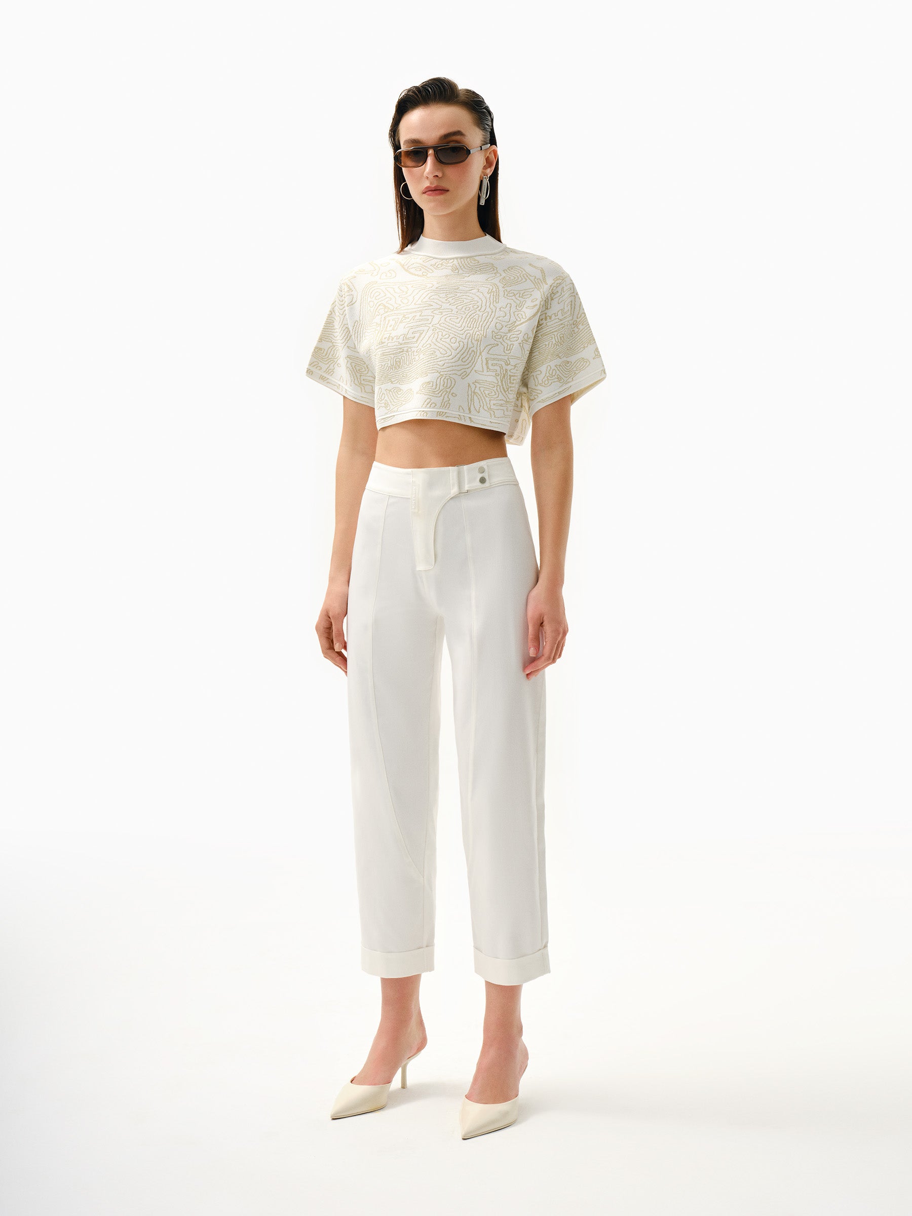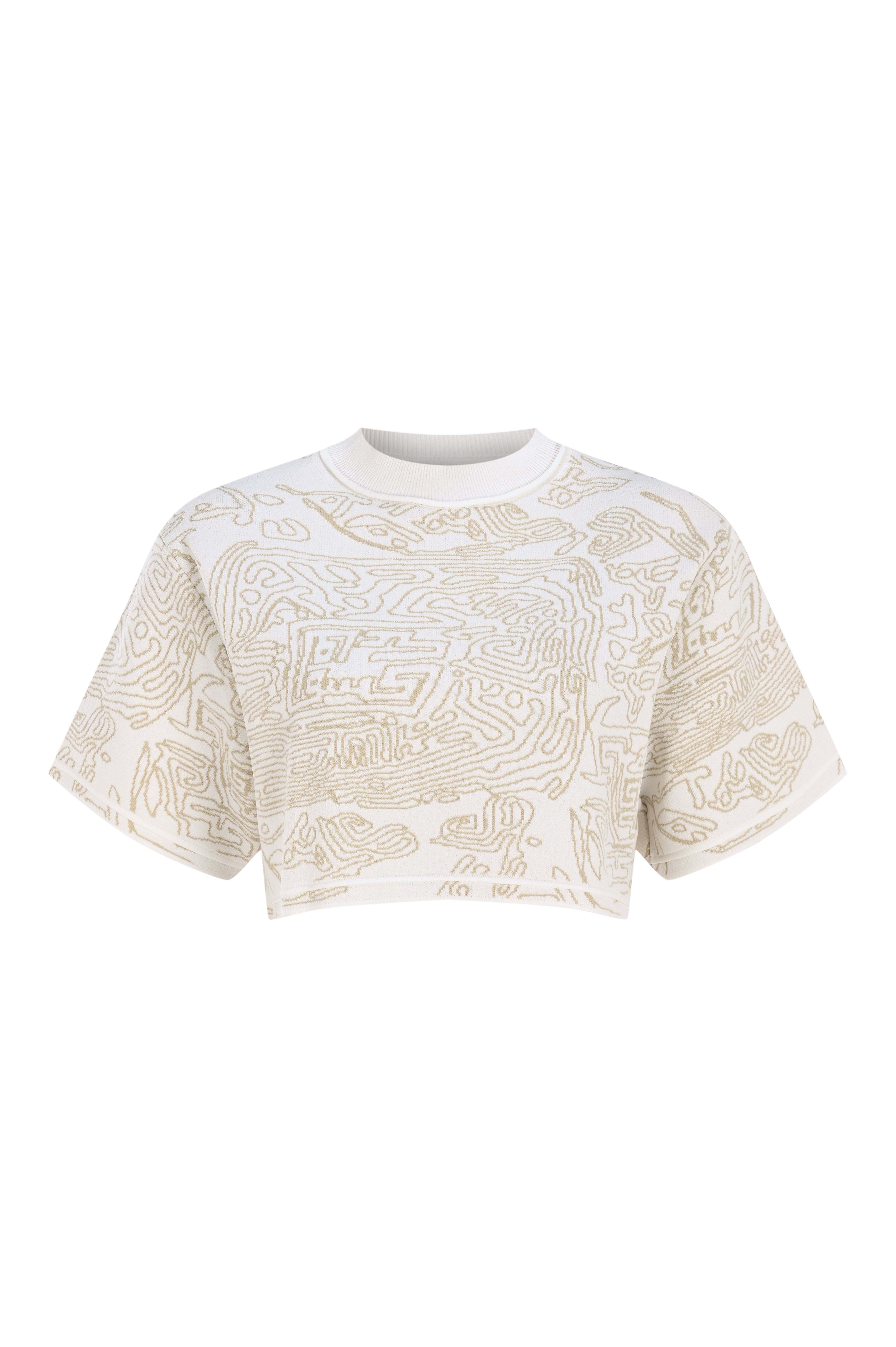 Fingerprint Jacquard Knitted, Zero Neck, Short Sleeve, Crop Top with KNTLGY Patch Detail.