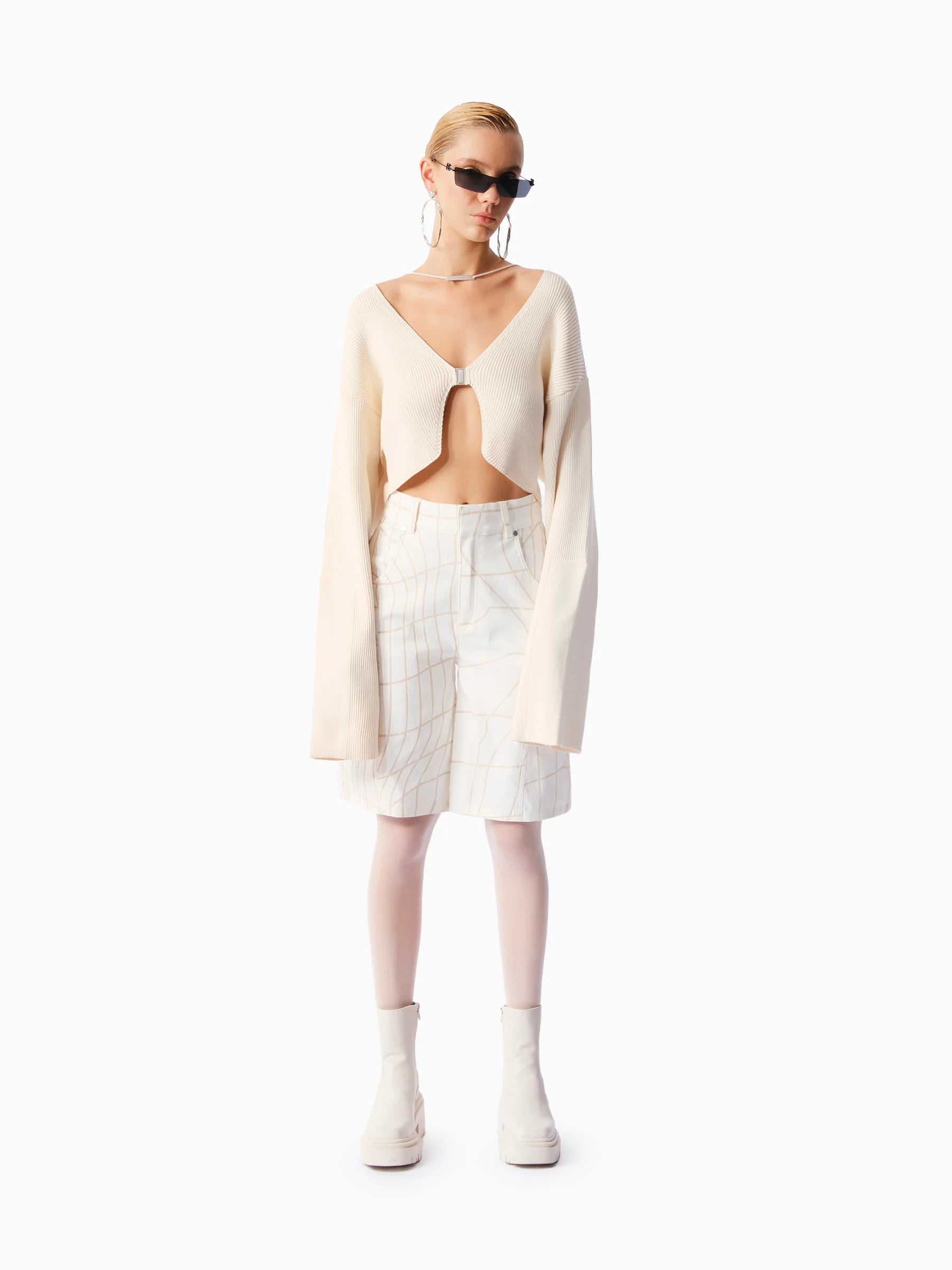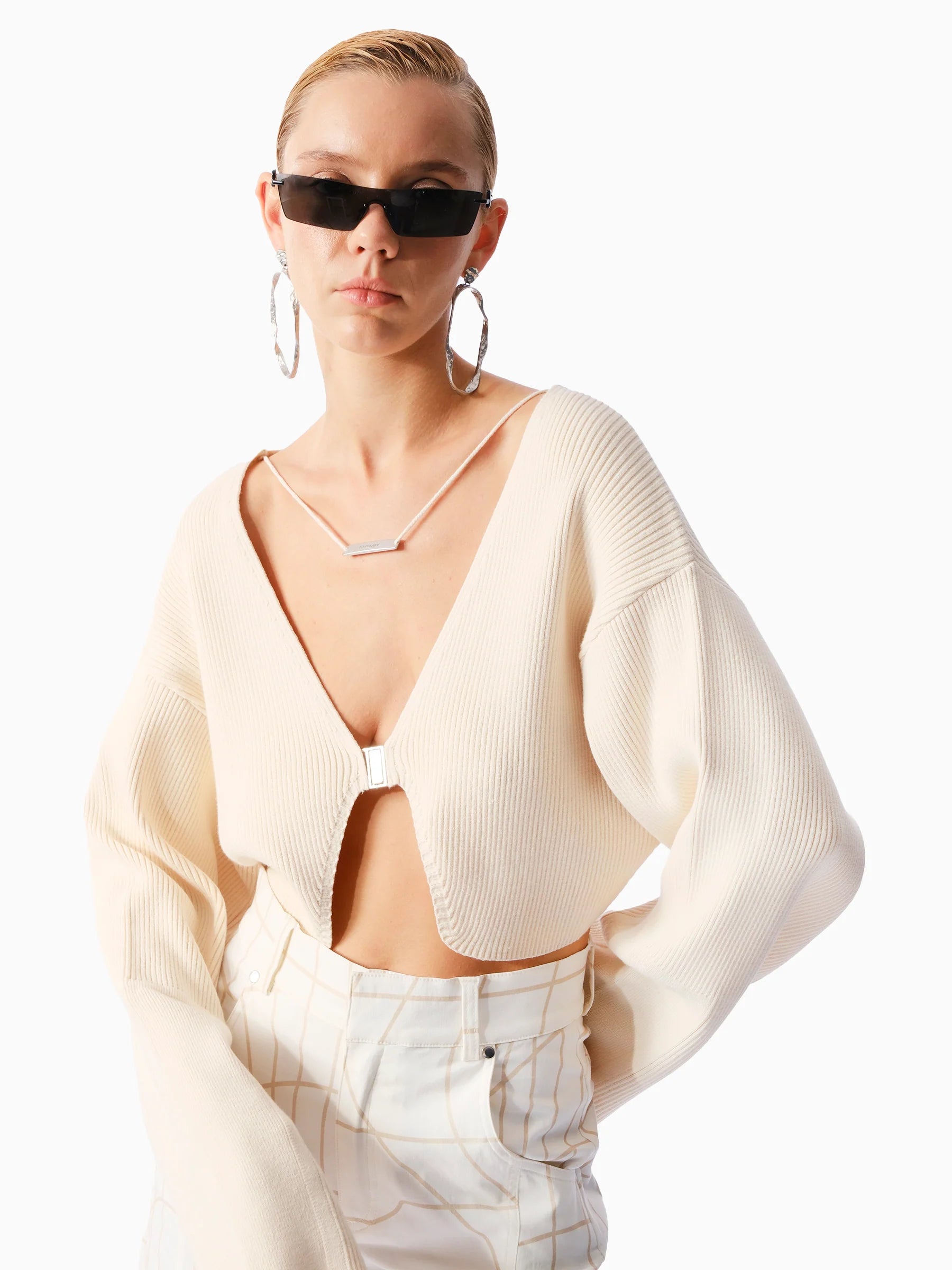 Önü metal tokalı, yakası örgülü metal logolu kordon detaylı ve geniş balon kollu bej kısa hırka.