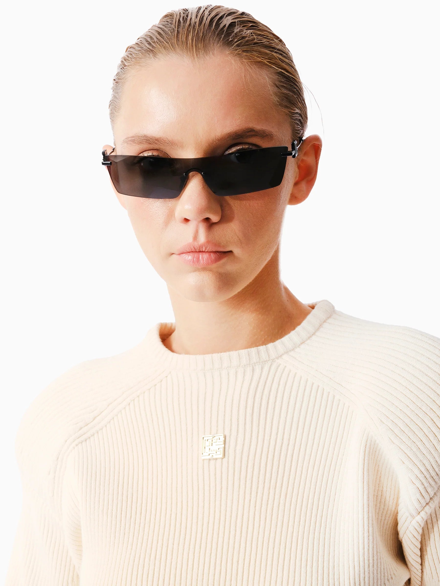 Önü parlak altın logo detaylı bej kısa bir kazak. Kollarda ve gövdede X şeklinde örgü tasarım detayları.