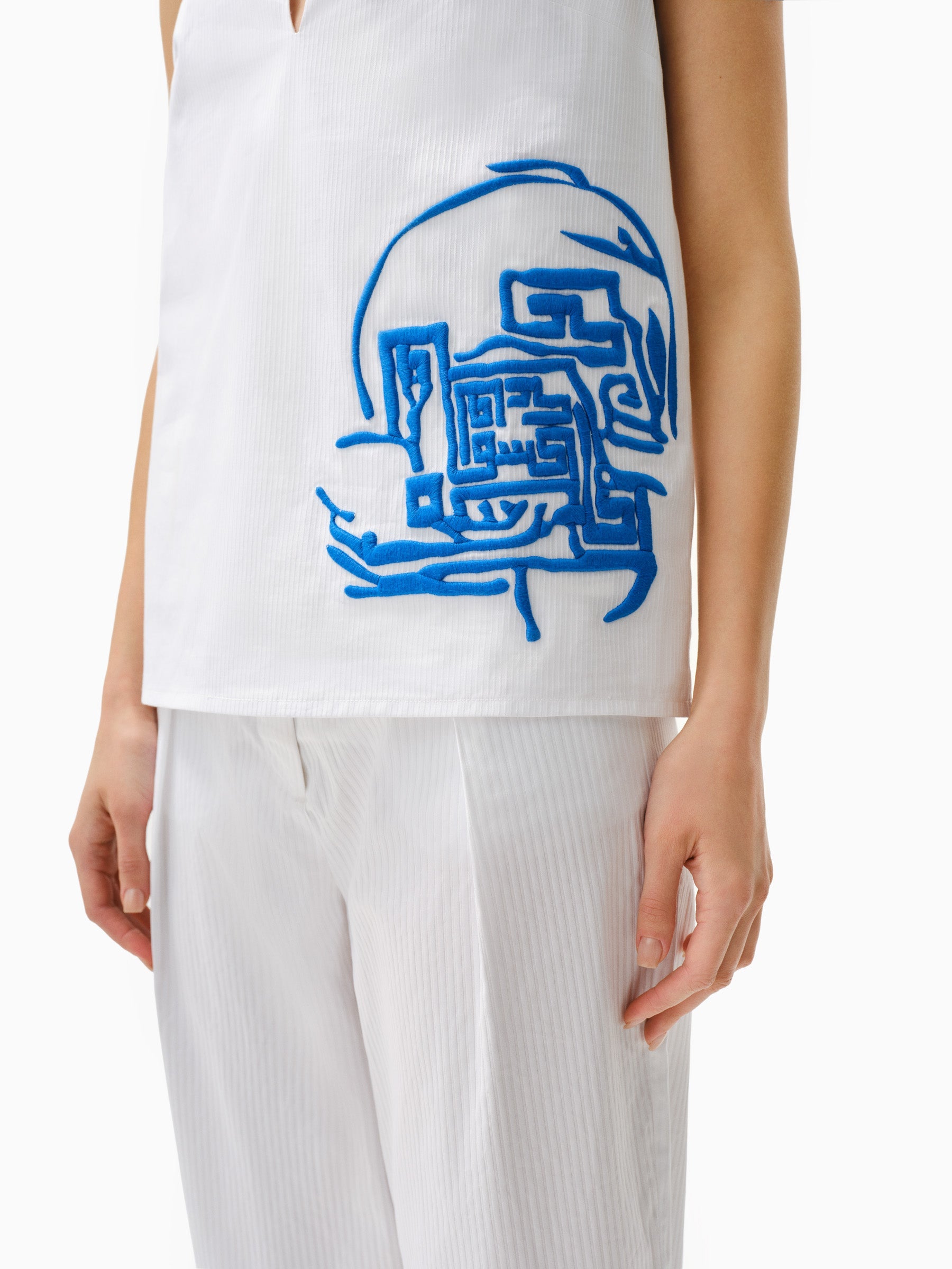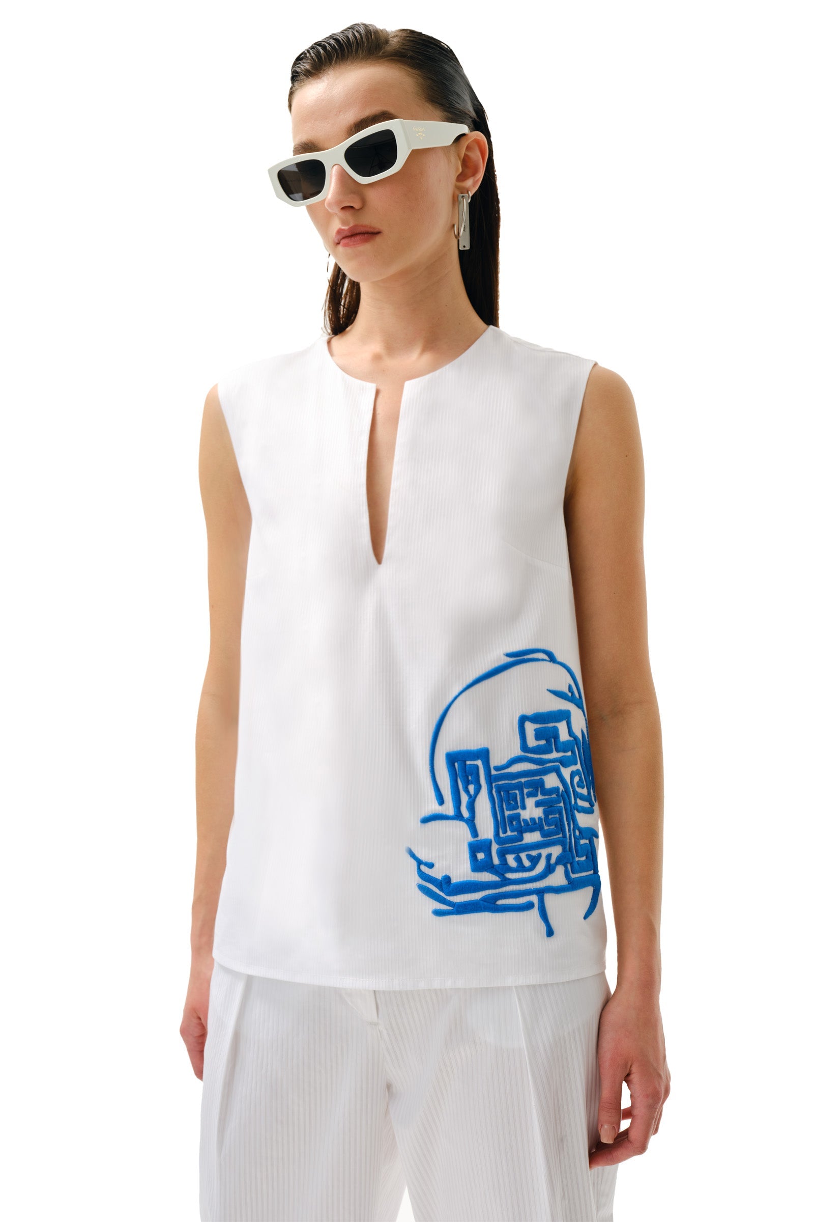 Göğsün sağ tarafında KNTLGY Fingerprints nakışı ile detaylandırılmış çizgili beyaz kumaştan bir yelek. Derin V yaka ve kol açıklıklarına sahiptir.