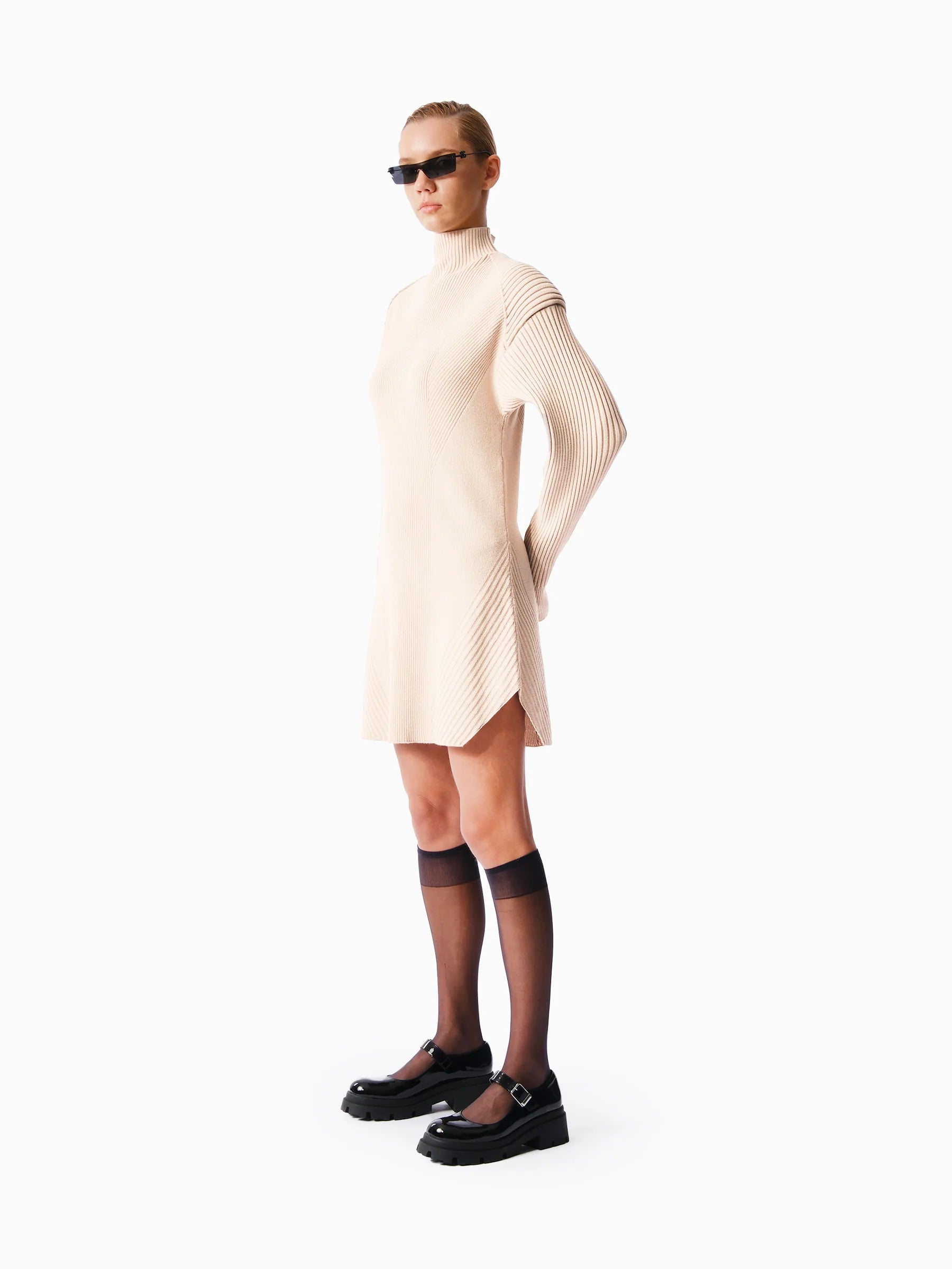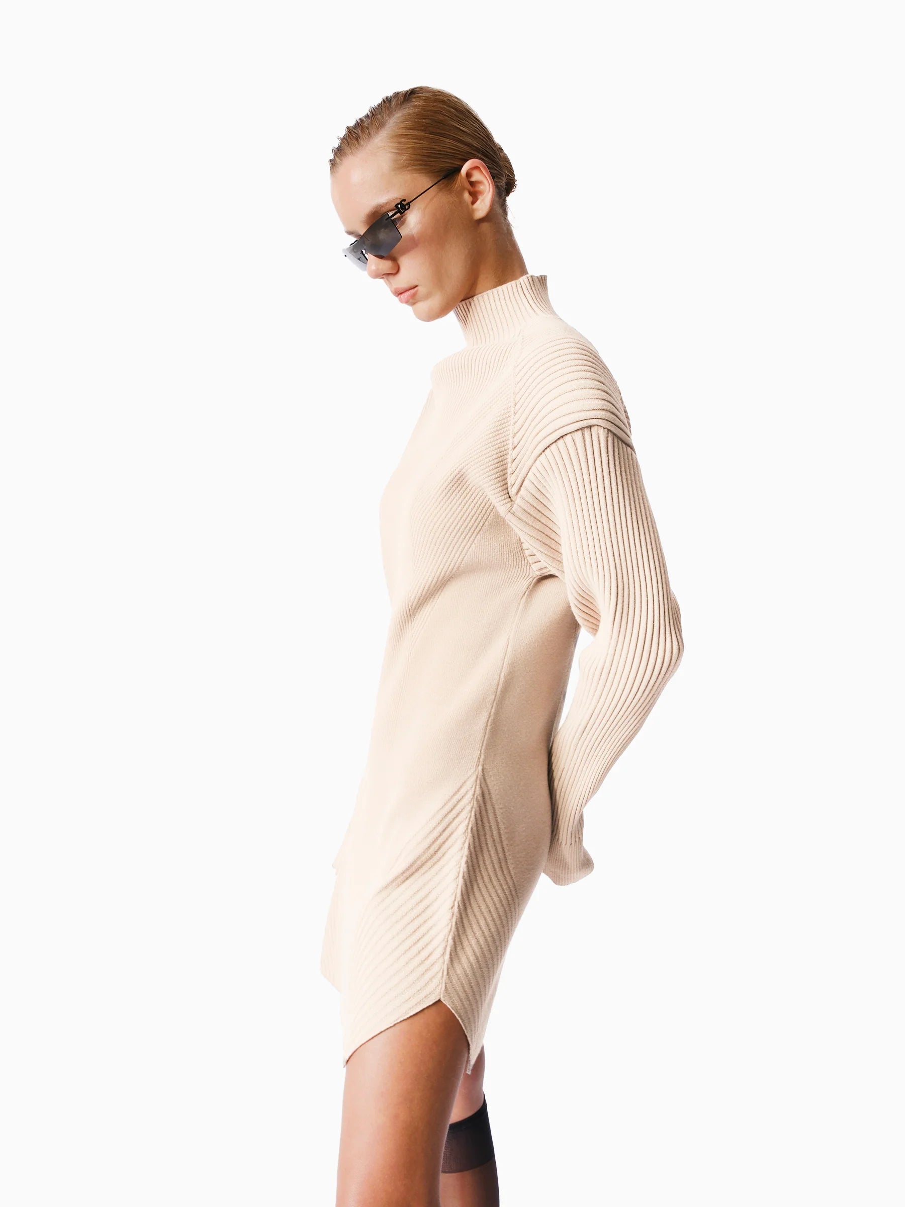 Kollarında metal örgü Logolu, uzun kollu ve örgü desen detaylı bej örgü balıkçı yaka kazak elbise.
