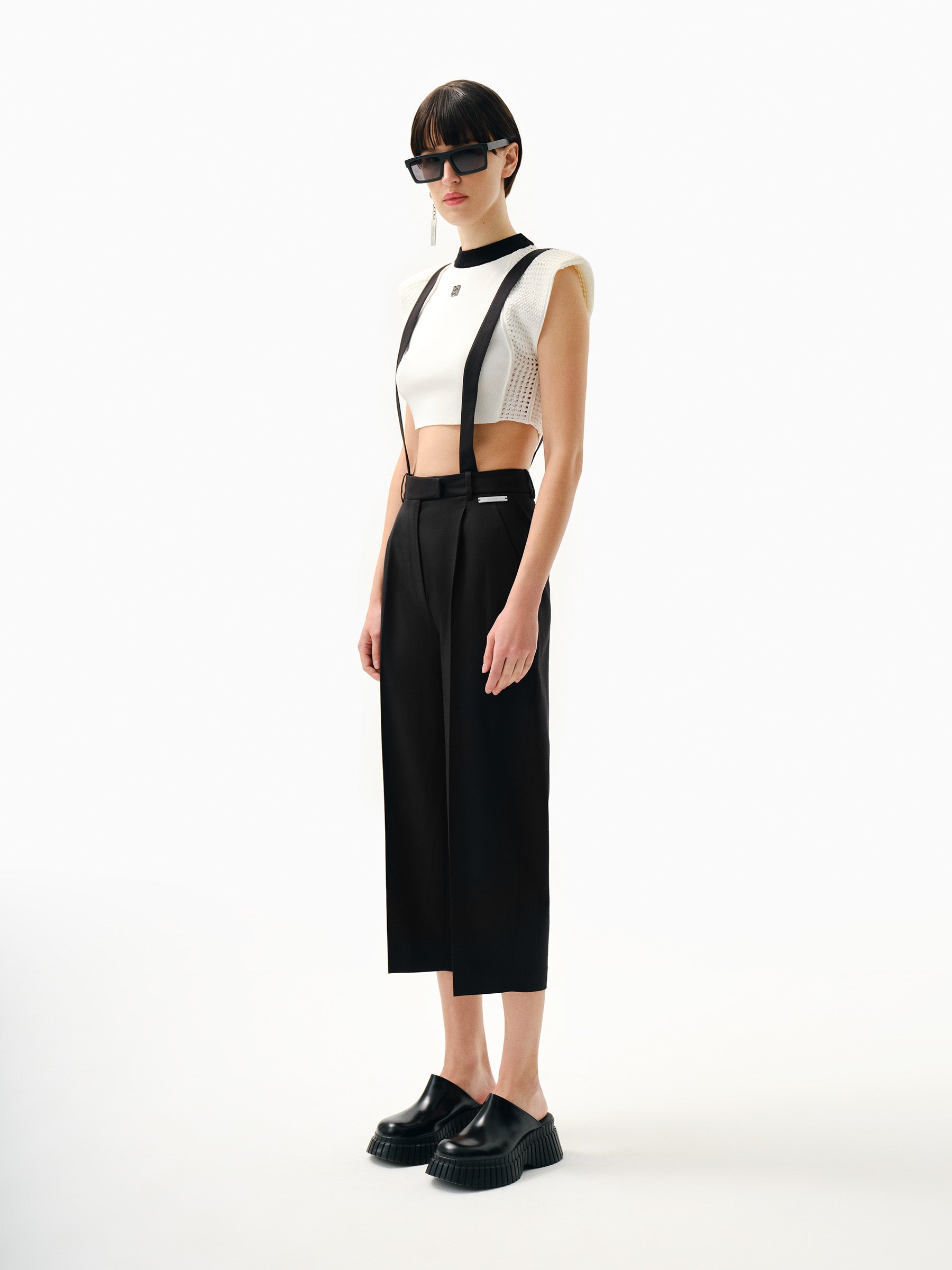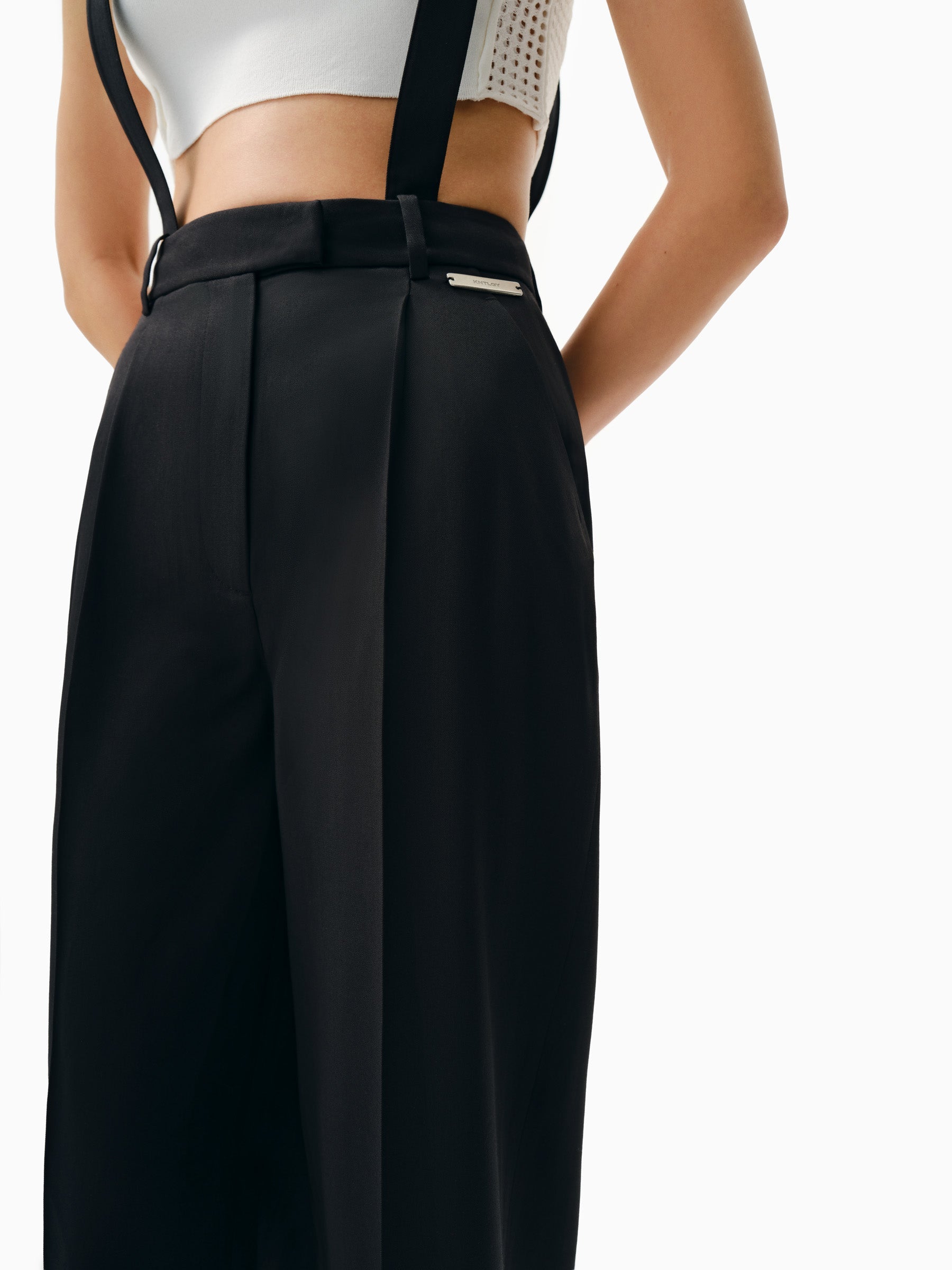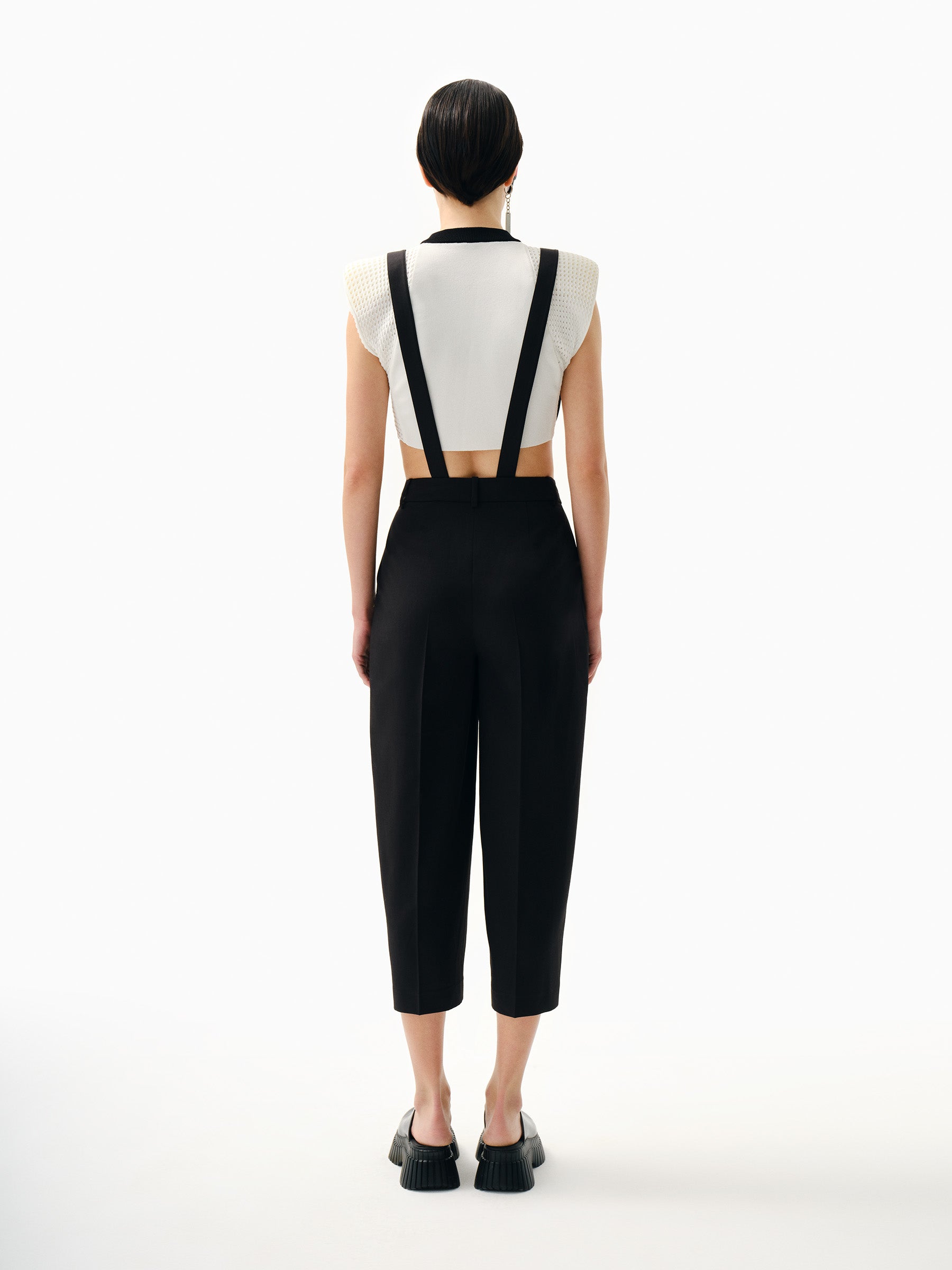 Dokulu yün karışımı kumaştan bol kesim tulum. Askılı ayarlanabilir omuzlar. Ön yama cepli. Önden düğmeli.