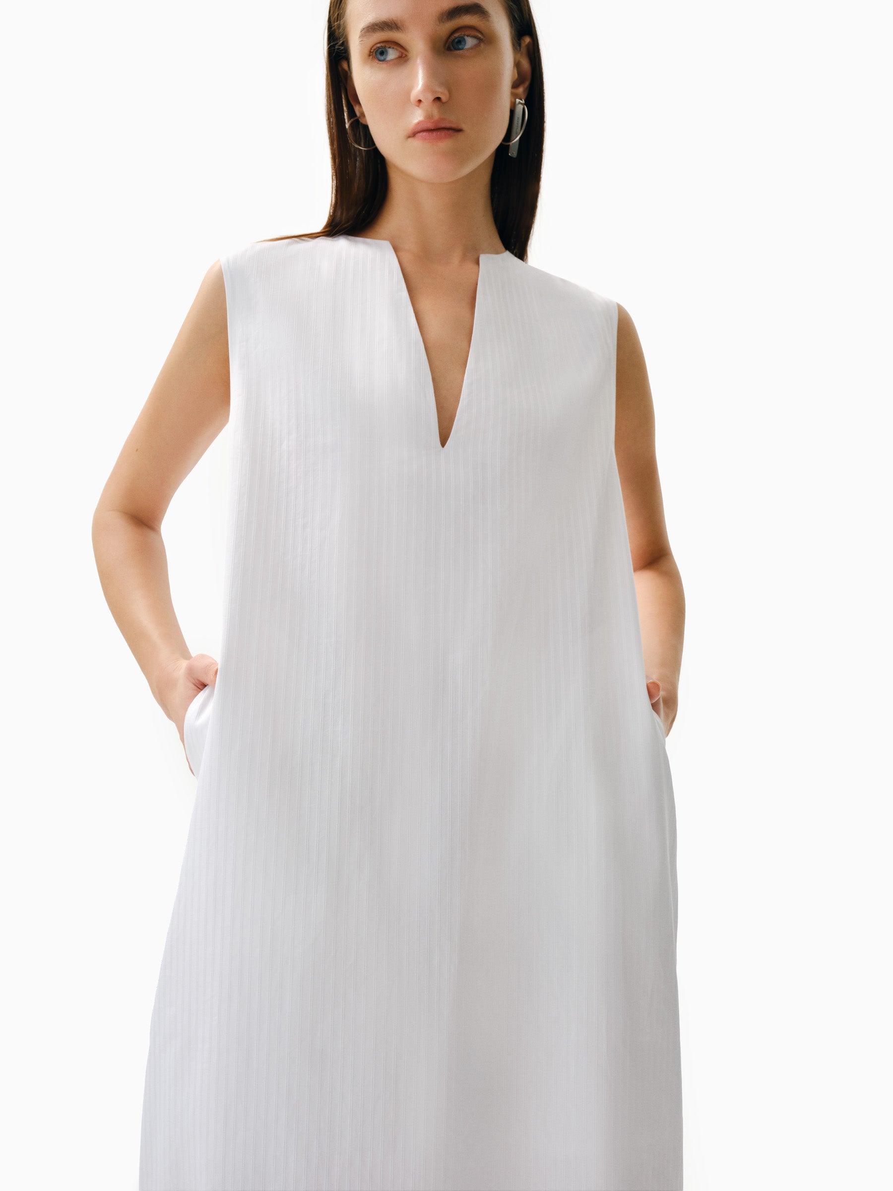 V yakalı, kolsuz, dökümlü elbise. Elbise 2 gizli yan cebe sahiptir ve balon siluetinde pamuklu kumaştan yapılmıştır.