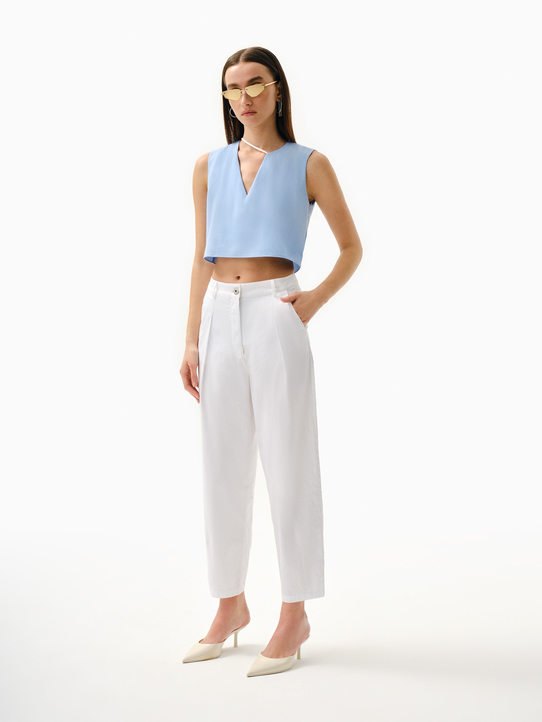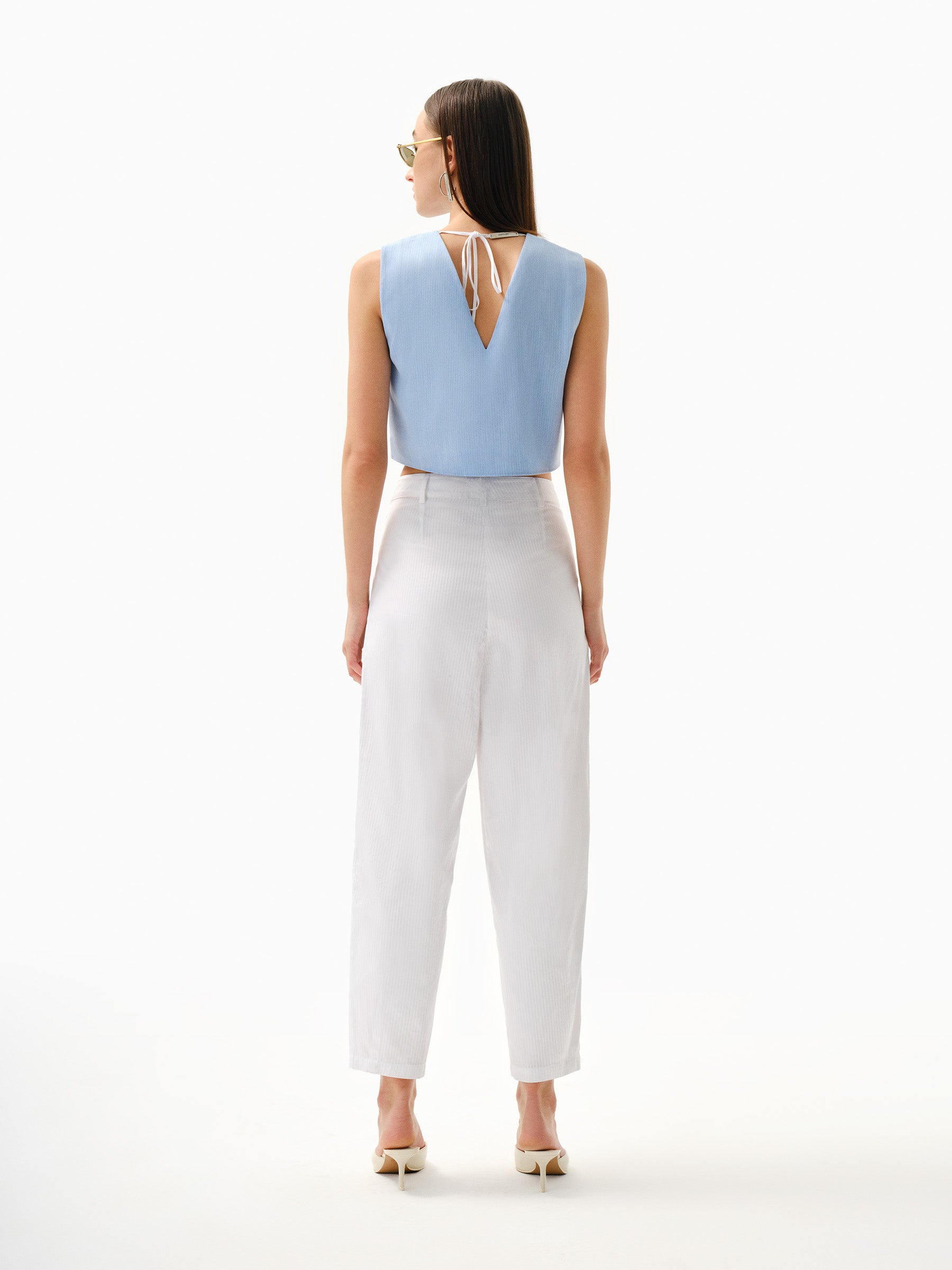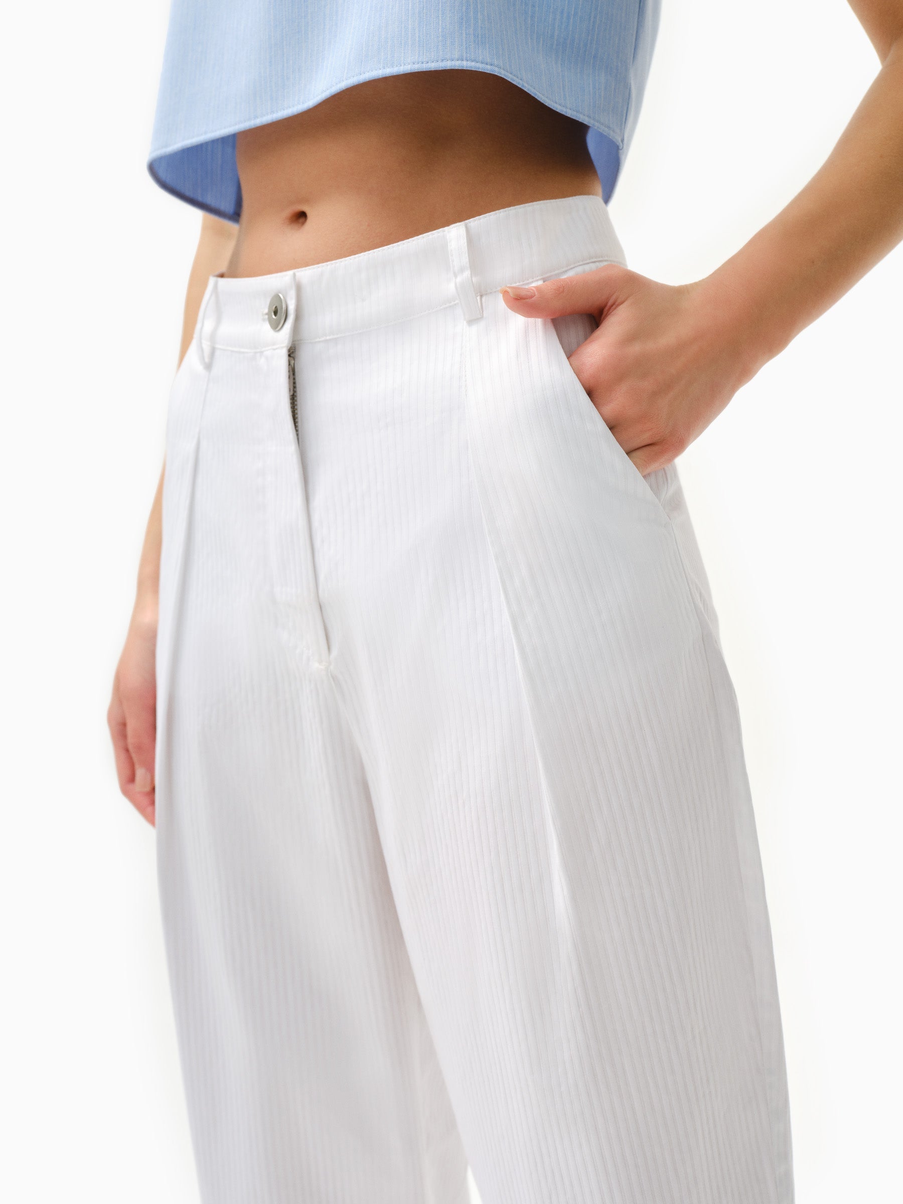 %100 pamuklu çizgili kumaştan üretilmiş pantolon. Yan cep detayları ve gizli kanca kapama özelliğine sahiptir.