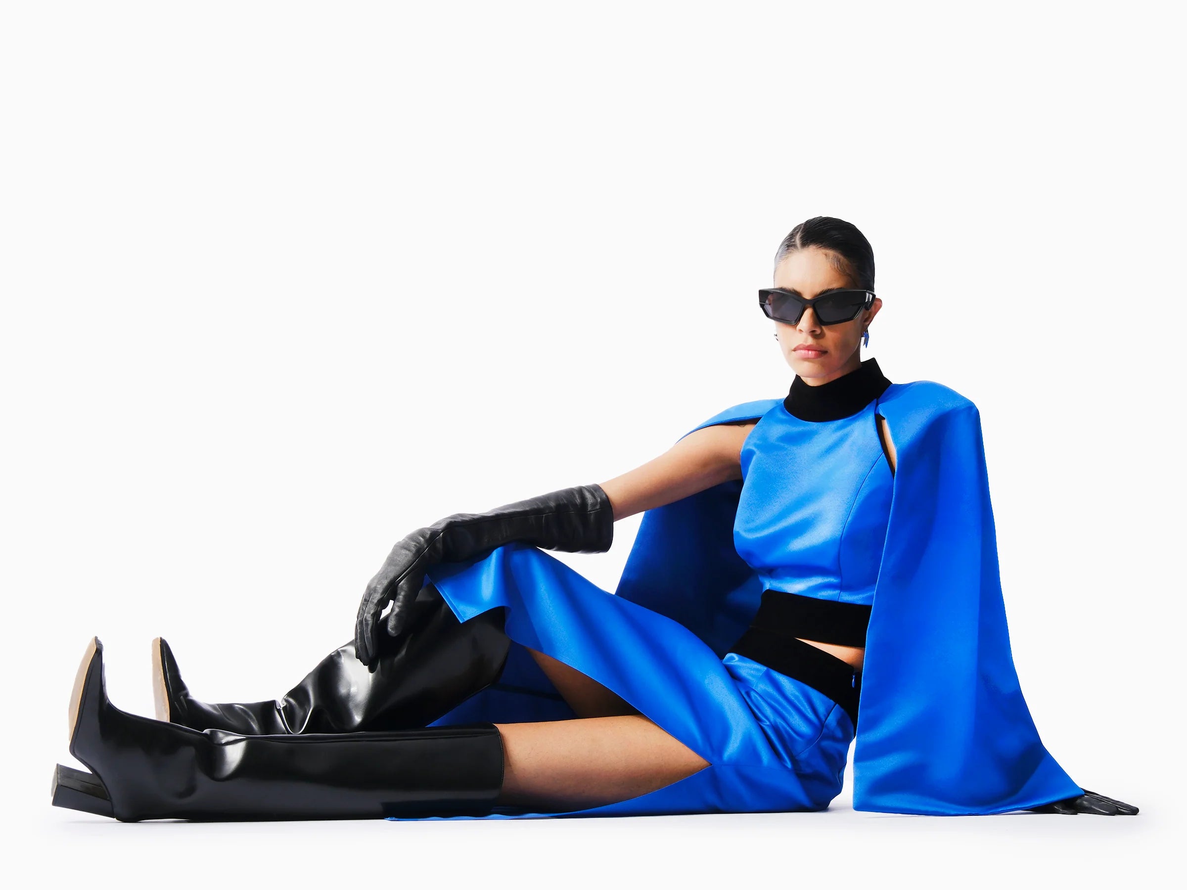 AI tarafından tasarlanan ve KNTLGY Ekibi tarafından tasarlanan saten mavisi midi etek, derin yan yarık, kadife bel kemeri, yüksek belli tasarım, gizli yan fermuar ve iki ön plise detayıyla.