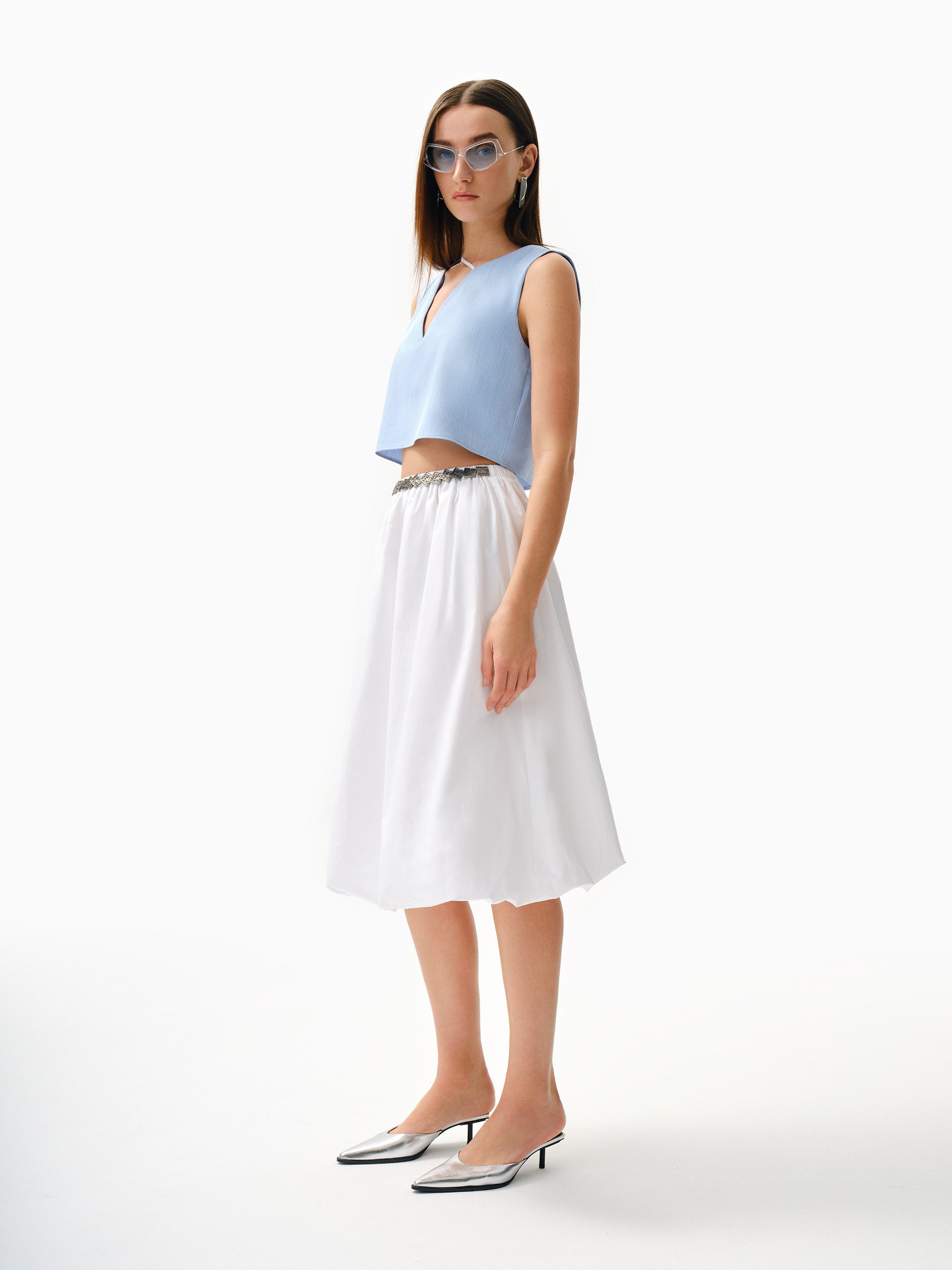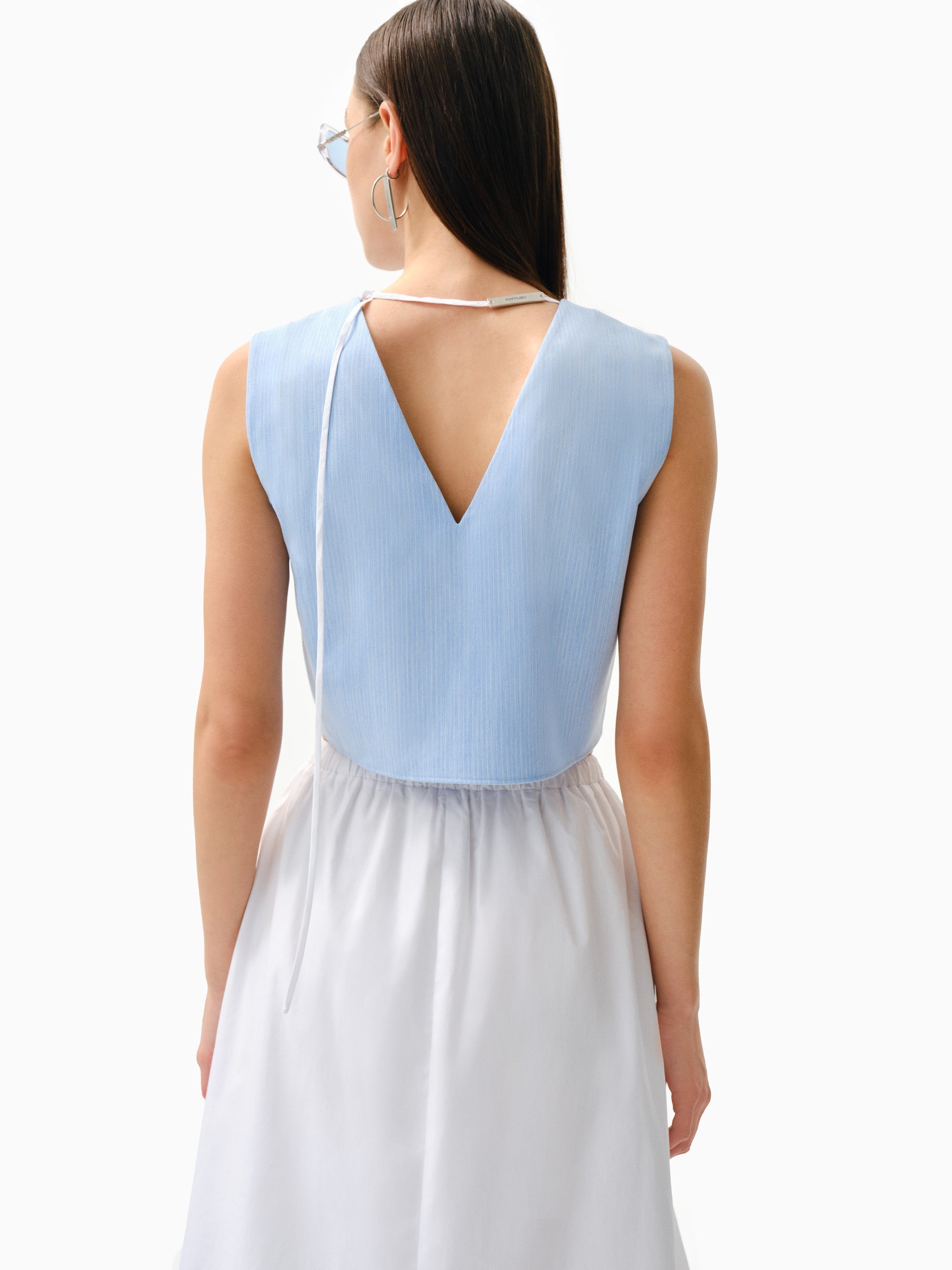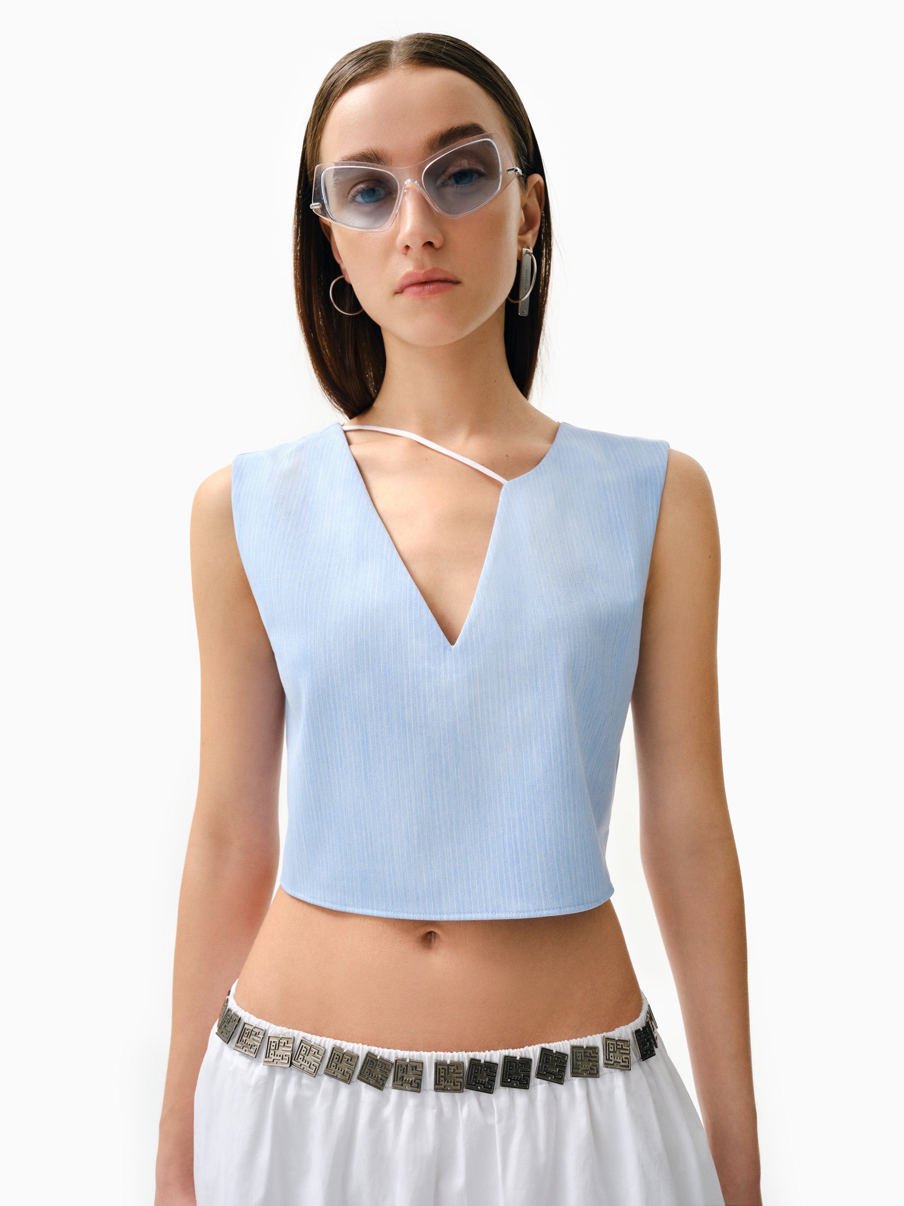 Çizgili mavi kumaş V yaka kolsuz üst. Düğümlü metal plaka detaylı bağcıklı kapama ile kısa boy.