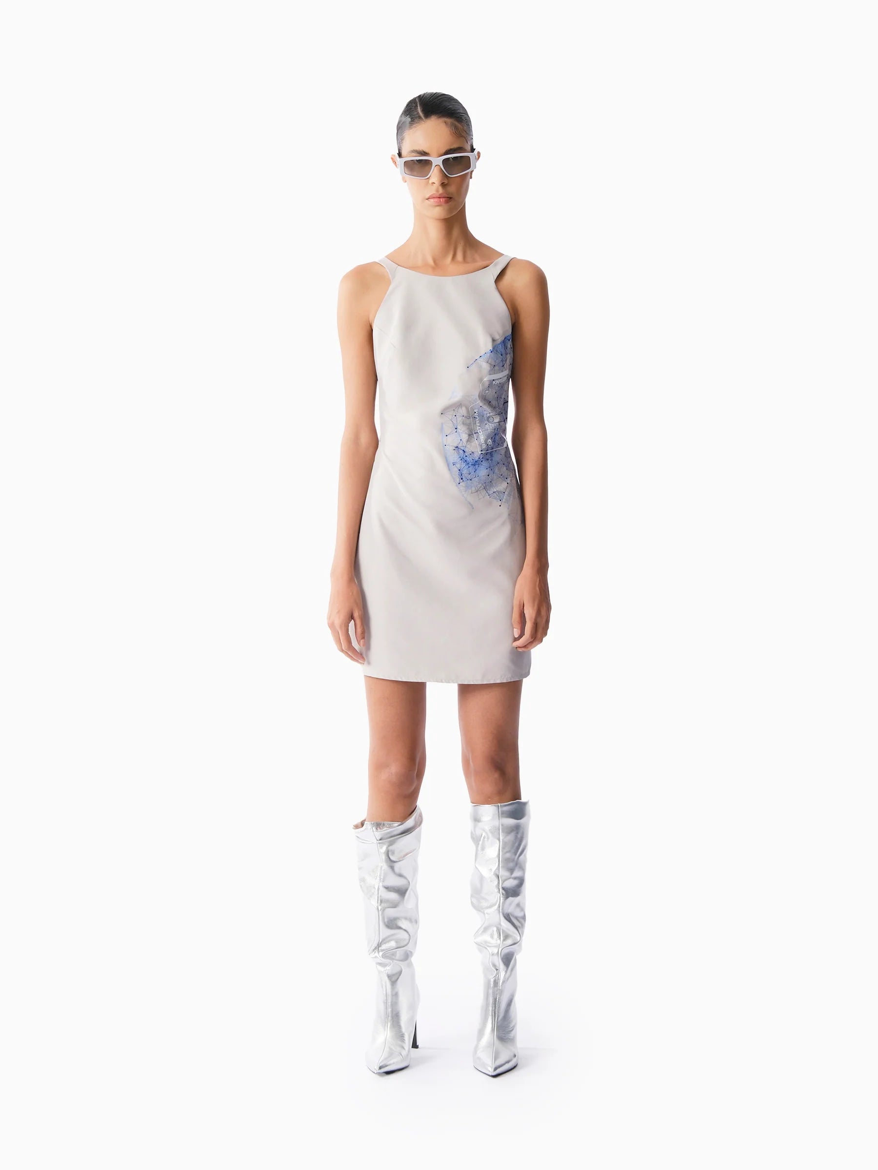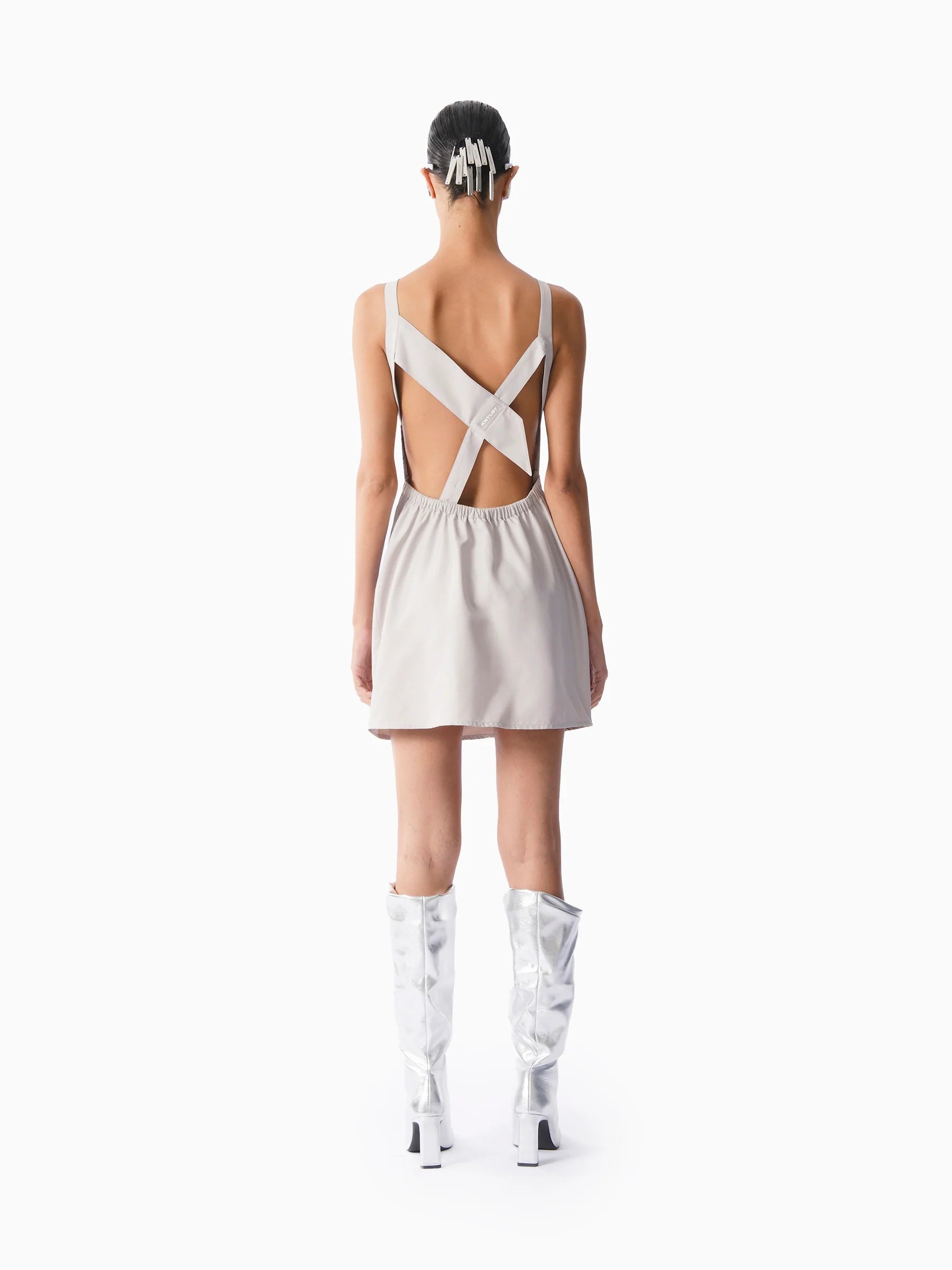 Kolsuz gri mini elbise, yuvarlak yakalı ve önü KNTLGY baskı detaylıdır. Arkadan geçen ince ayarlanabilir kayışlar. Ayarlanabilir düğmeli elastik kemer....
