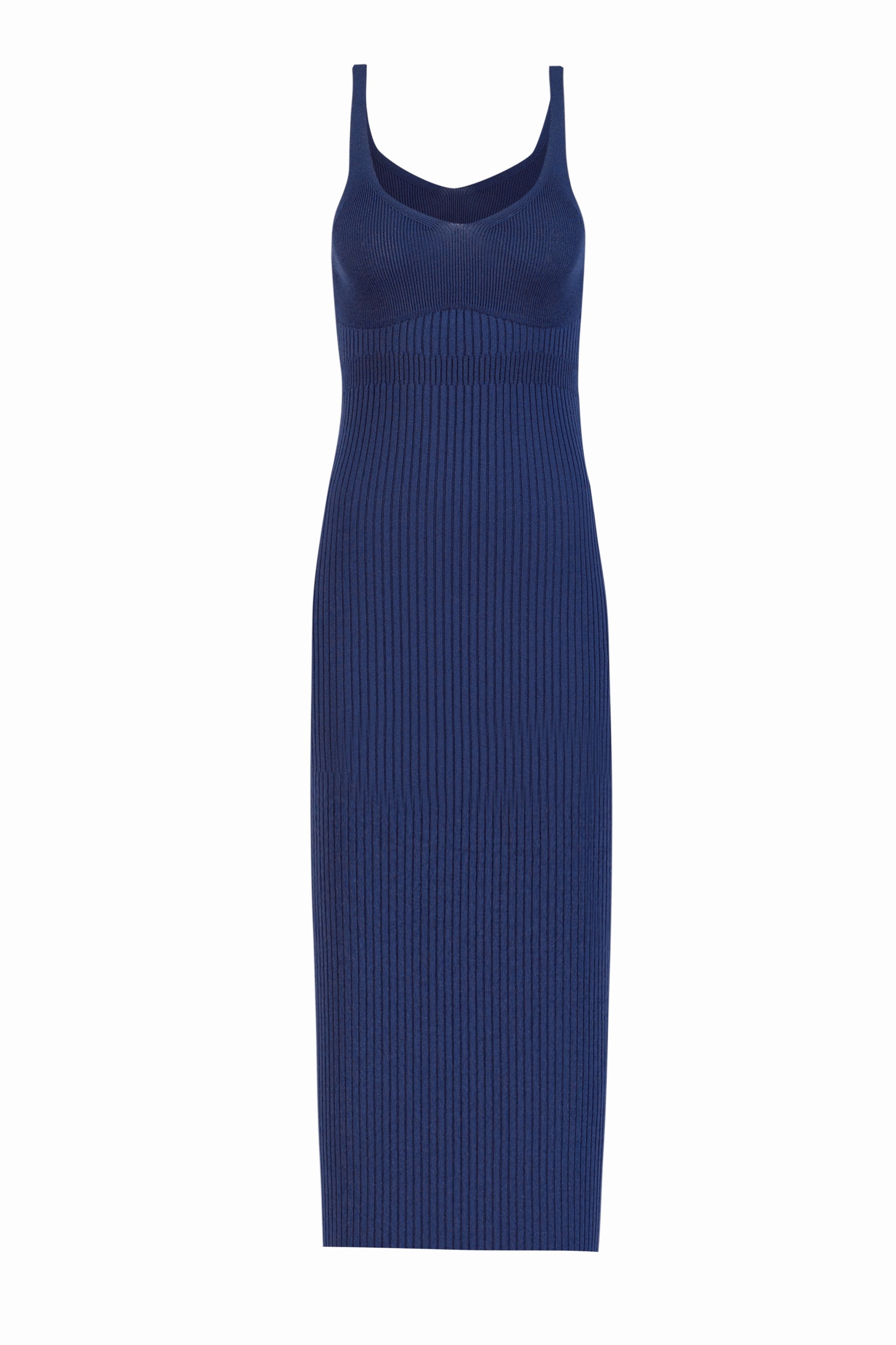 Lacivert Nervürlü Midi Elbise, çok yönlü ve gurur verici bir görünüm için balenli bir tasarıma ve yan yırtmaçlara sahiptir. %57...