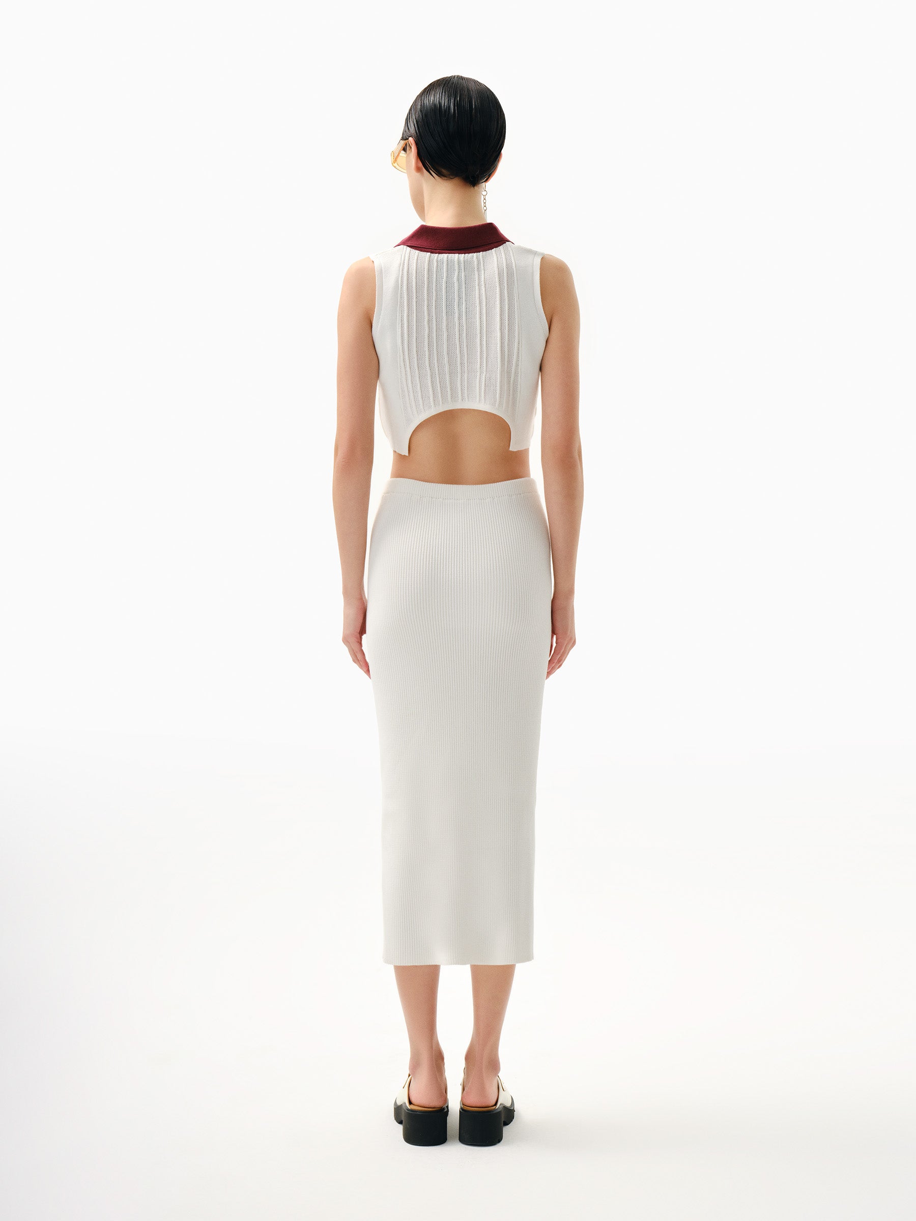 Yarım Düğmeli Bordo Polo Yaka, Yanlarda Ajurlu, Arkada Kesik Detaylı Beyaz Örme Crop Top