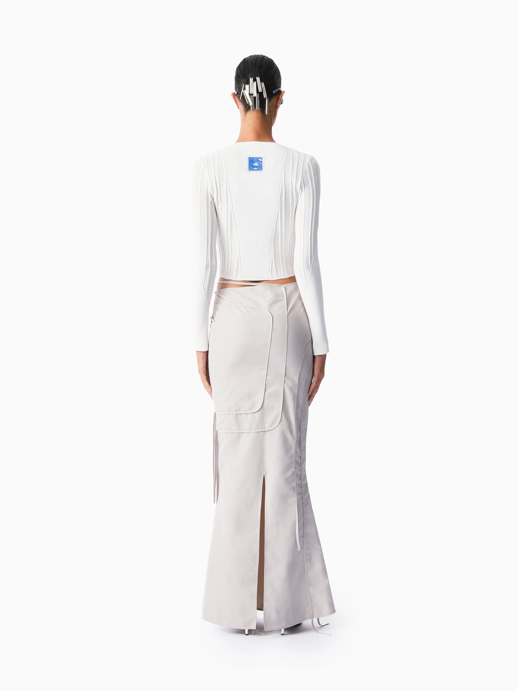 Uzun Kollu, Ajurlu ve Nervürlü Yan Gövde ve Kollu Mavi KNTLGY Logolu Beyaz Örme Üst Lastik Yama