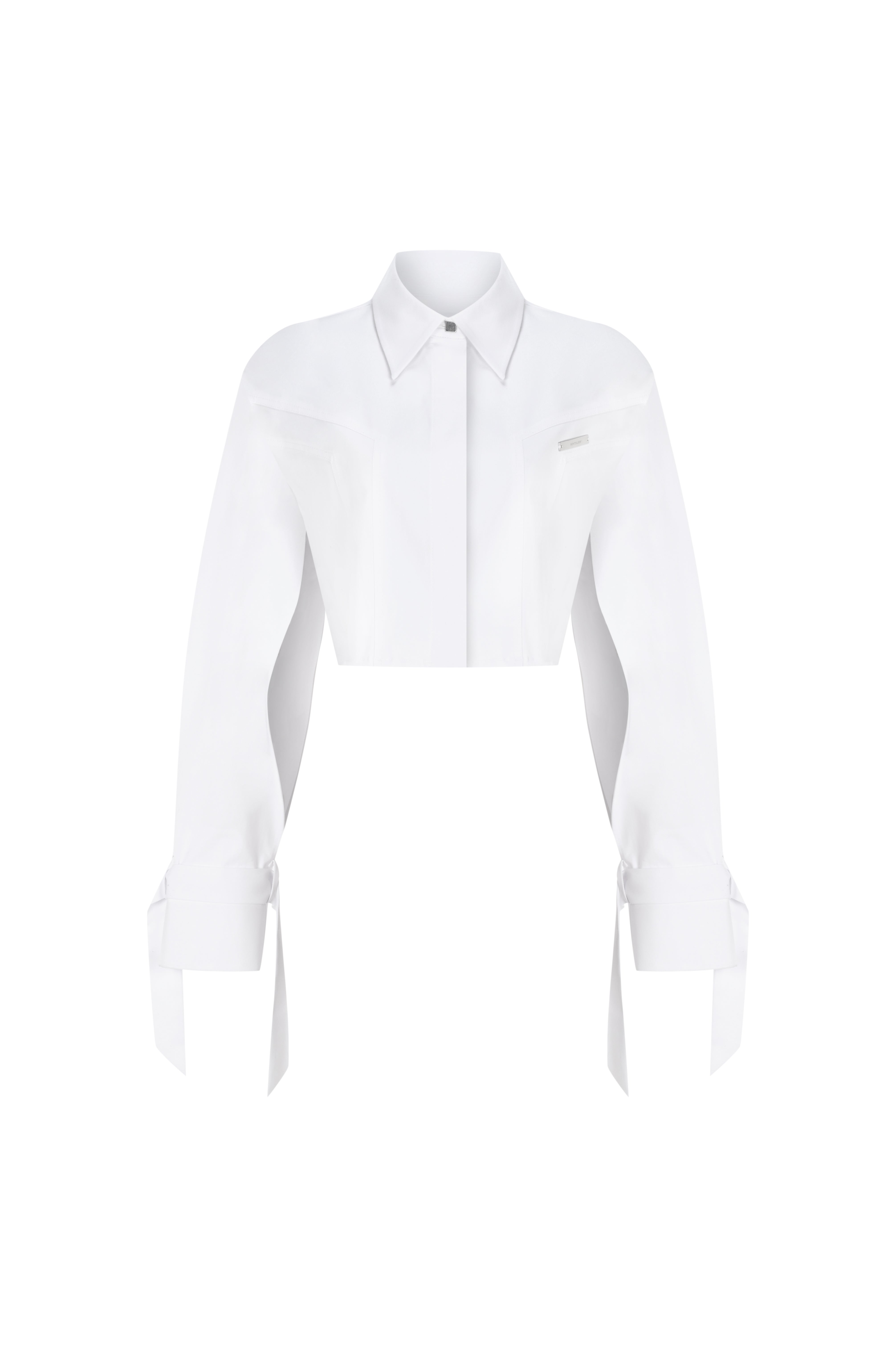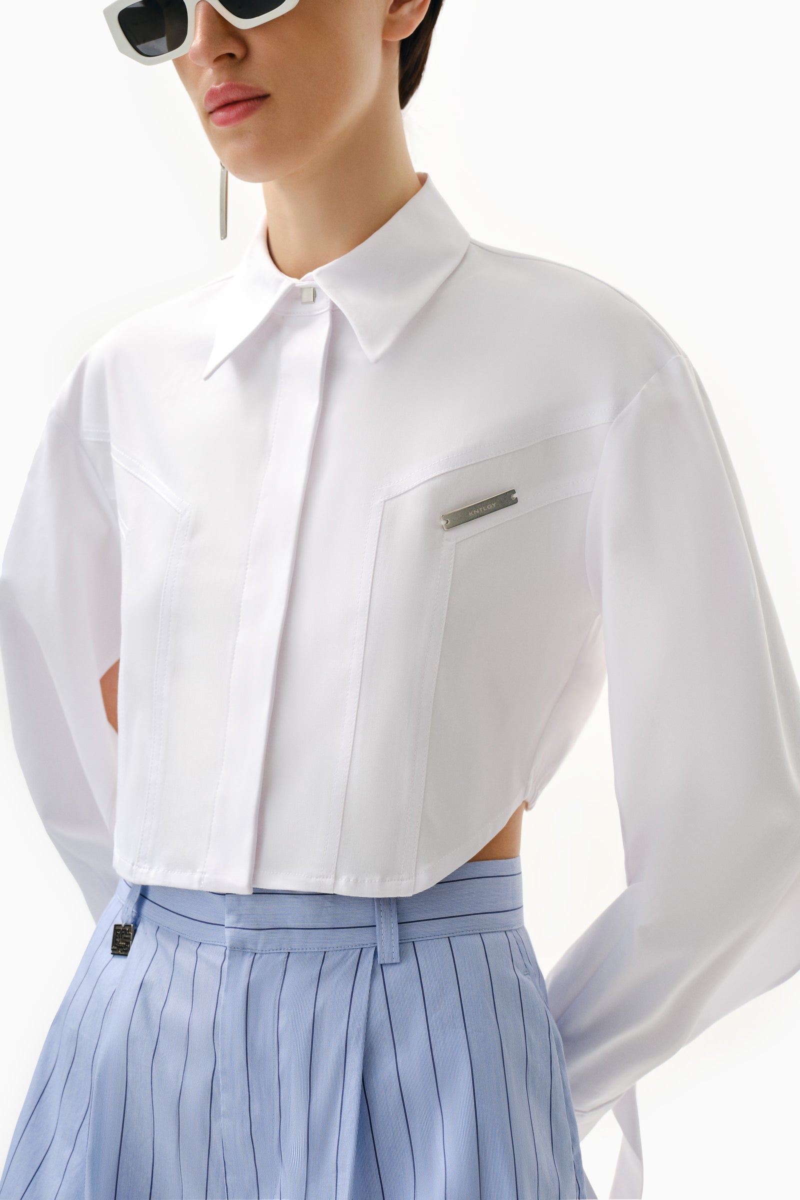 KNTLGY Beyaz Dokuma Crop Gömlek tamamen gelecekle ilgili. Hafif ve havadar tasarımı, benzersiz bir desen, asimetrik kesim, metal logo detayı ve açık kol detayı sergiliyor.