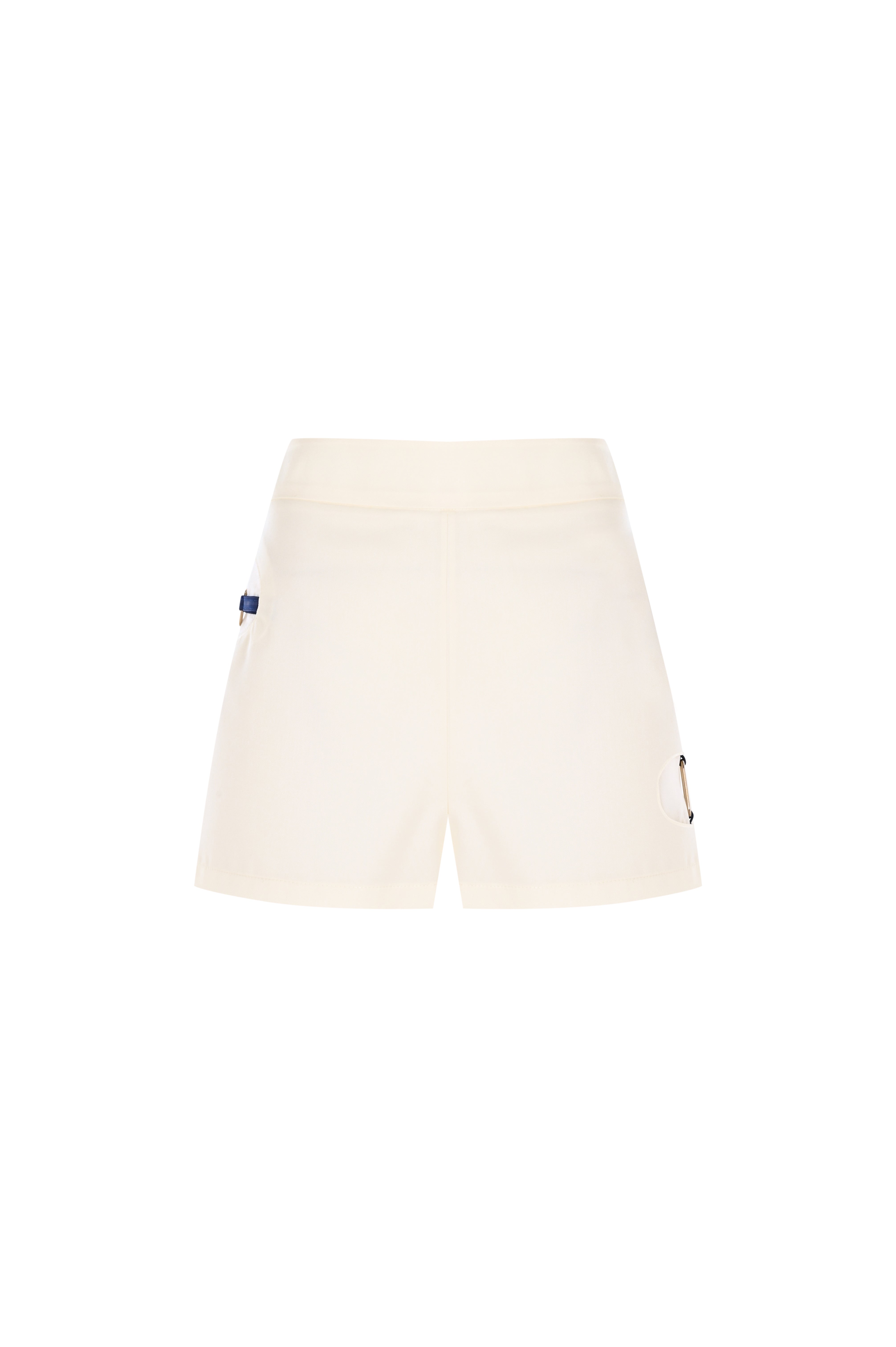 Ekru Gabardin Mini Şort, her iki bacakta asimetrik bir kesik detayı ve parıldayan açık altın metal vurgulara sahip lacivert Saten bir banda sahiptir. Daha fazla boyut için üzerinde bir organze katman bulunur.