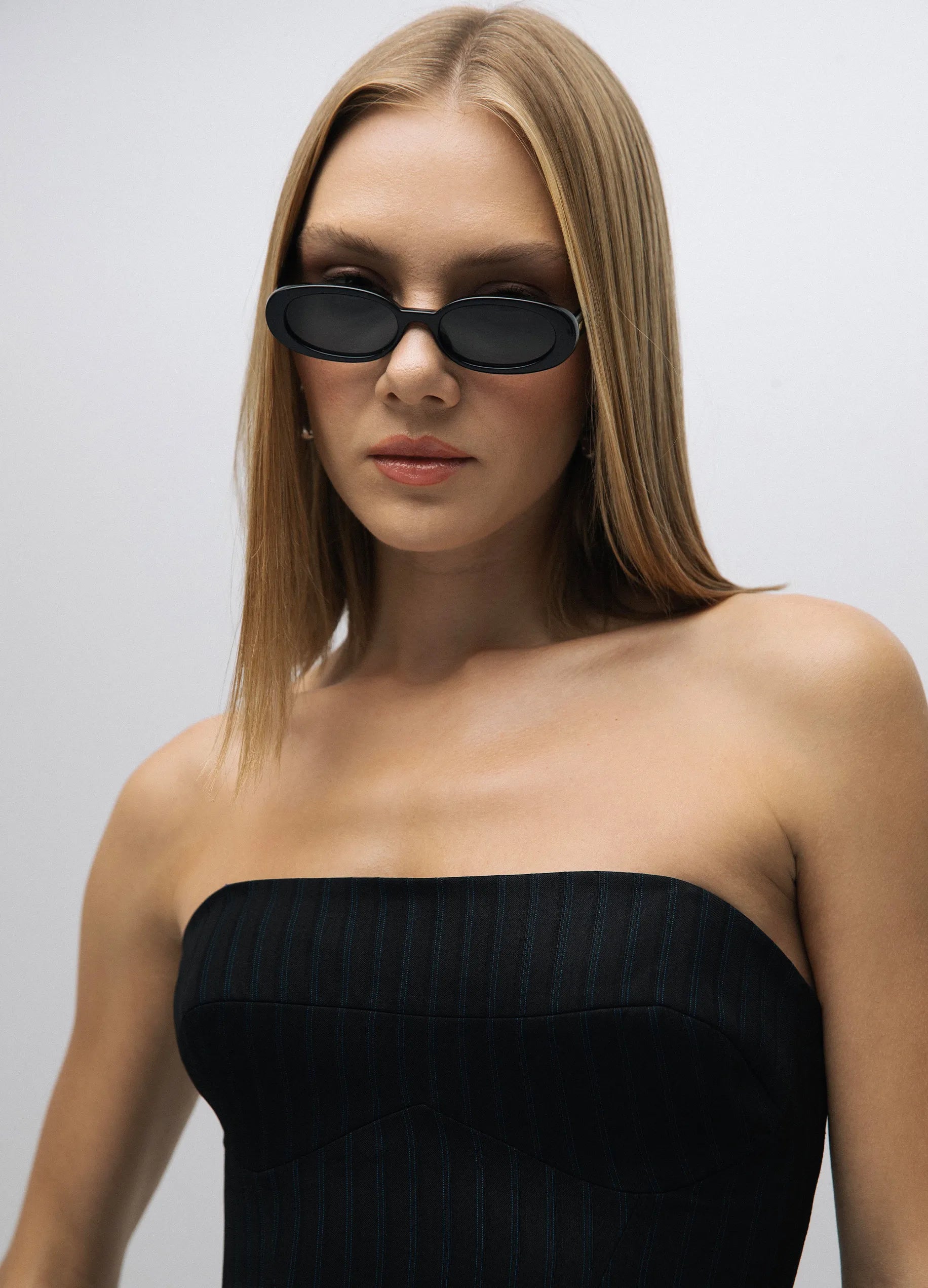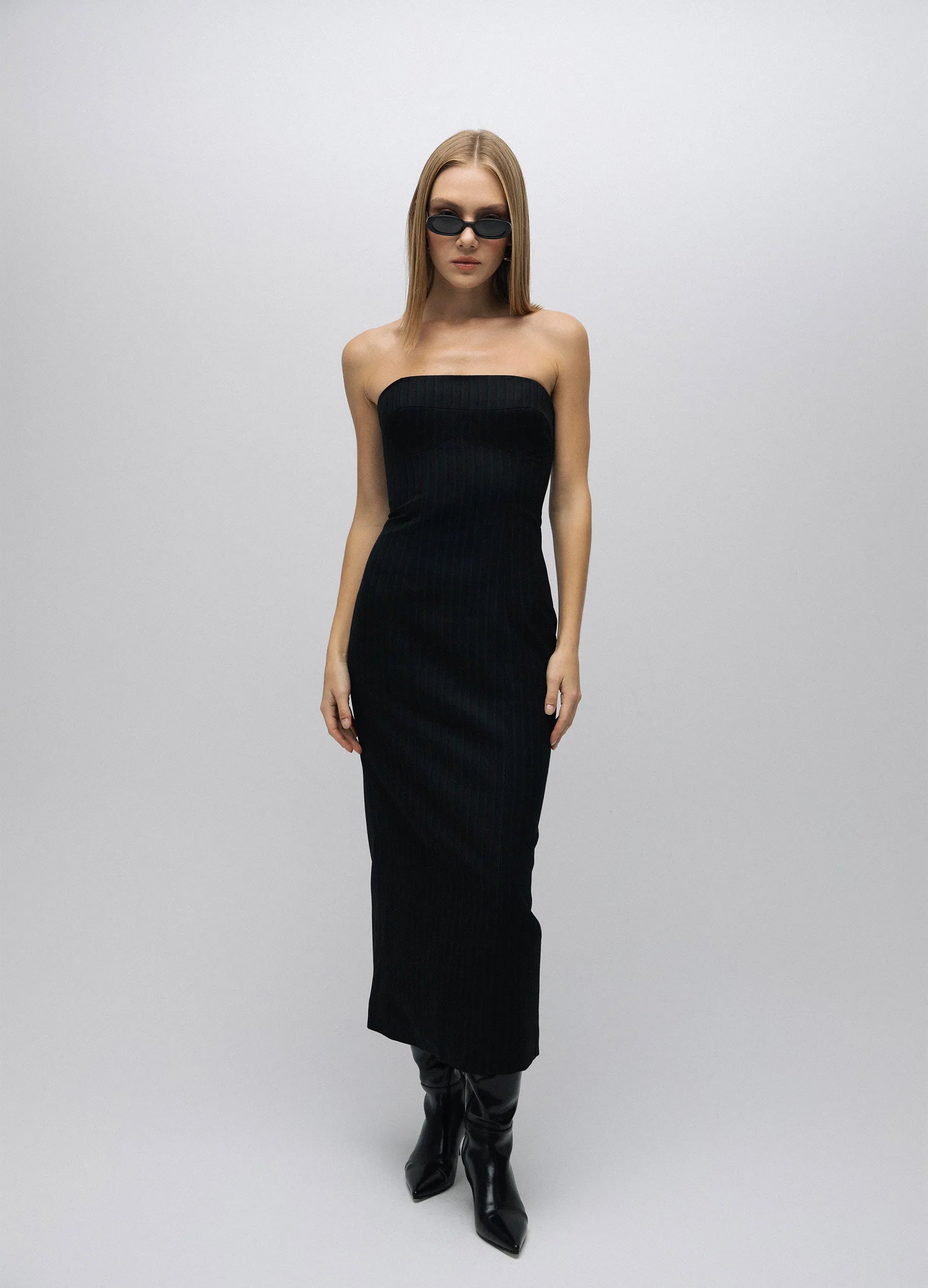 Strapless midi dress draws attention with its lace-up detail and zippered slit at the back. Its thin striped texture adds a touch of flair to the design, while its fitted cut offers a feminine silhouette.