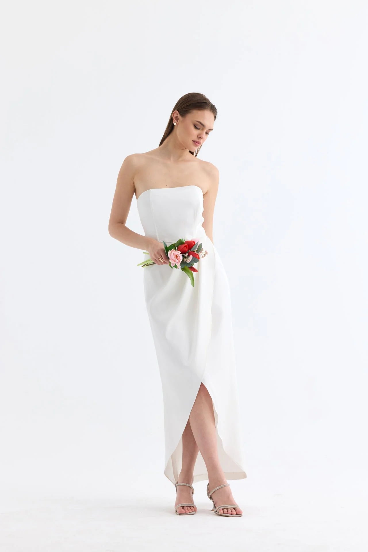 Manshet Bloom / Straplez Midi Boy Abiye (Beyaz)